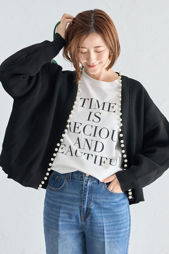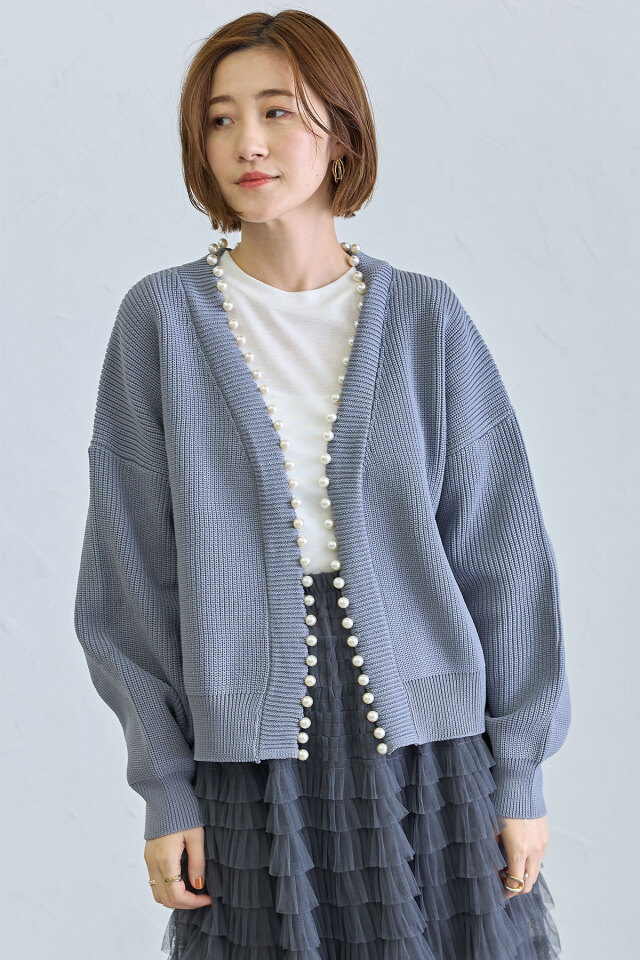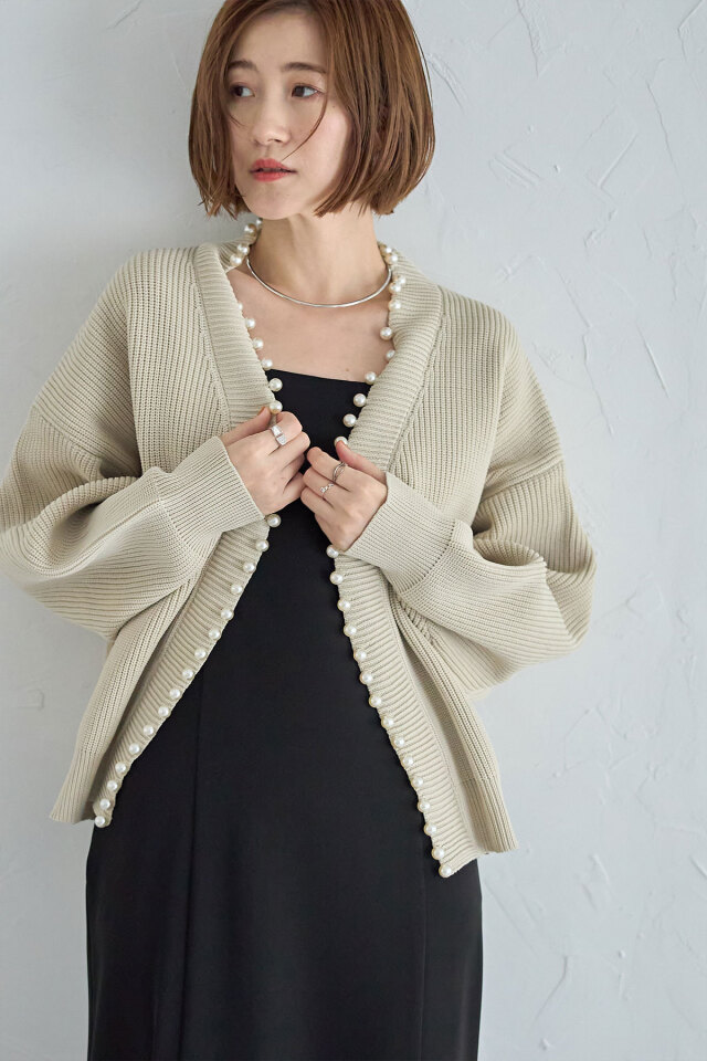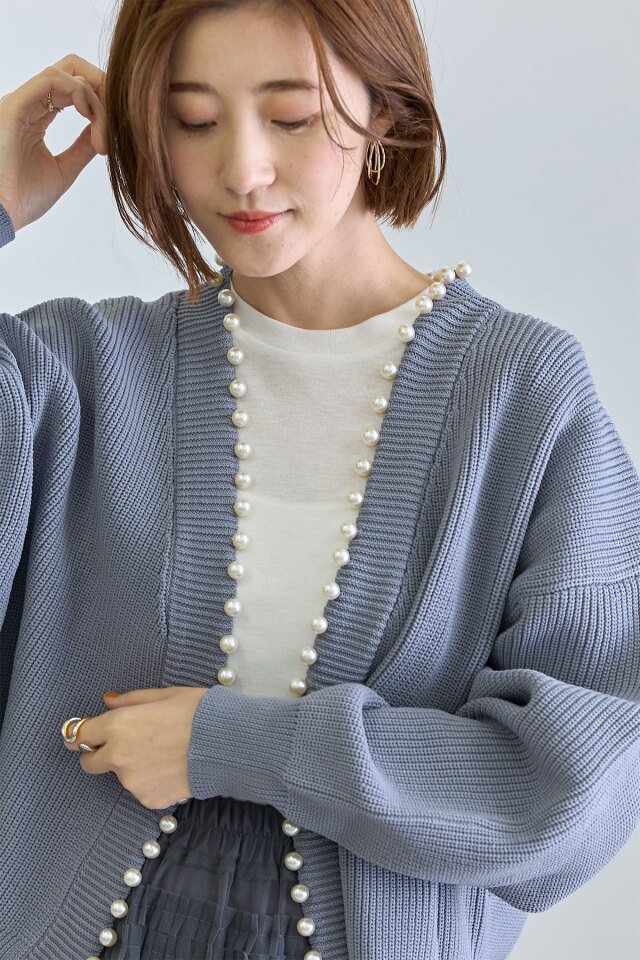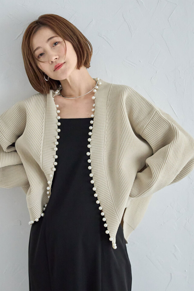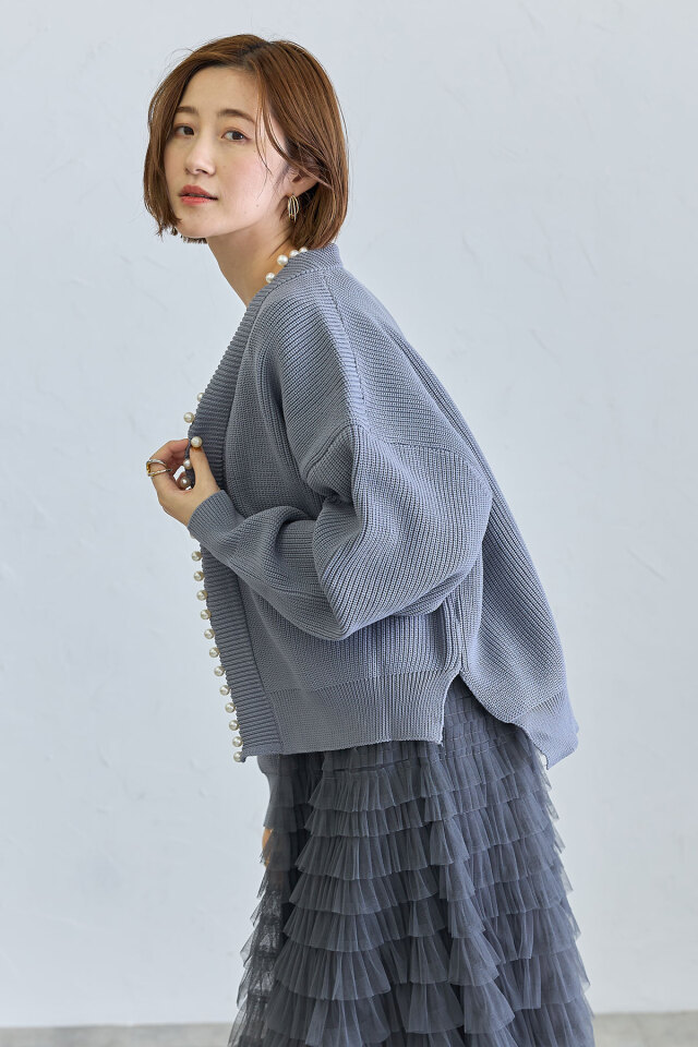 パール釦がコーデに華やかさをプラスする、パール釦ダンボールカーディガン