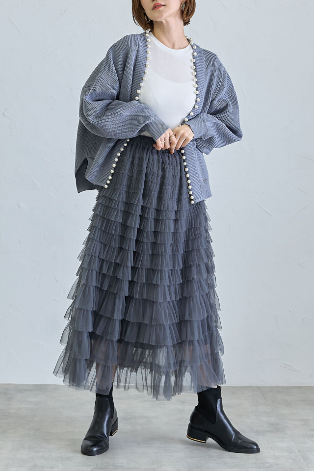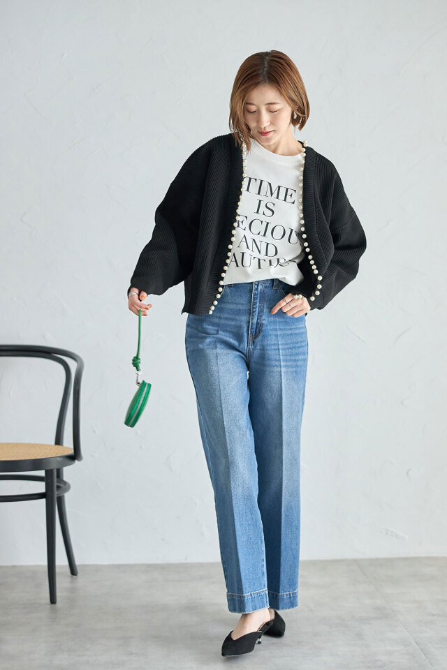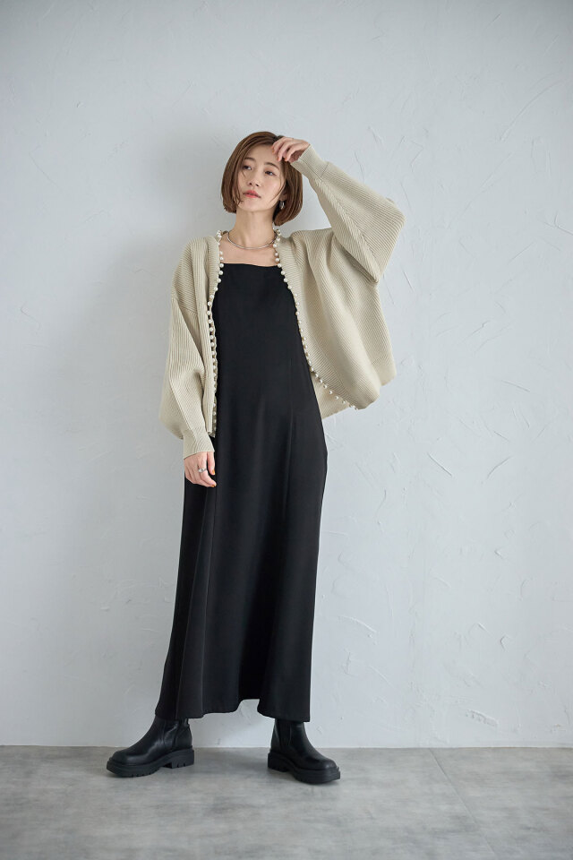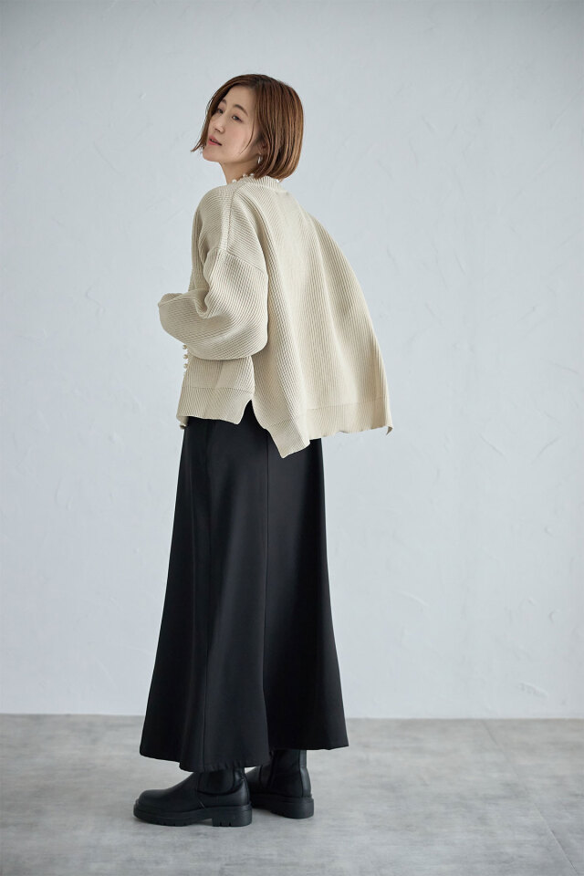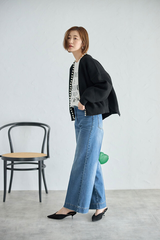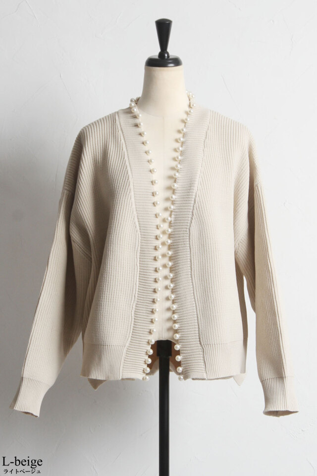 パール釦がコーデに華やかさをプラスする、パール釦ダンボールカーディガン