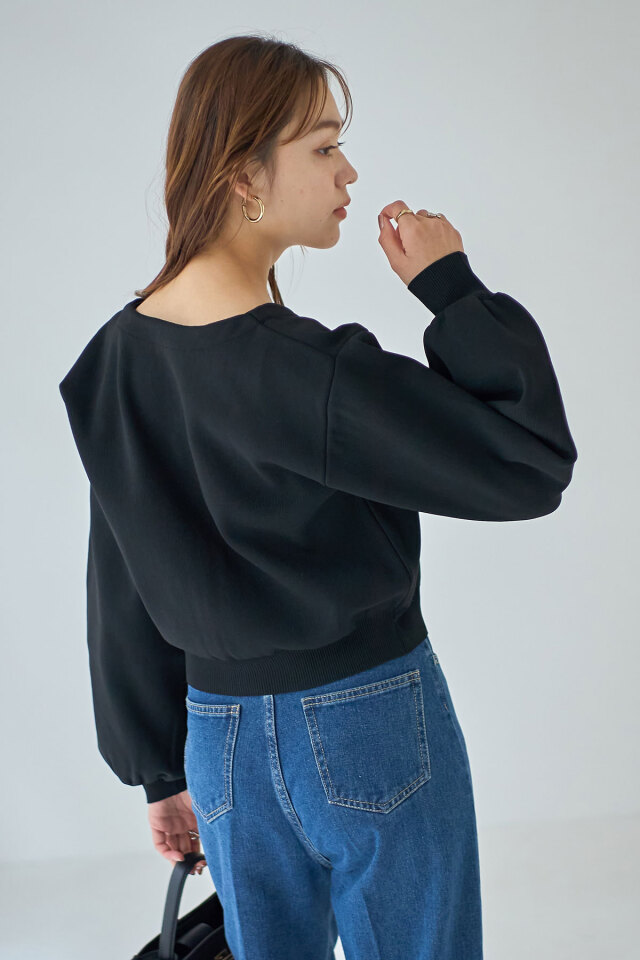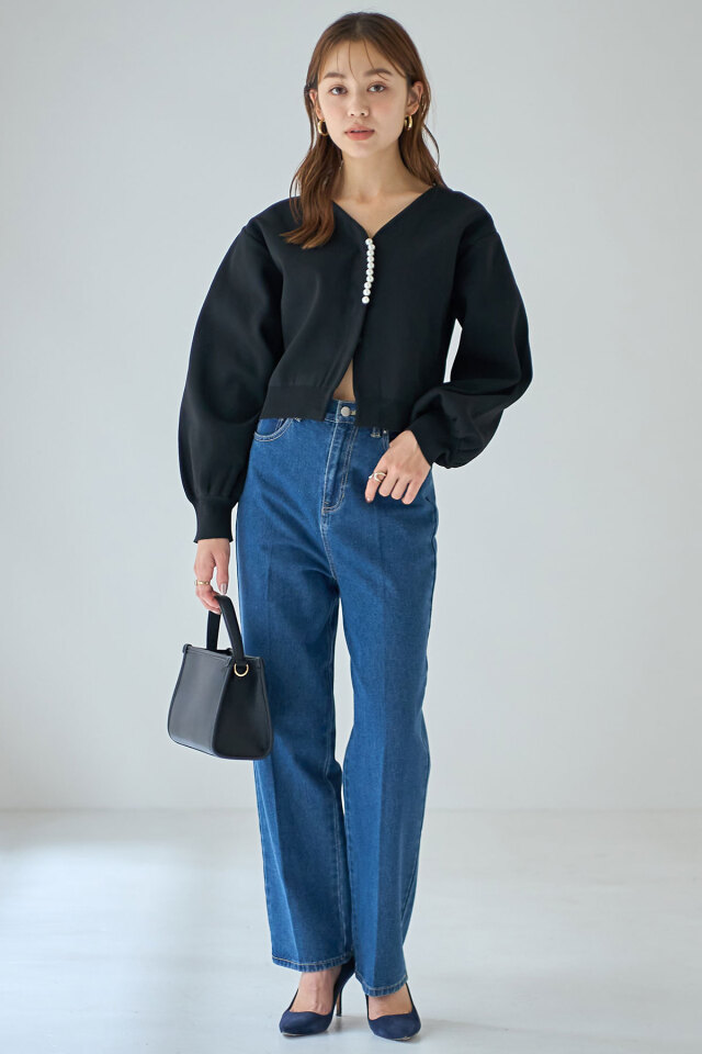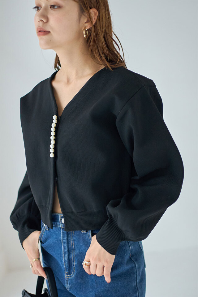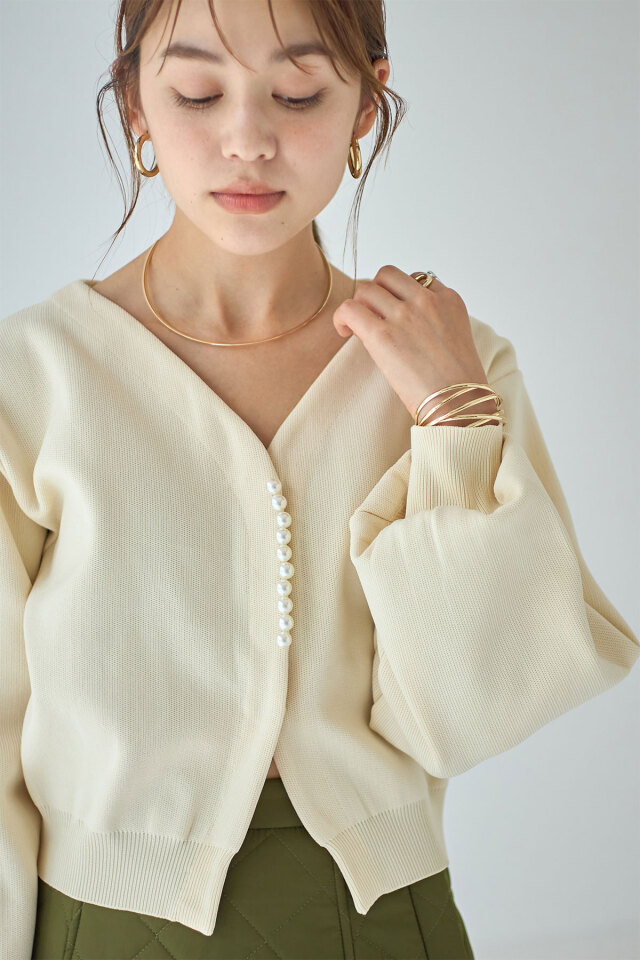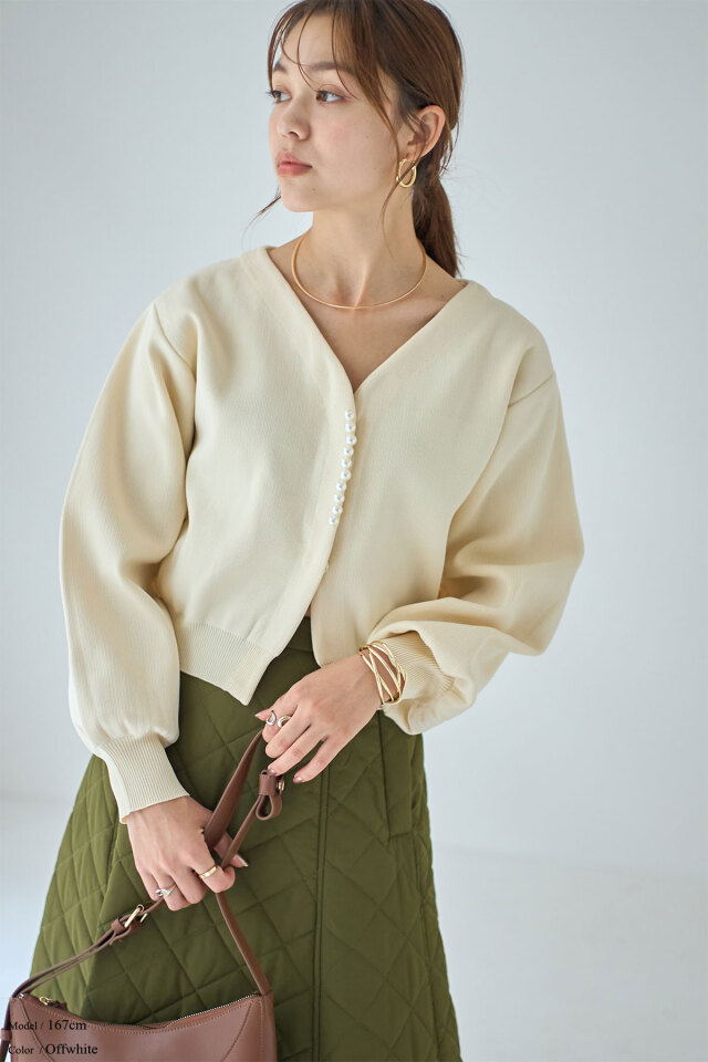 パールビジューでエレガンスに飾り立てたクロップド丈カーディガン。ボリューム袖で気になる二の腕ラインをカバーしつつ、やや深めのVネックラインがスッキリとした顔まわり&美デコルテ見せが叶うアイテム。