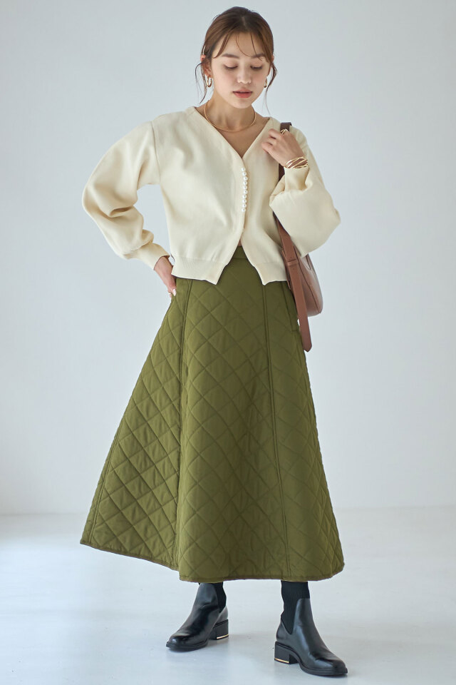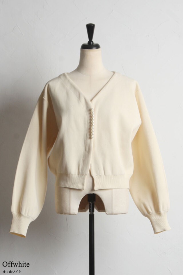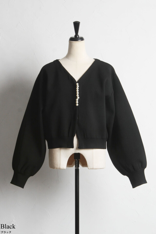 女性らしい柔らかな印象を与えてくれるラインパールボリュームスリーブカーディガン