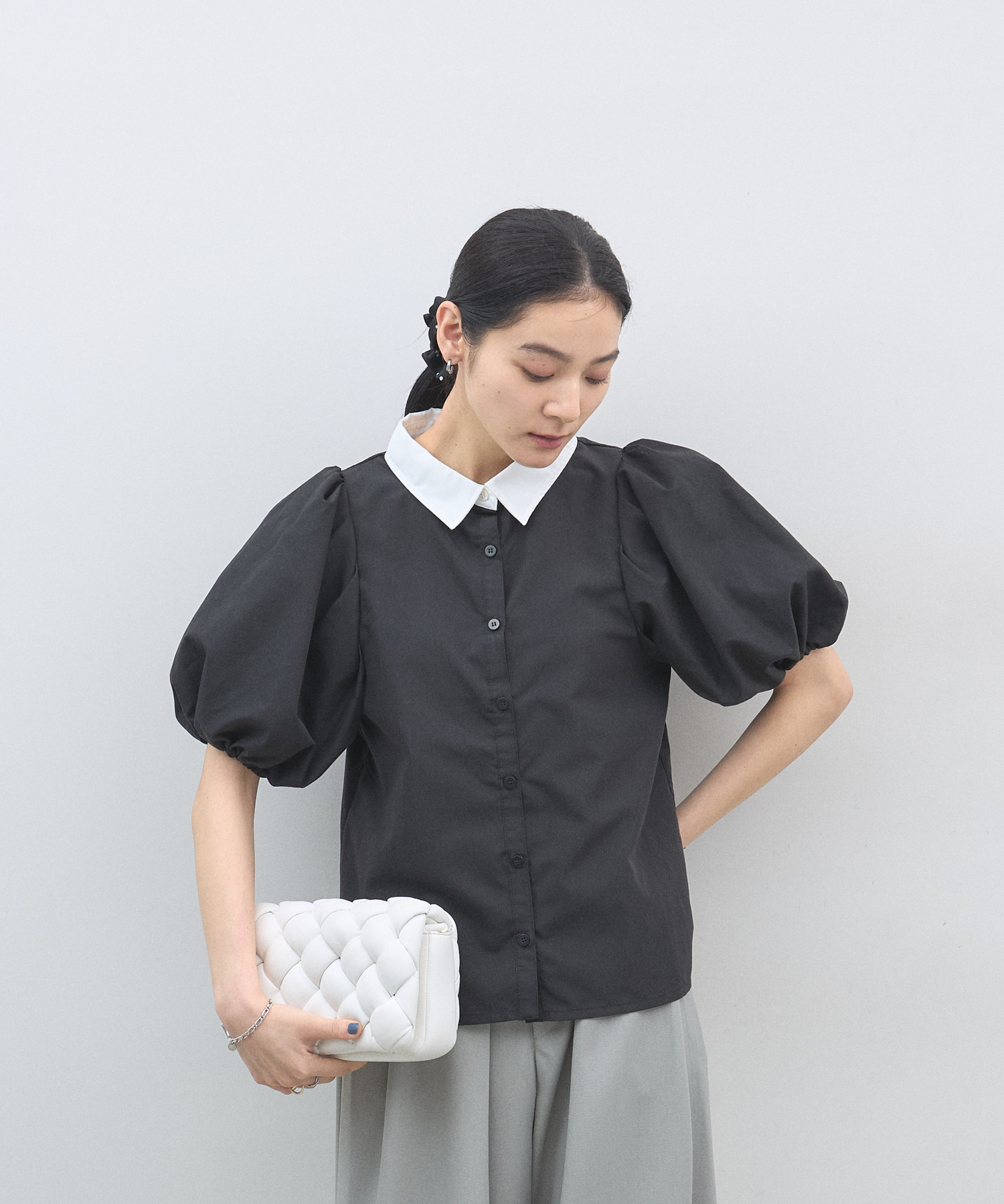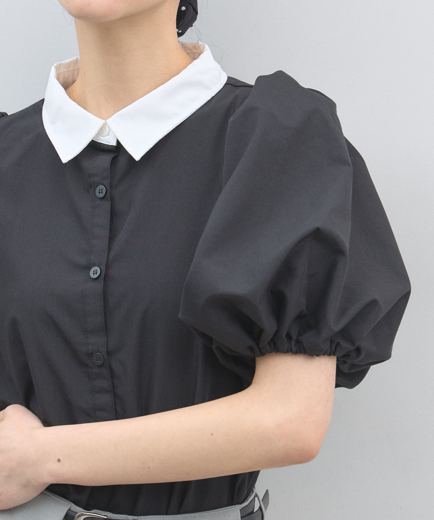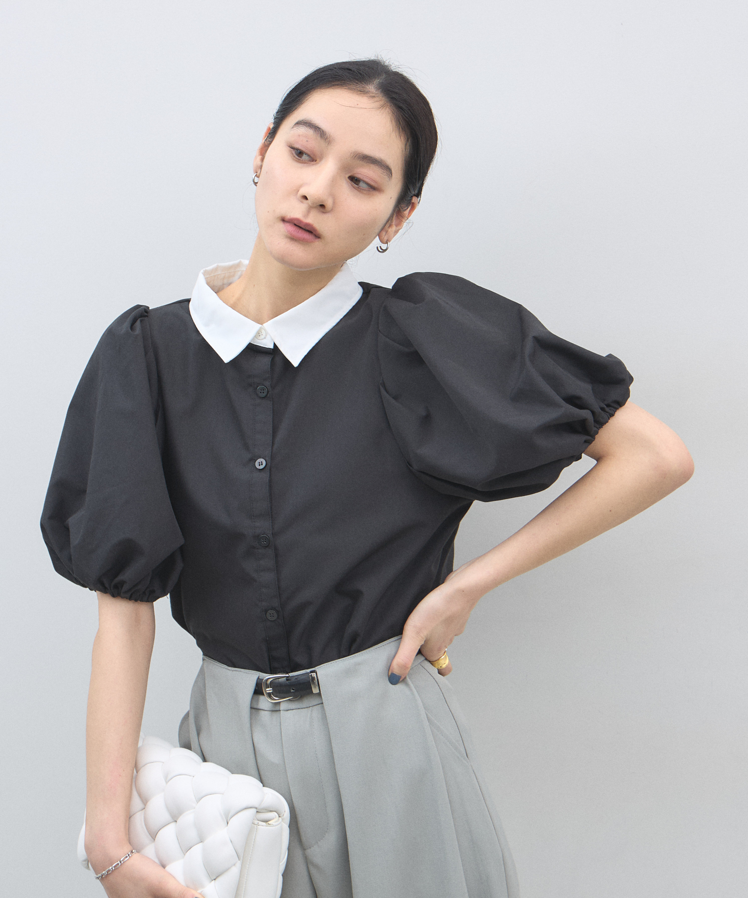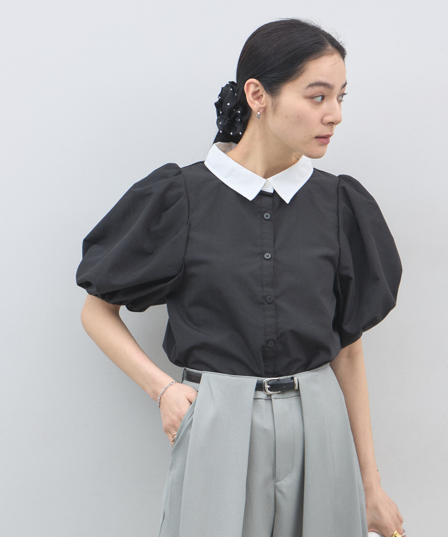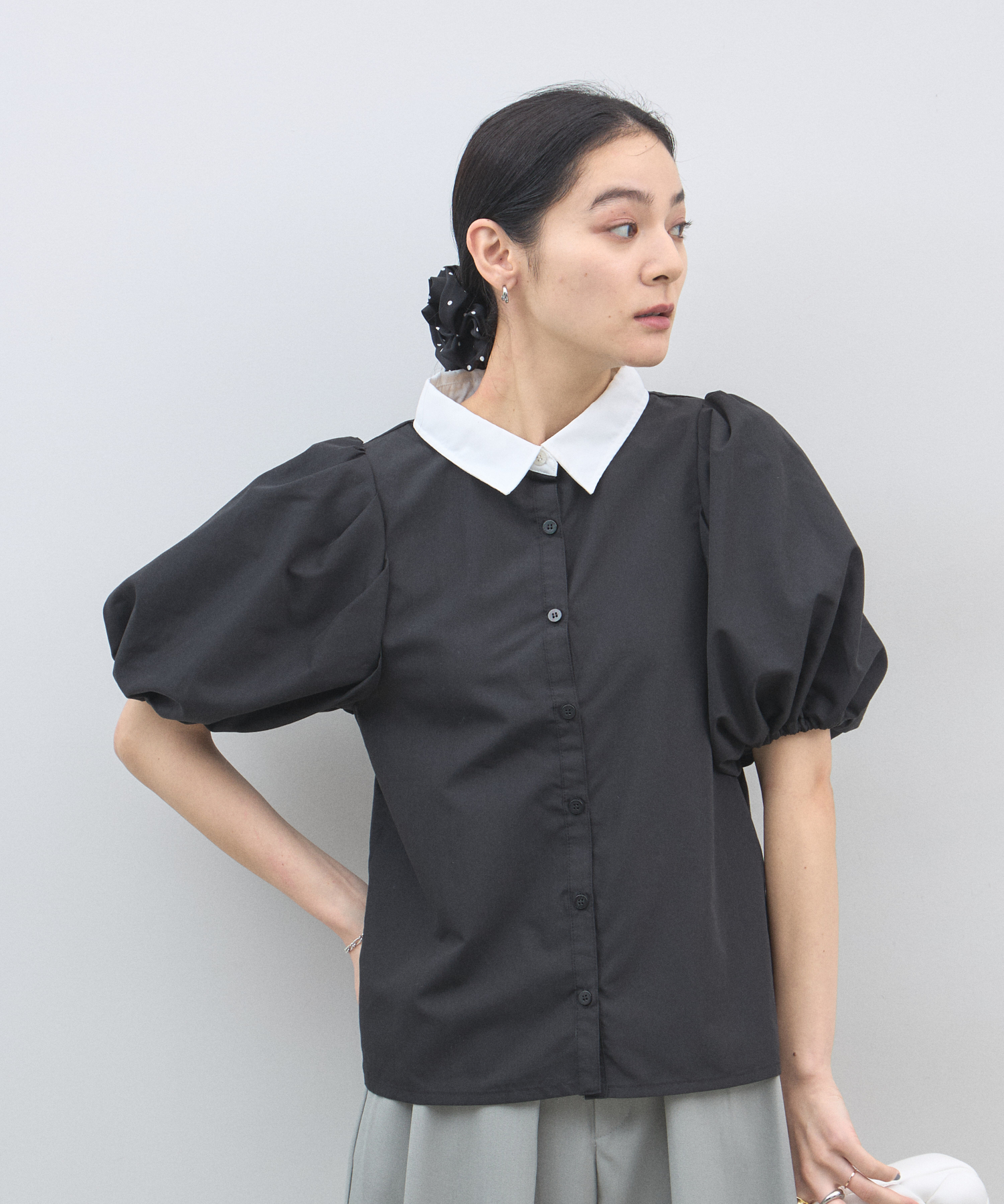 清潔感のある襟と、ボリュームたっぷりのパフスリーブが目を惹く大人可愛い一枚です。