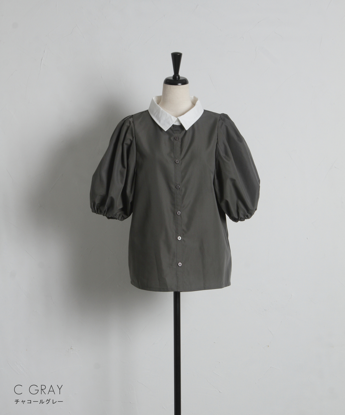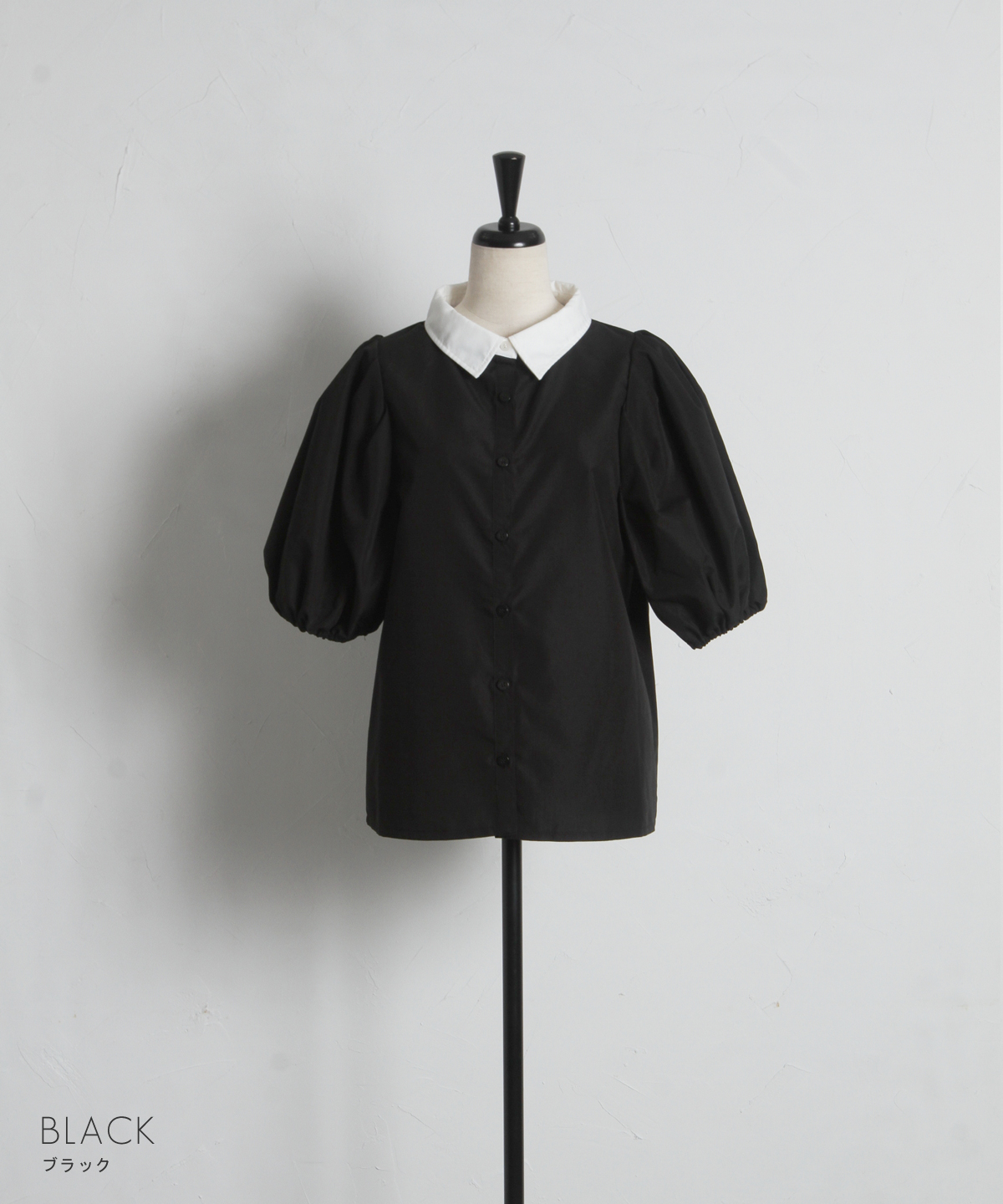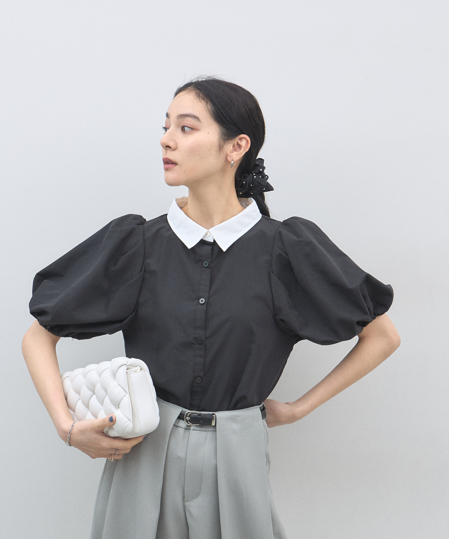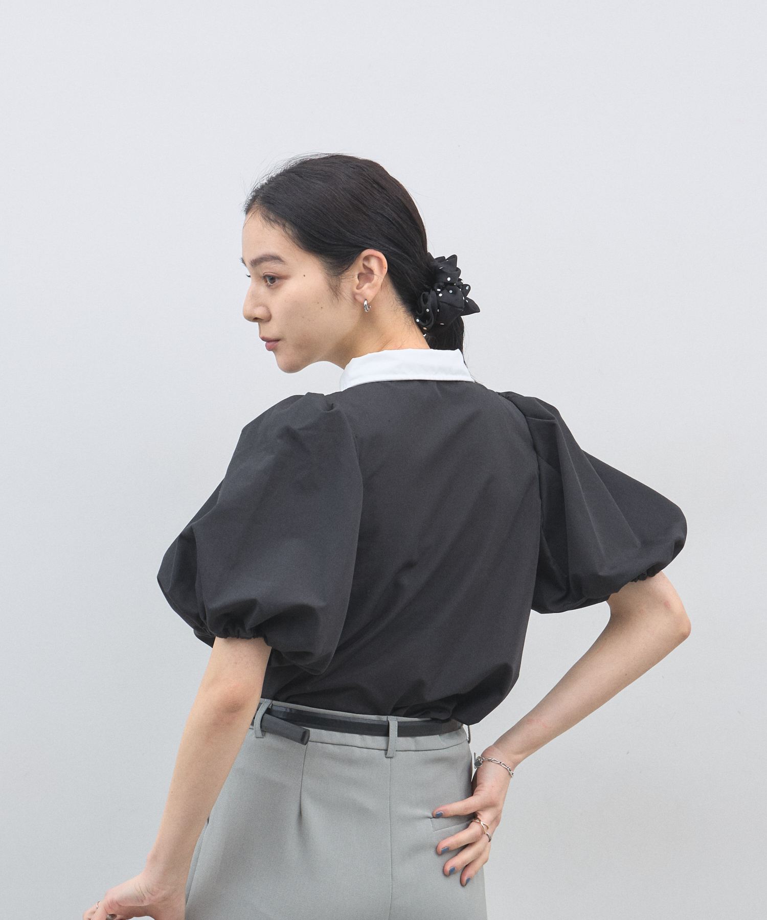 清潔感のある襟と、ボリュームたっぷりのパフスリーブが目を惹く大人可愛い一枚です。