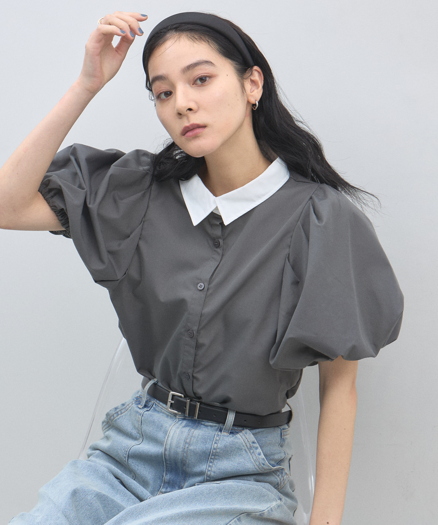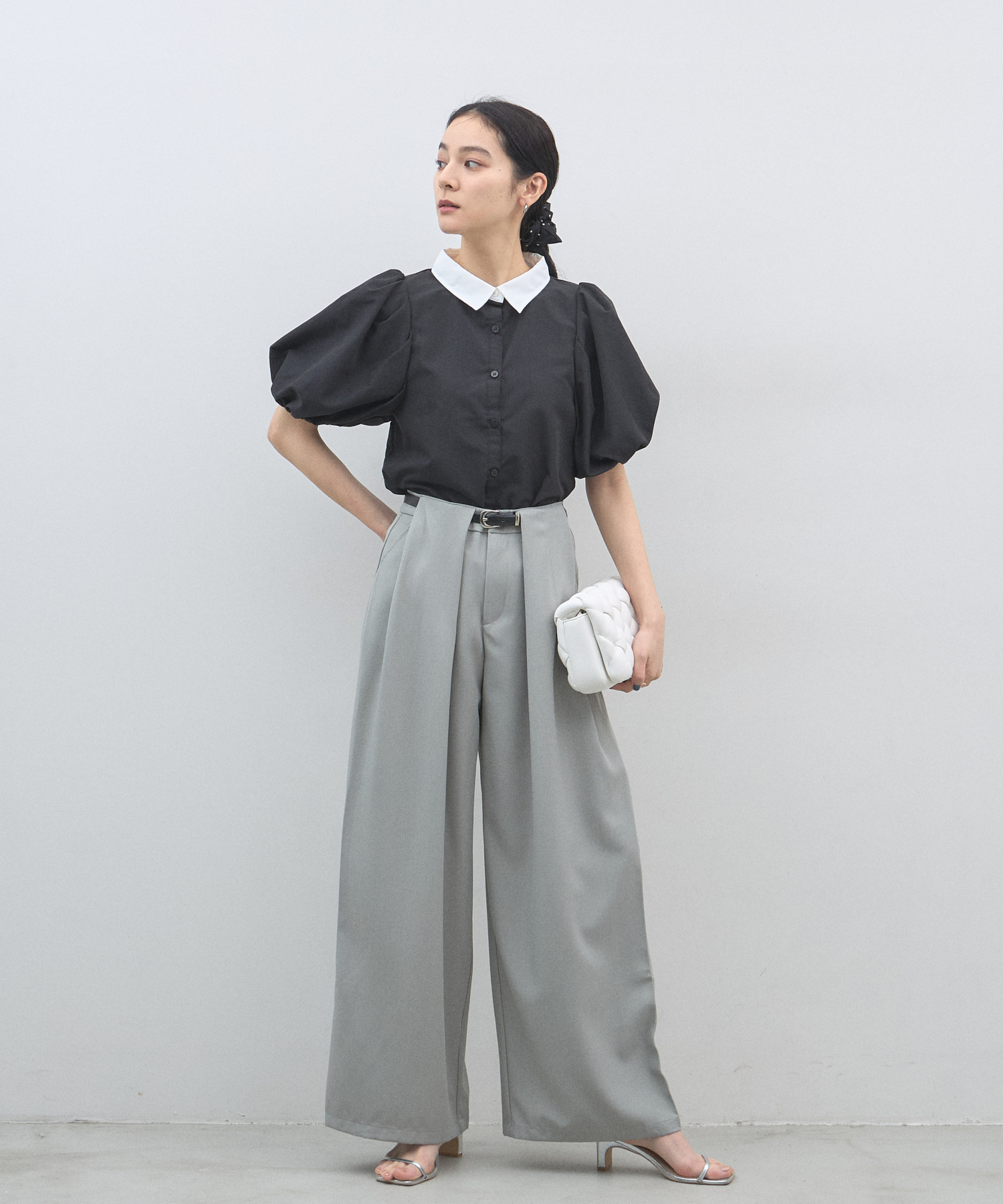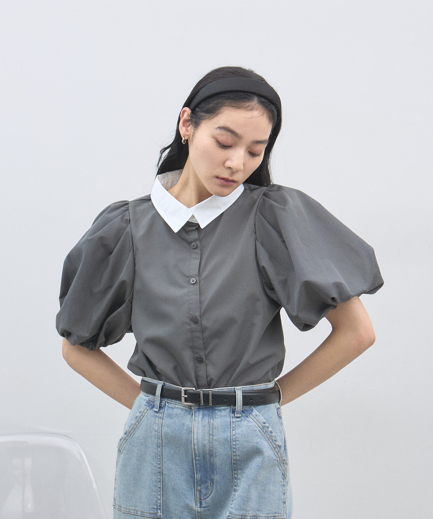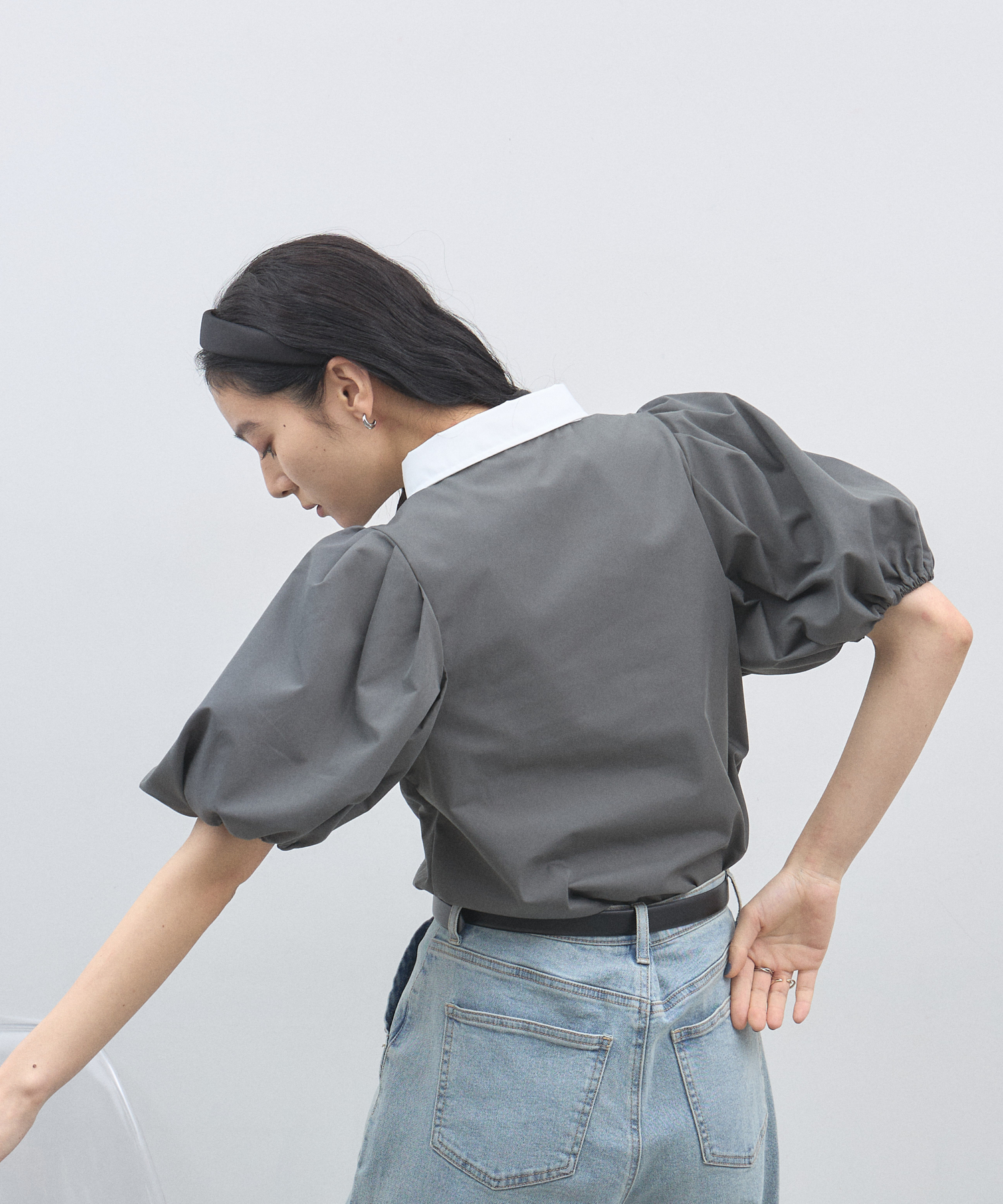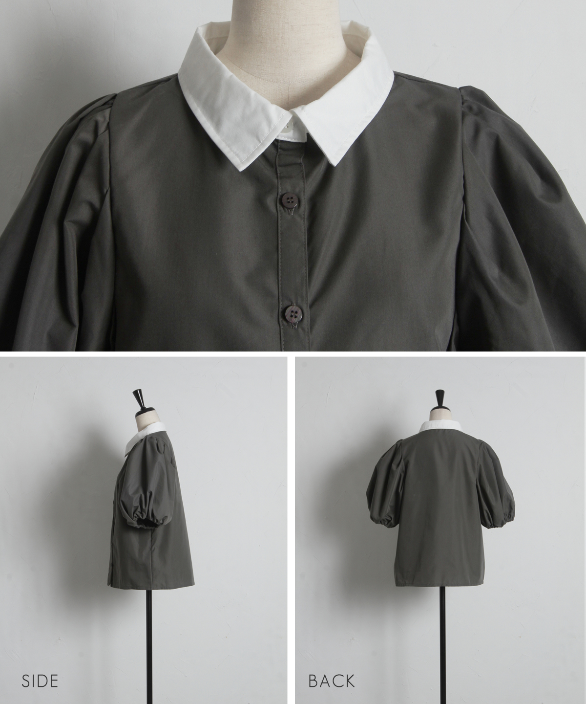 清潔感のある襟と、ボリュームたっぷりのパフスリーブが目を惹く大人可愛い一枚です。