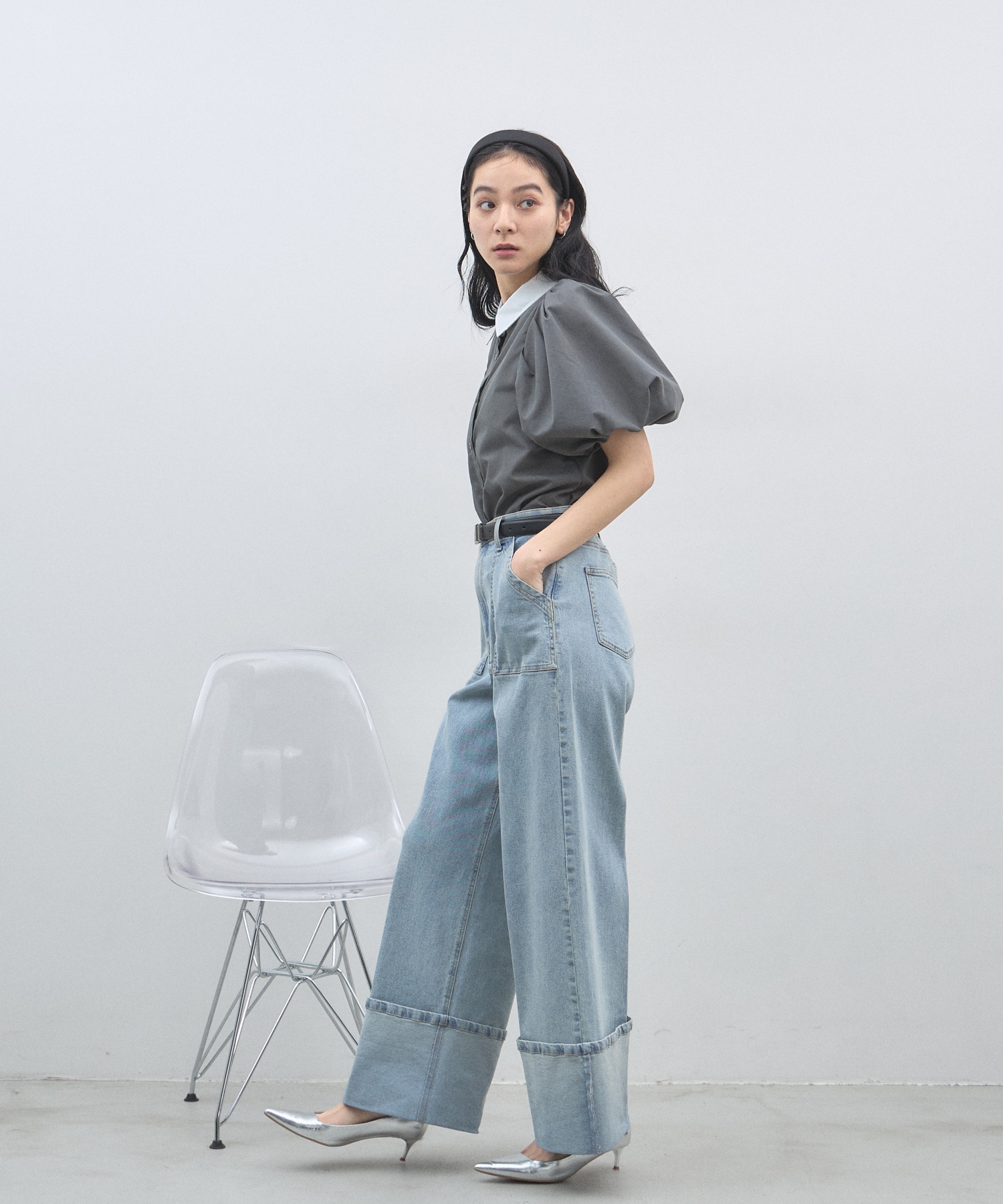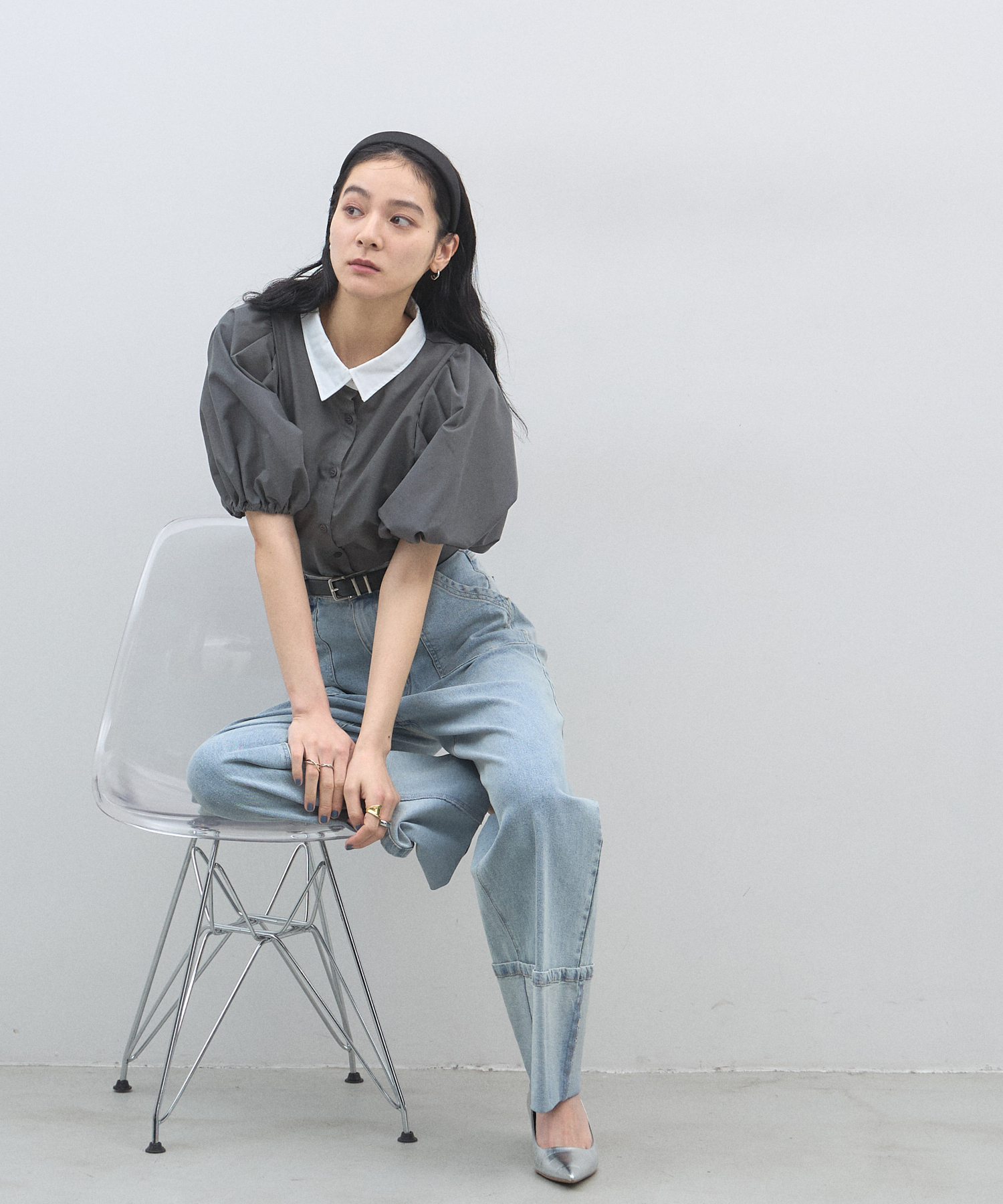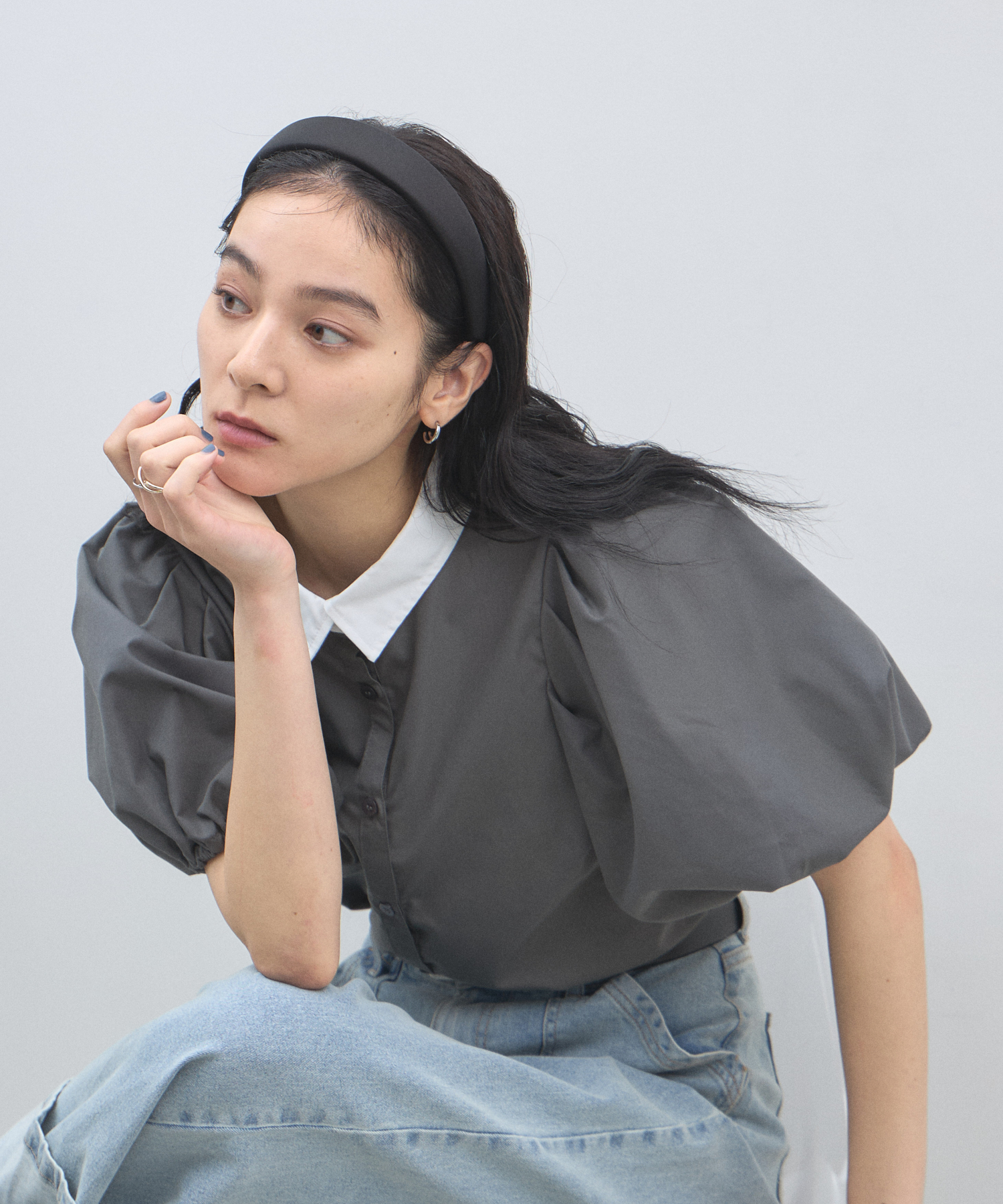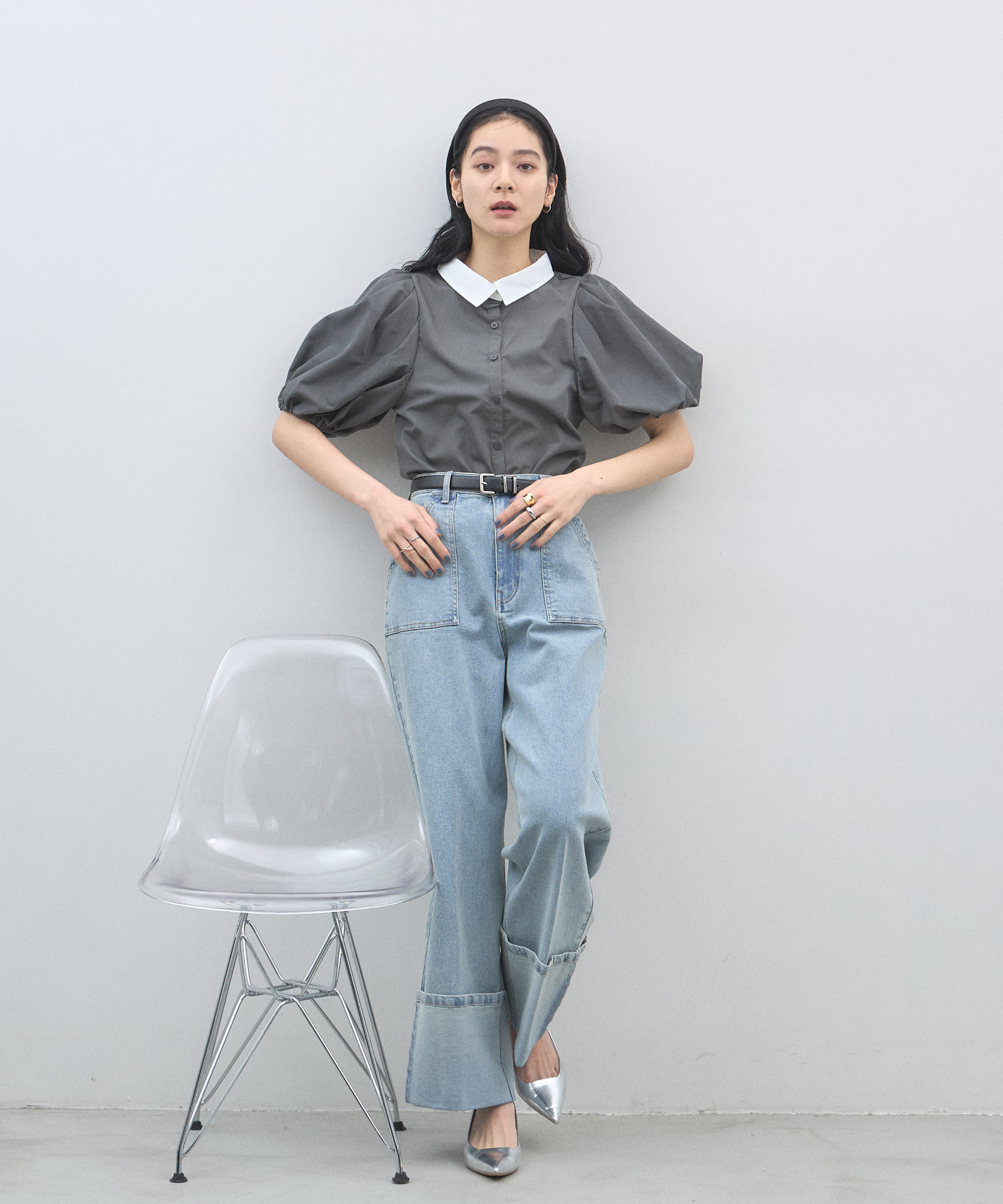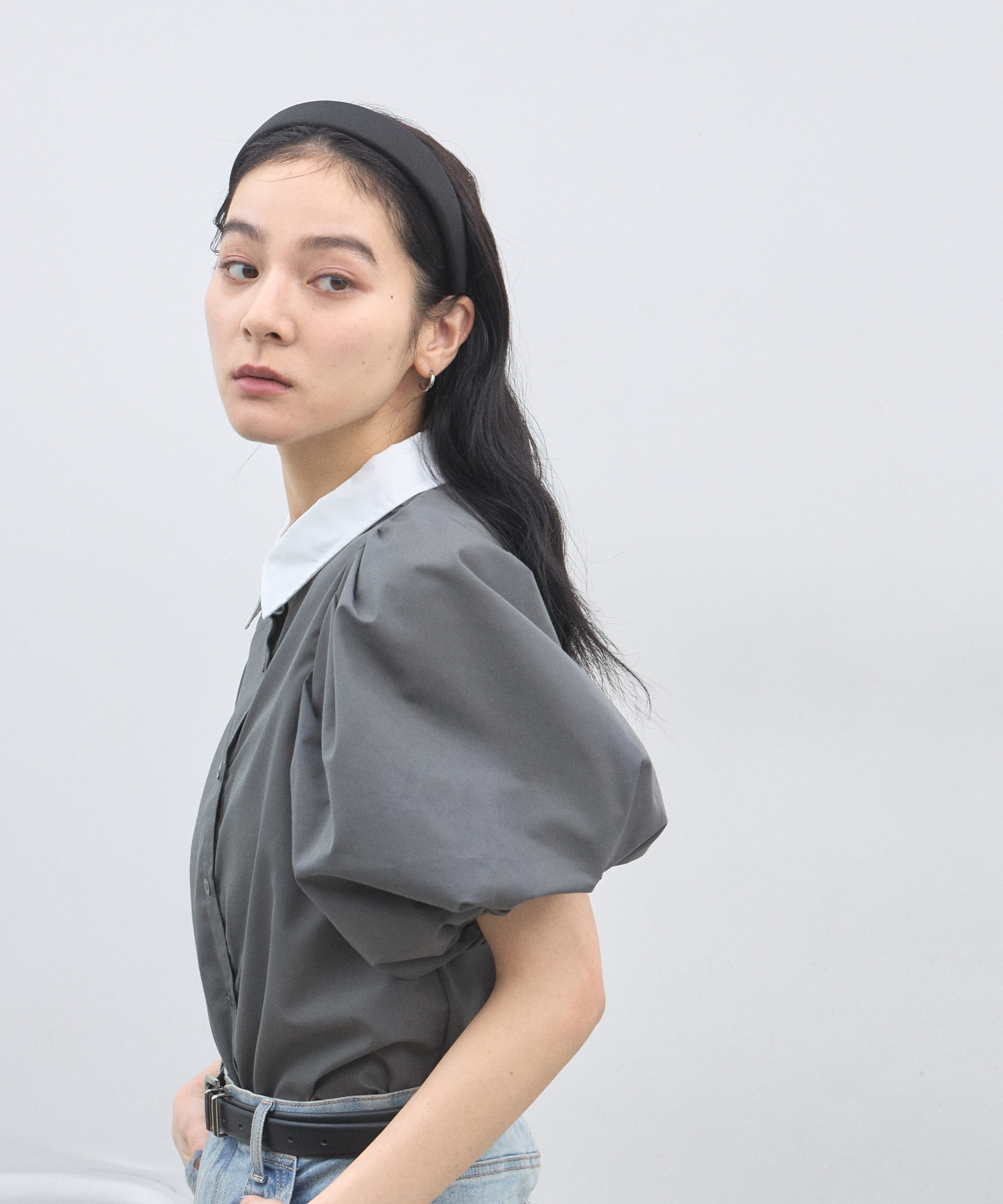 清潔感のある襟と、ボリュームたっぷりのパフスリーブが目を惹く大人可愛い一枚です。