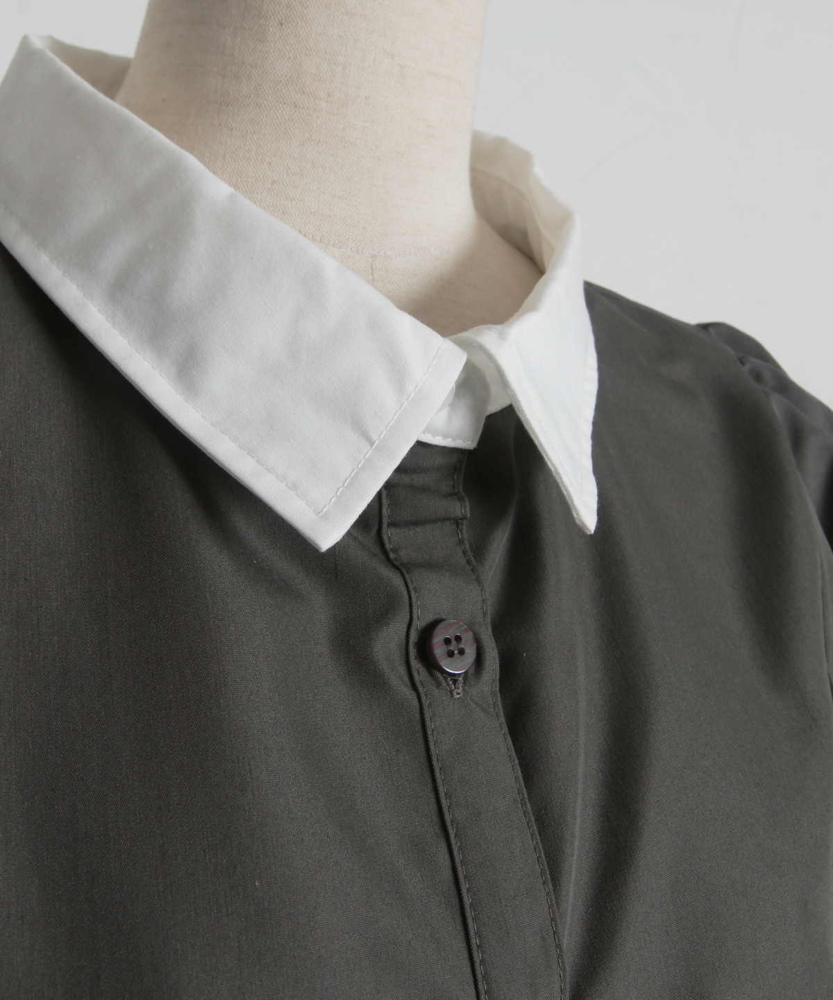 コントラストの効いたバイカラー襟が、モダンでクラシカルな表情を作るブラウス。