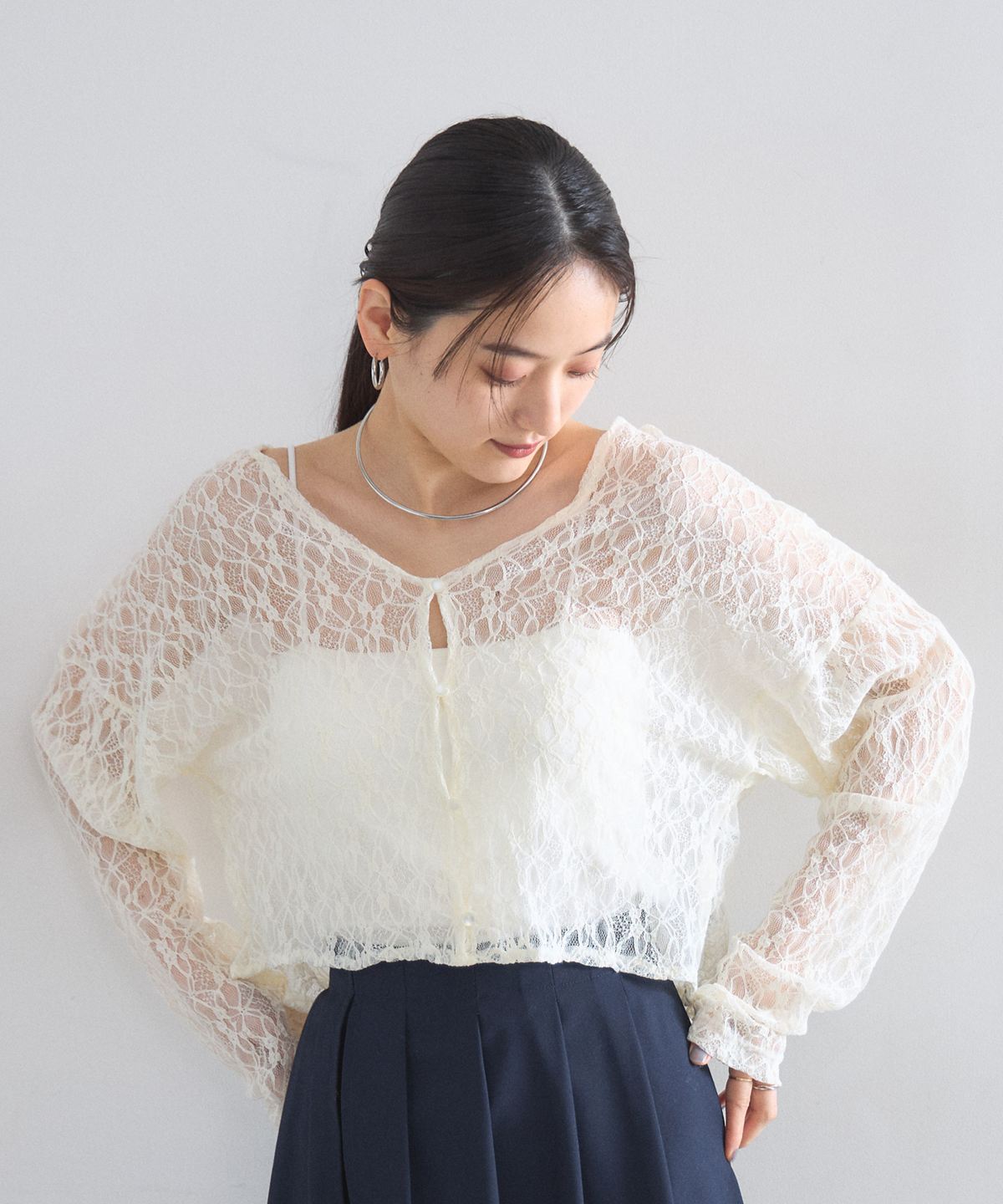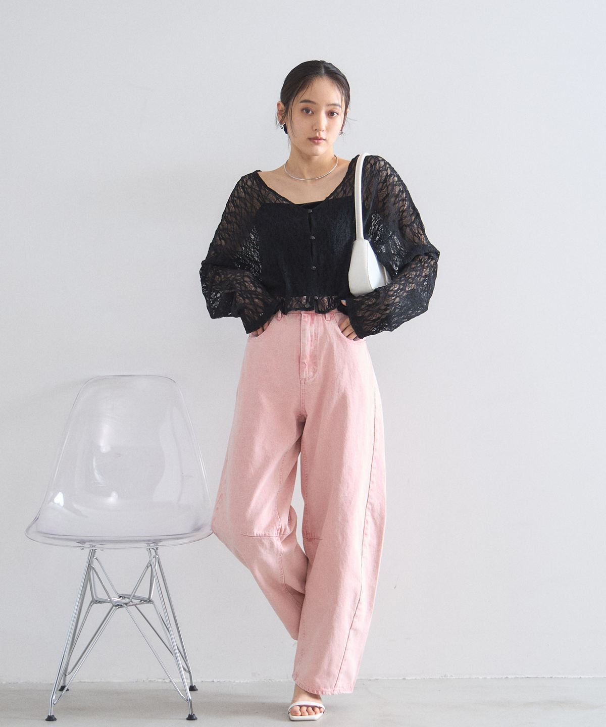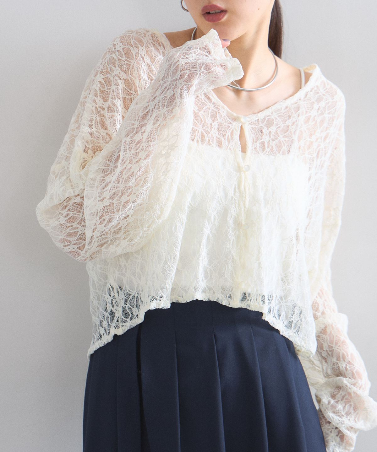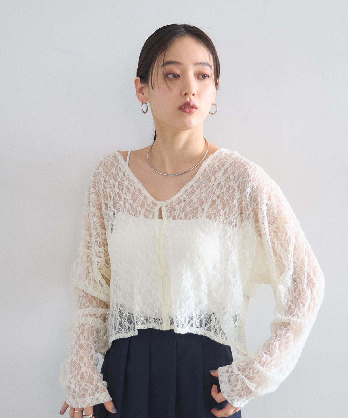 ほどよい透け感とクロップド丈のデザインが、コーディネートに抜け感と