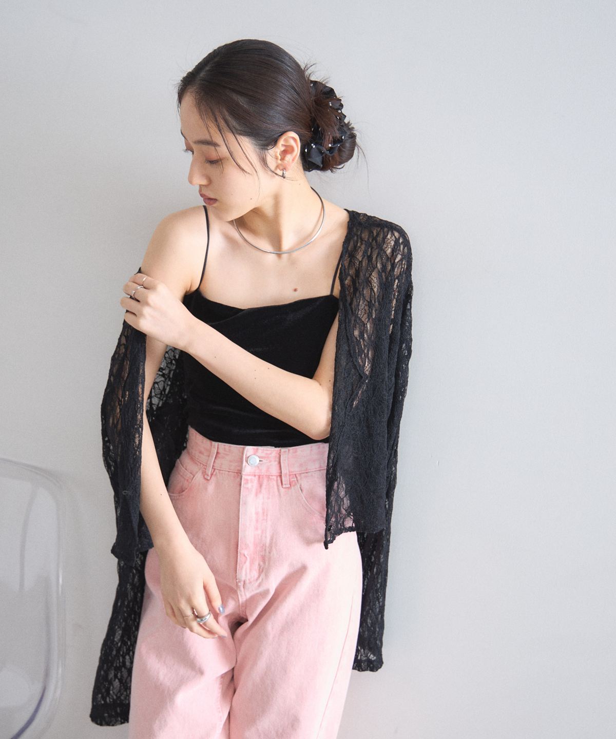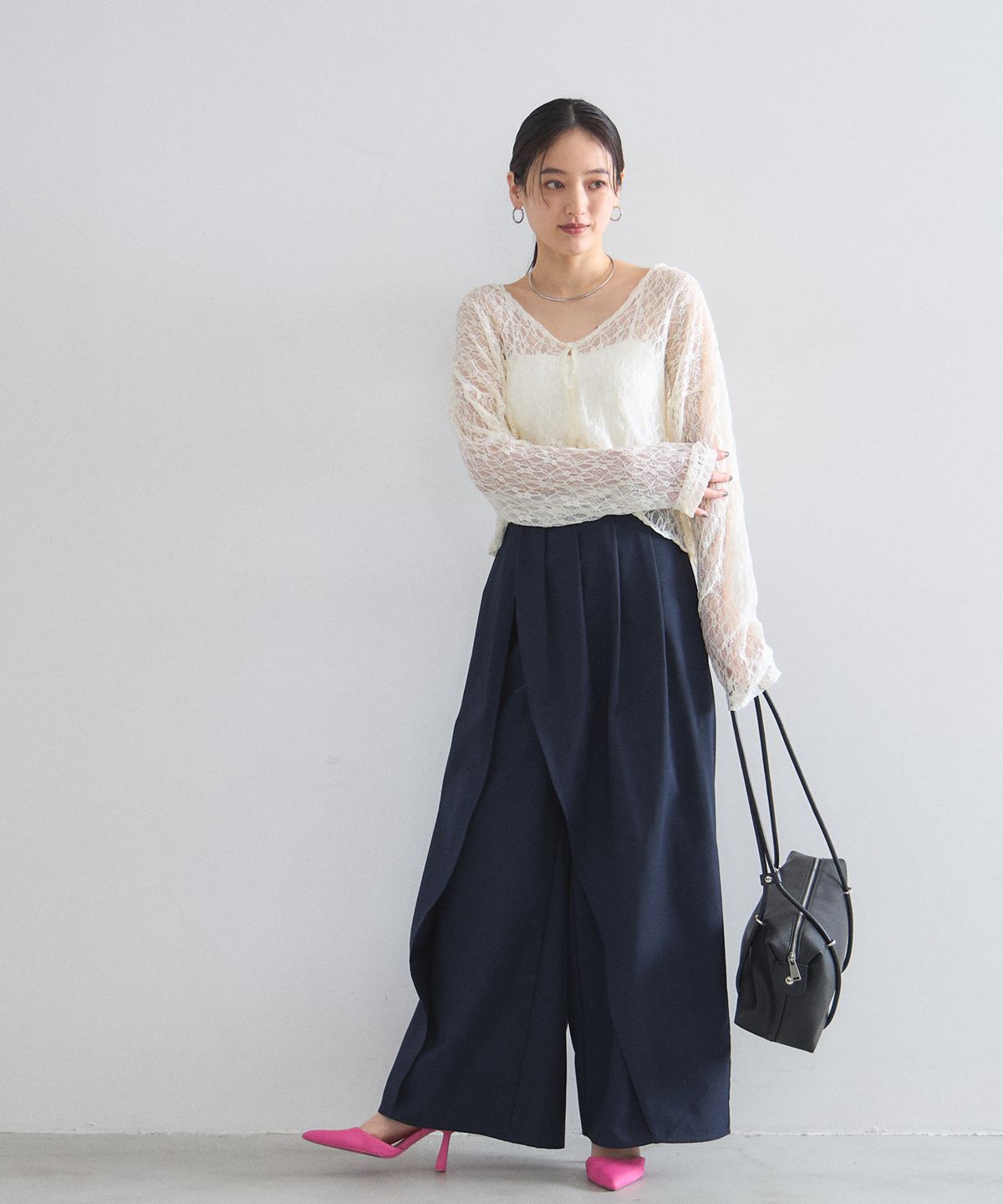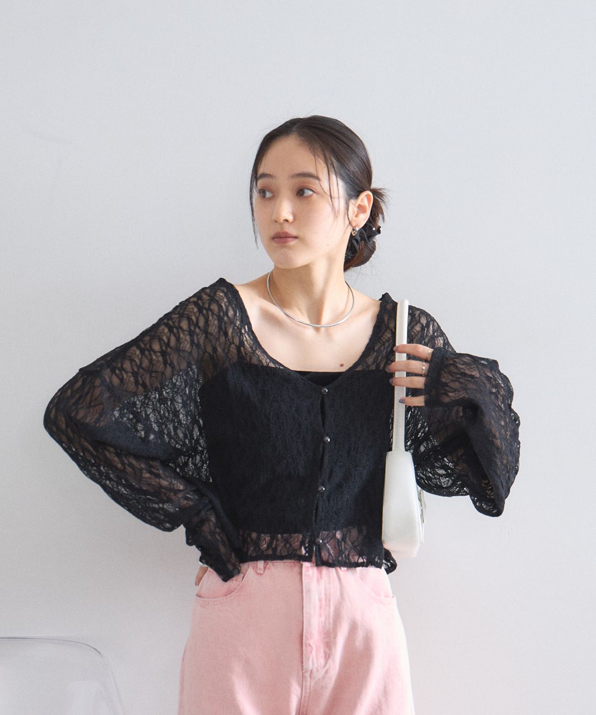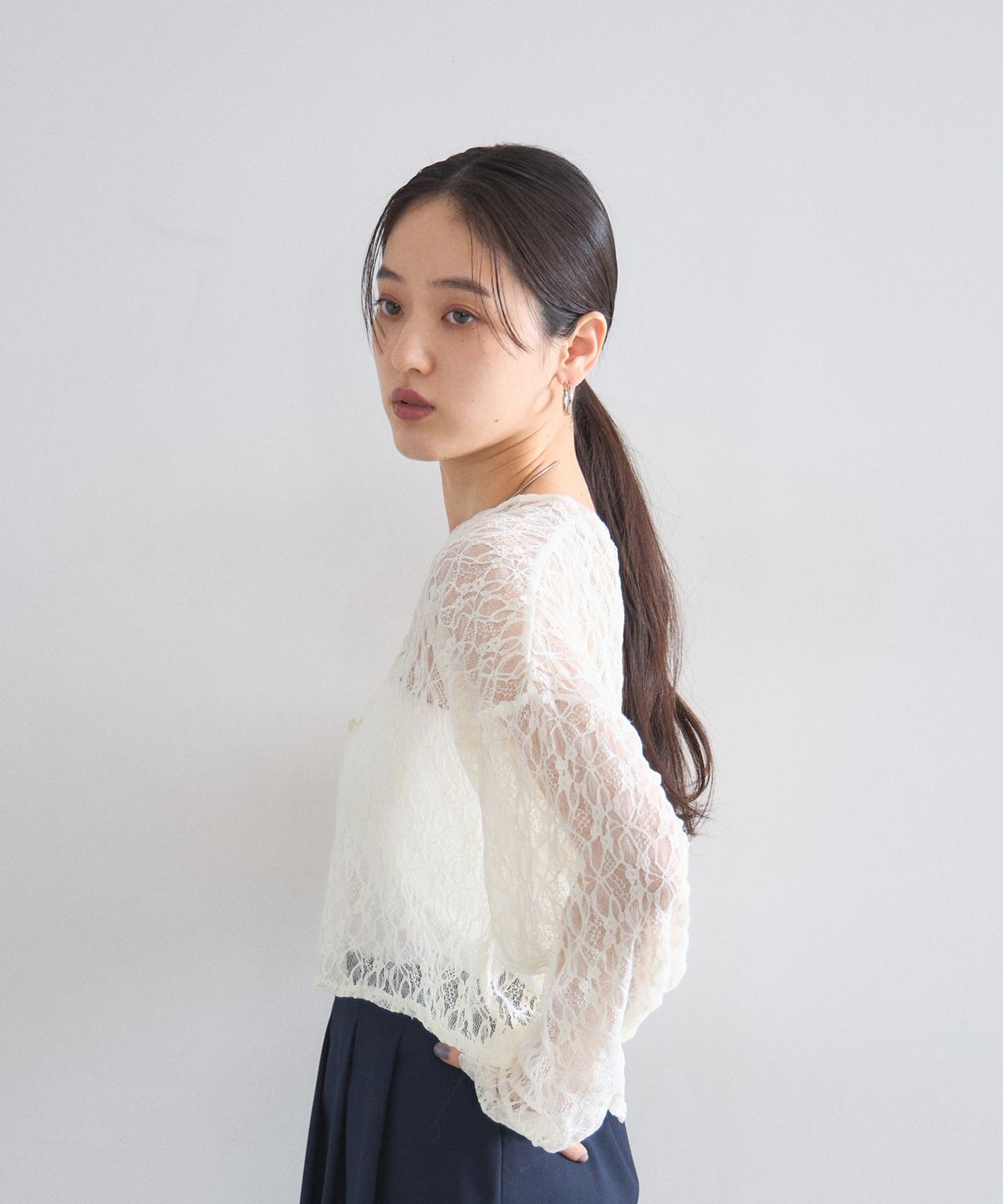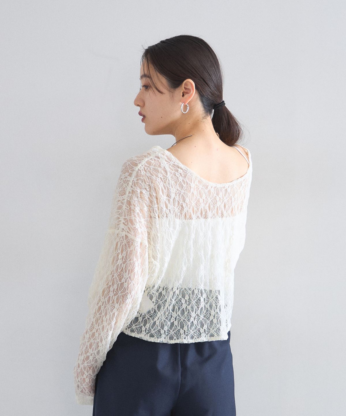 ほどよい透け感とクロップド丈のデザインが、コーディネートに抜け感と