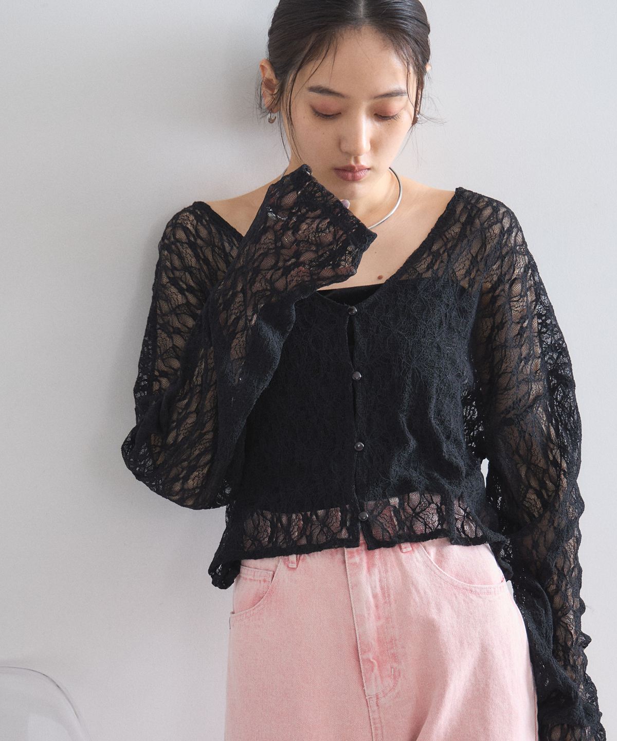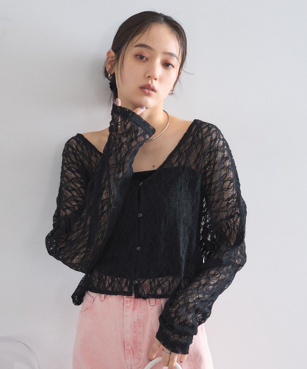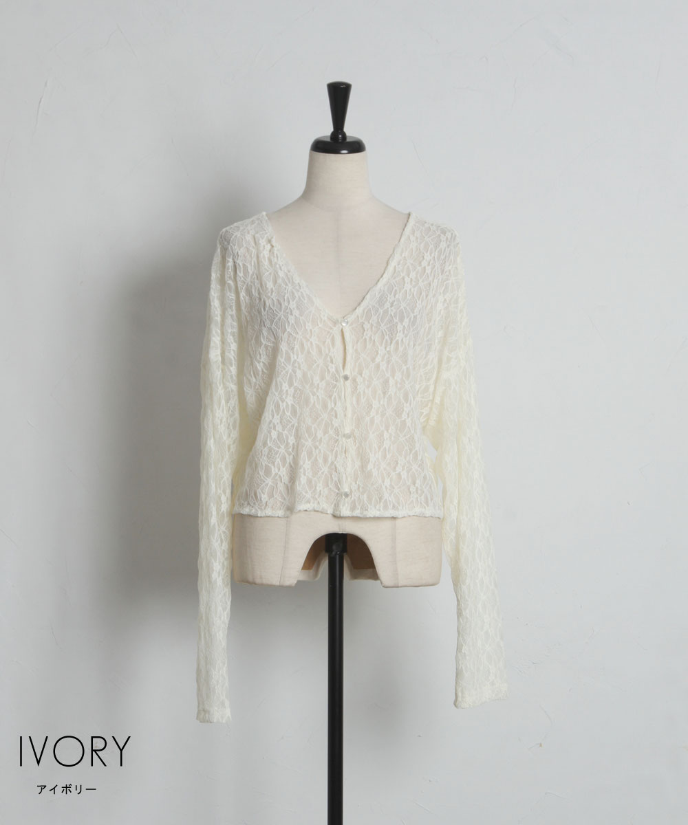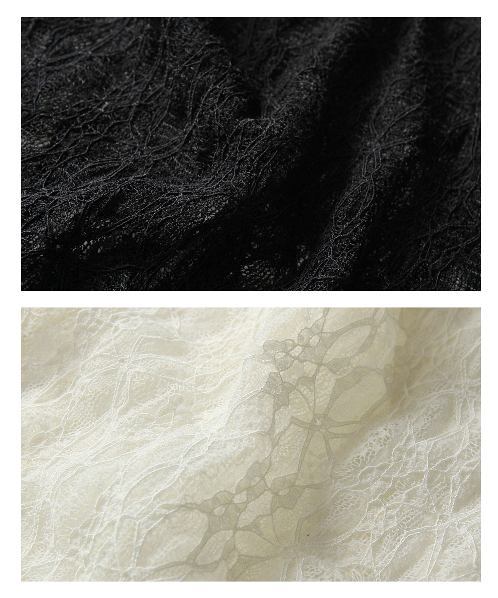 繊細な幾何学模様の総レースが目を惹く、表情豊かなカーディガンです。