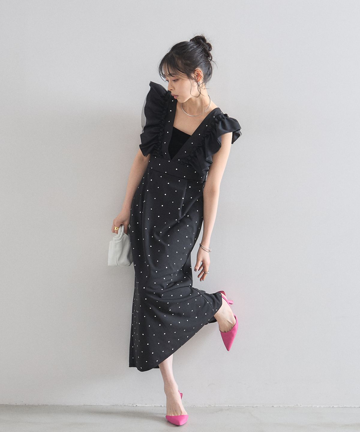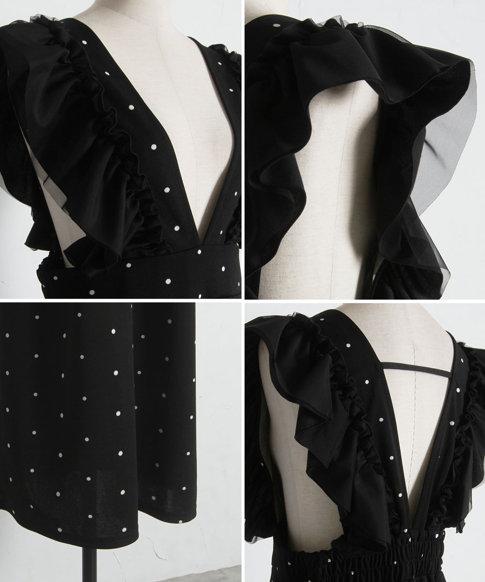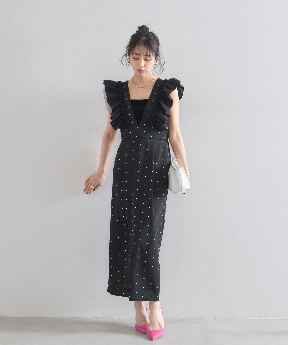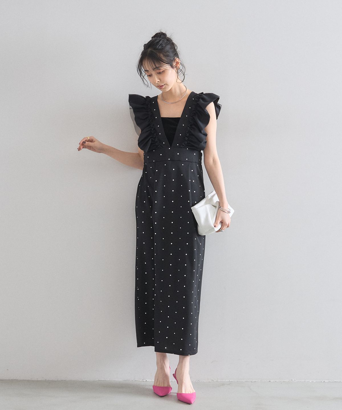 大人の遊び心をくすぐる、ドット柄フリルワンピース