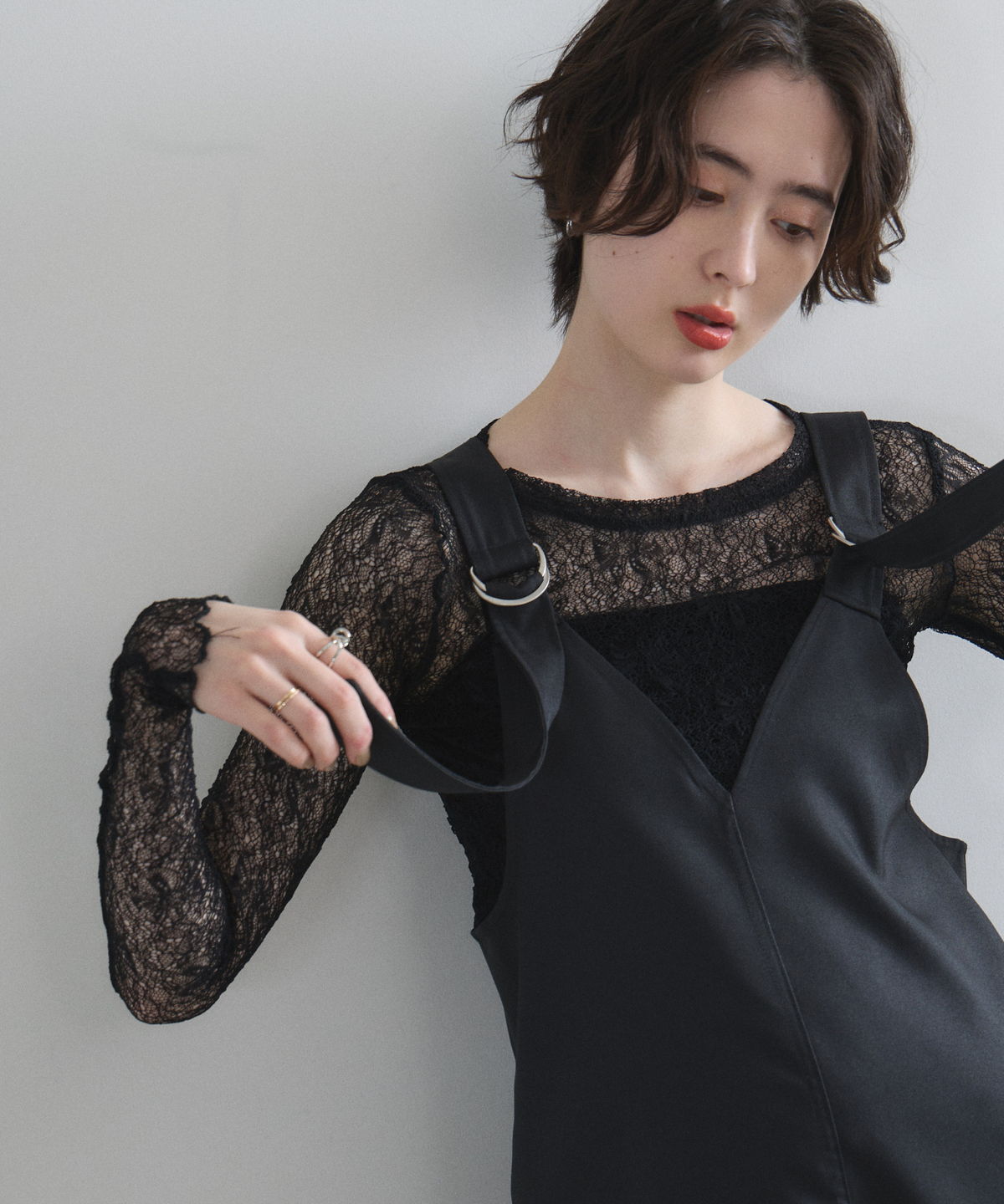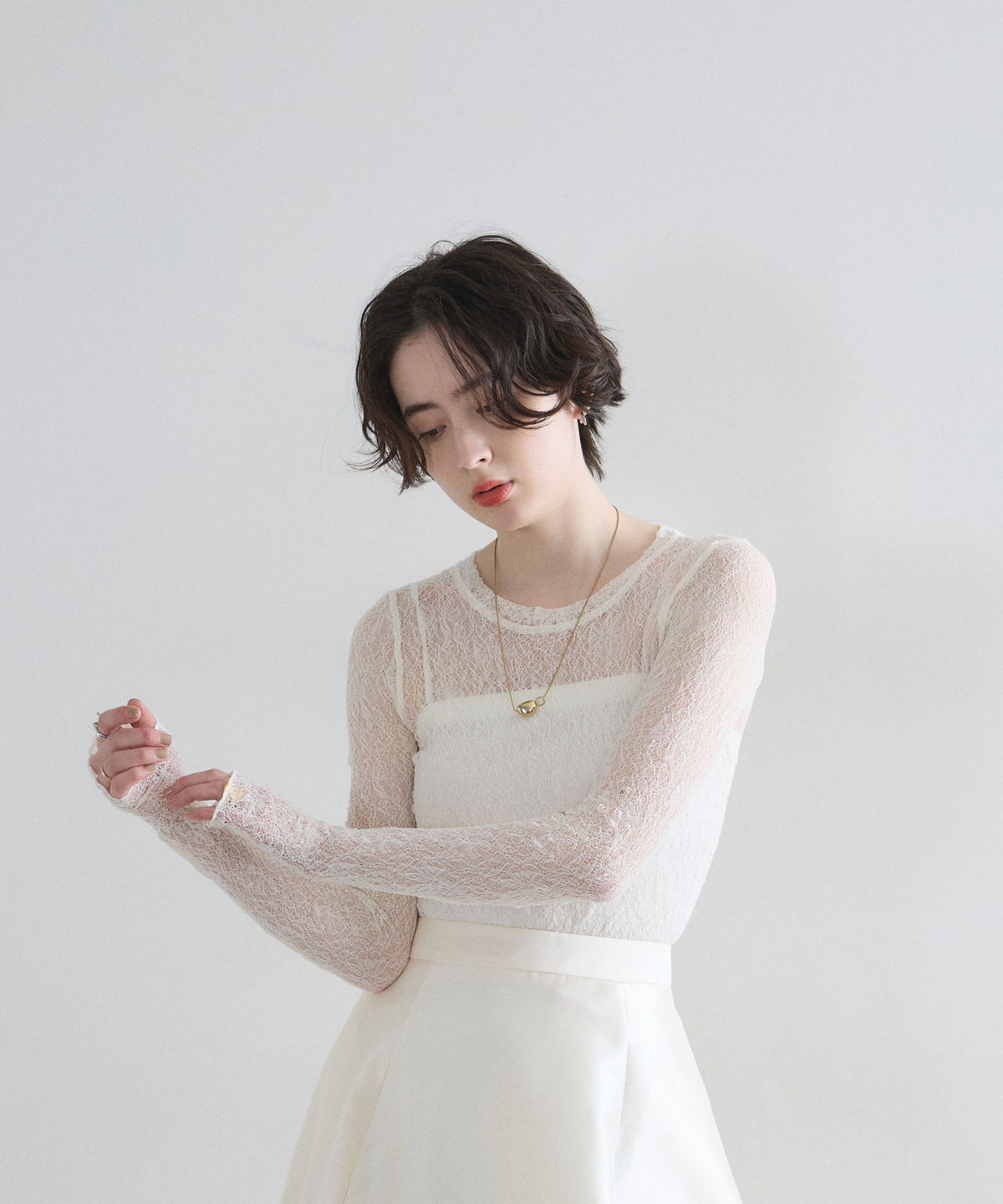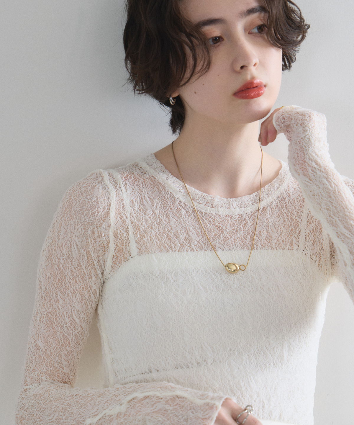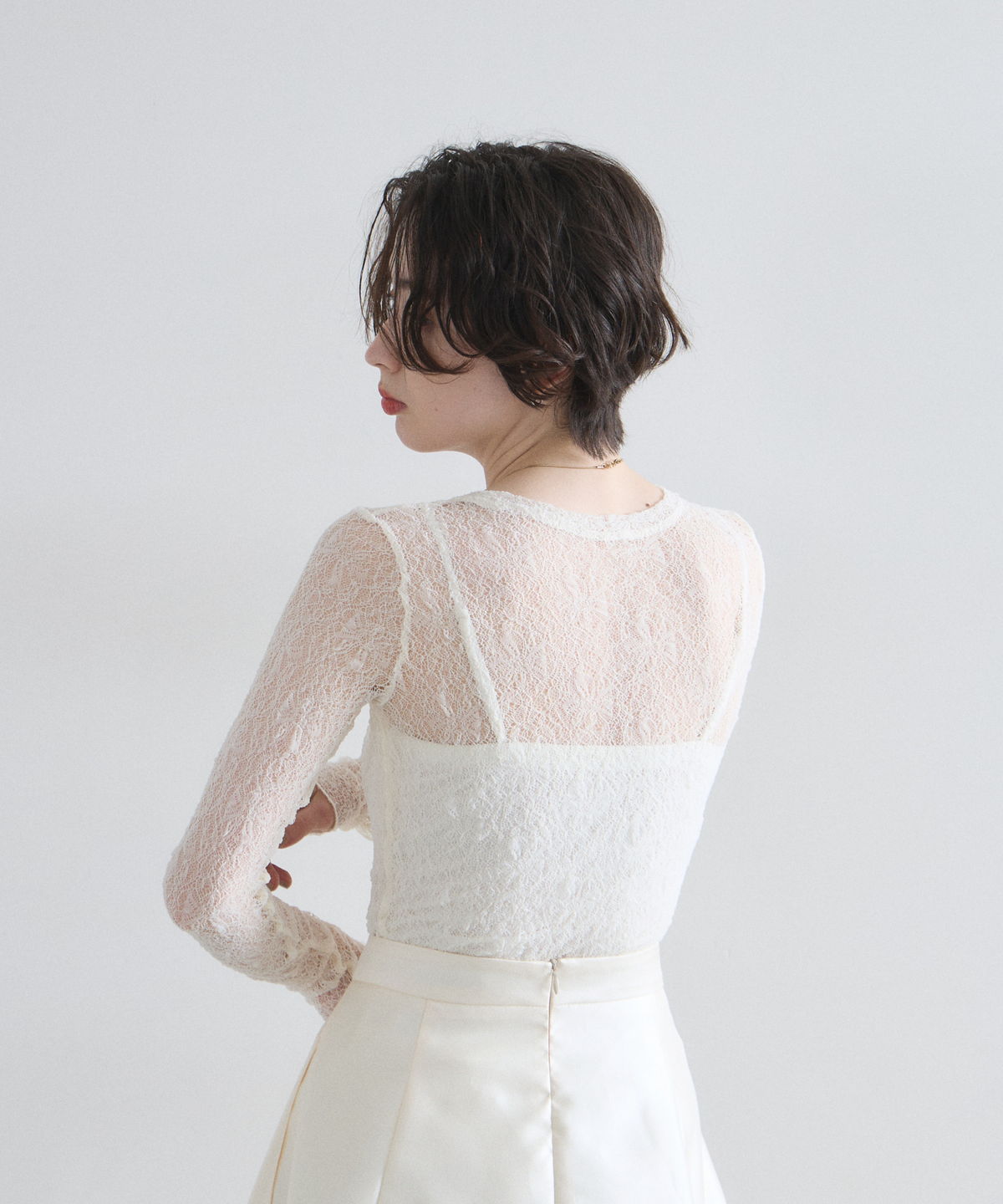 レイヤードスタイルを華やかに彩る、繊細な透け感の総レーストップス。