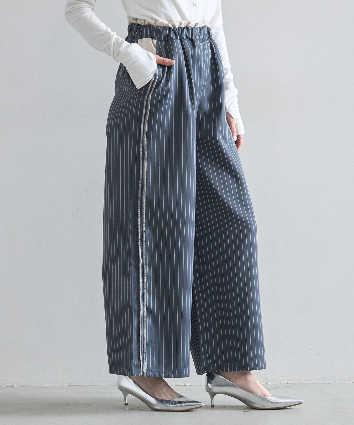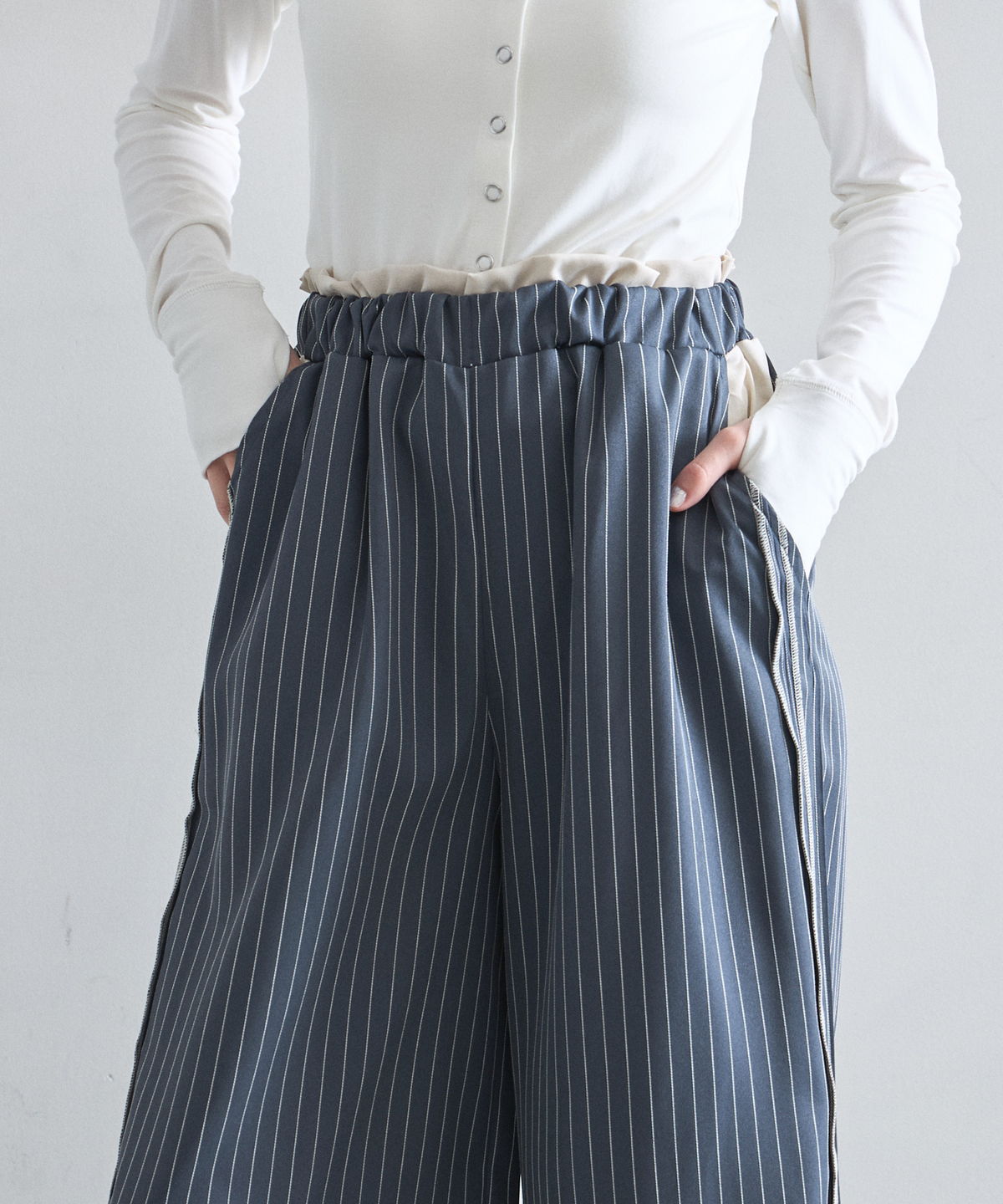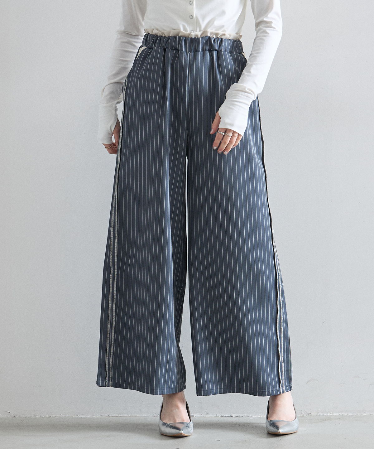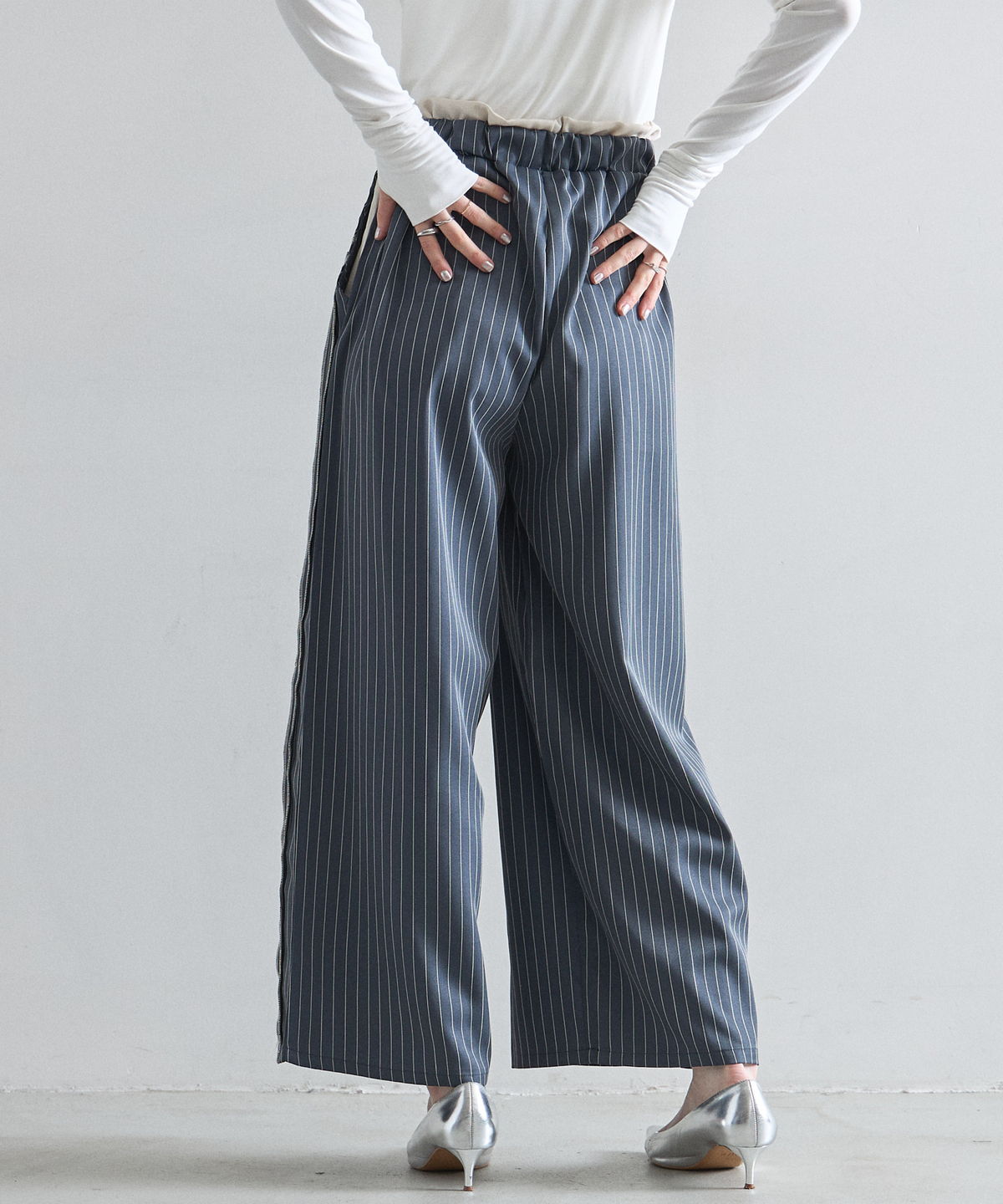 マニッシュな魅力が漂う、ピンストライプ柄のサイドラインワイドパンツ。