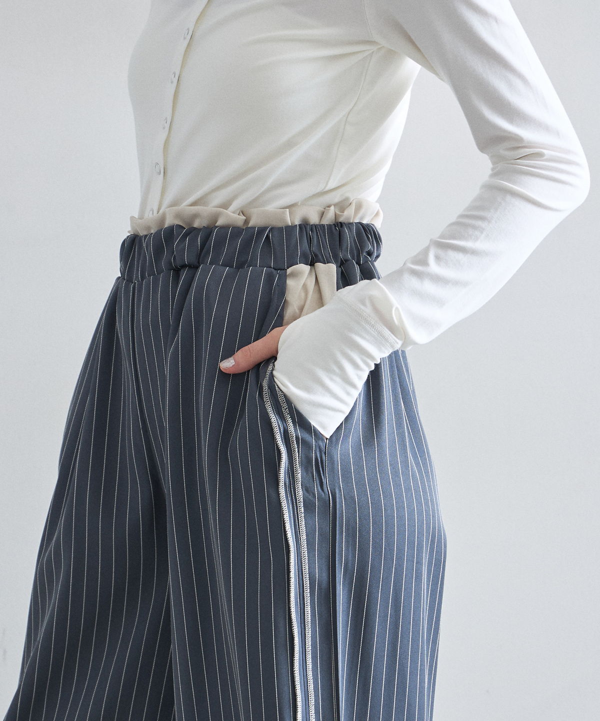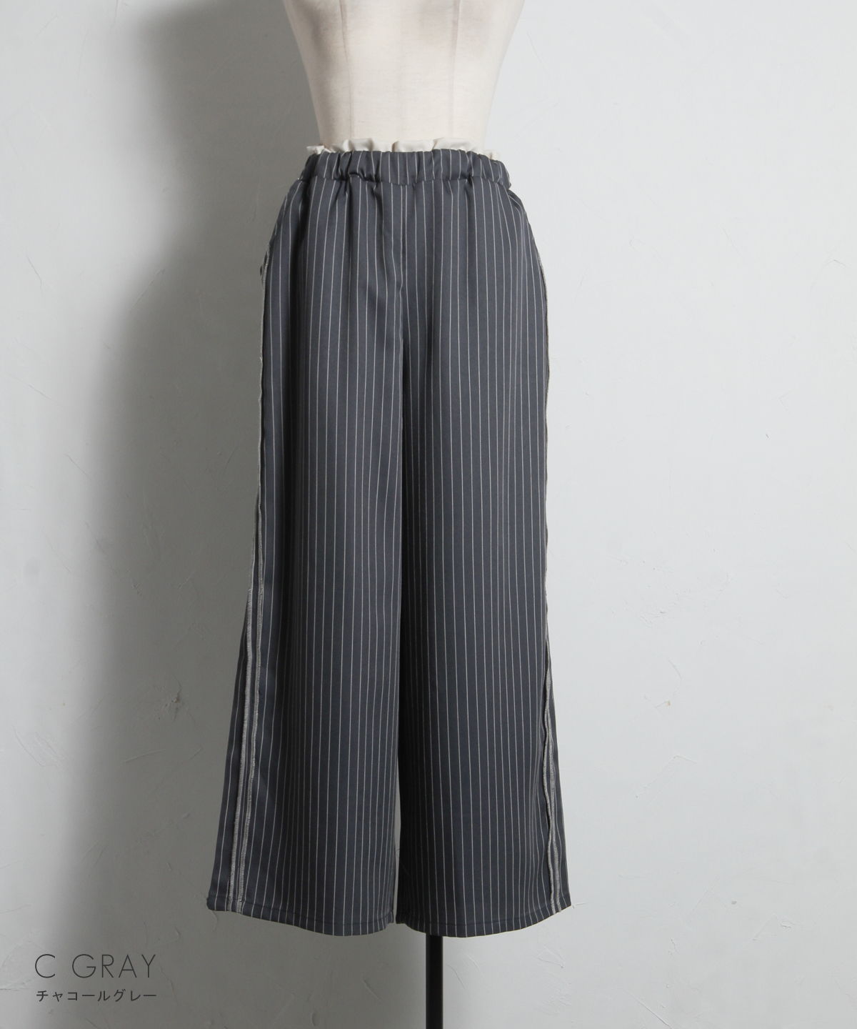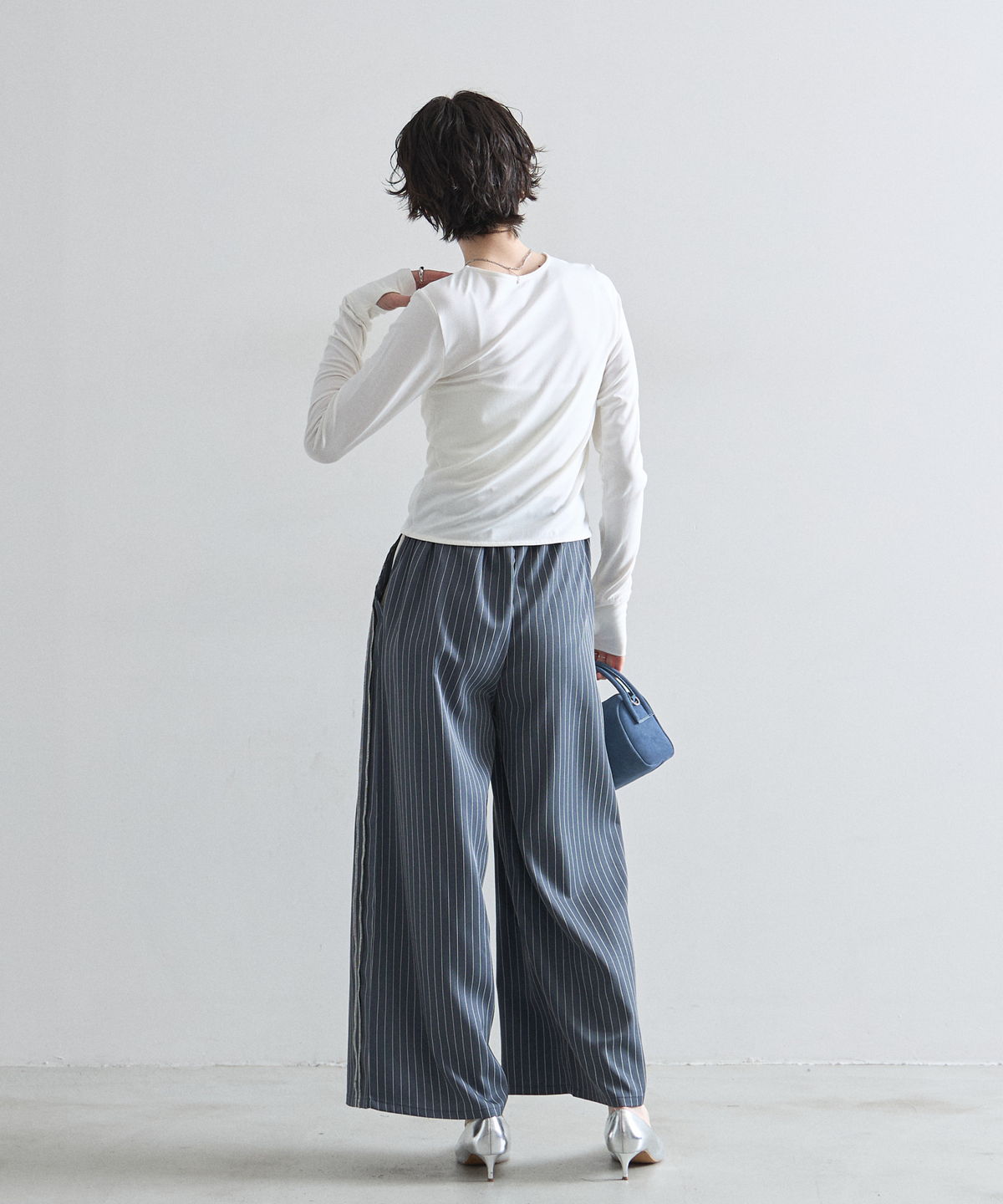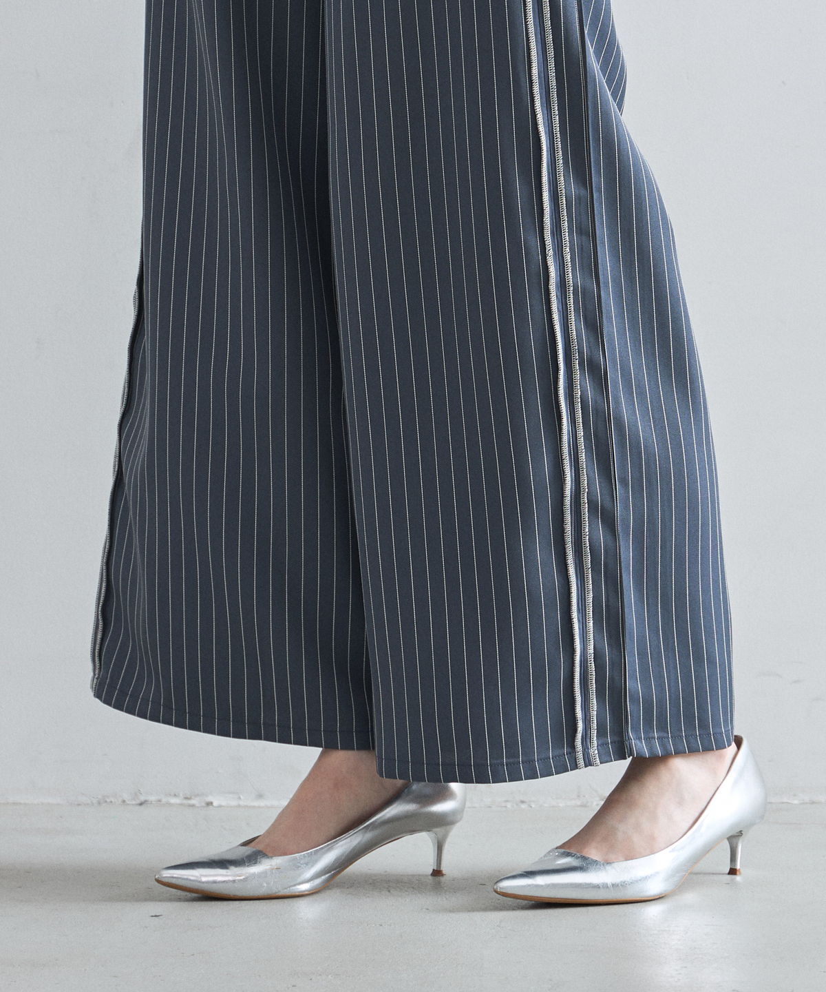 マニッシュな魅力が漂う、ピンストライプ柄のサイドラインワイドパンツ。