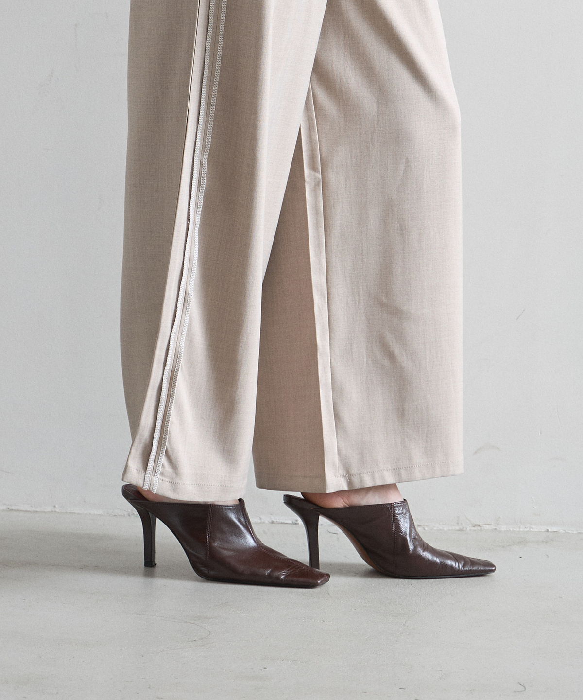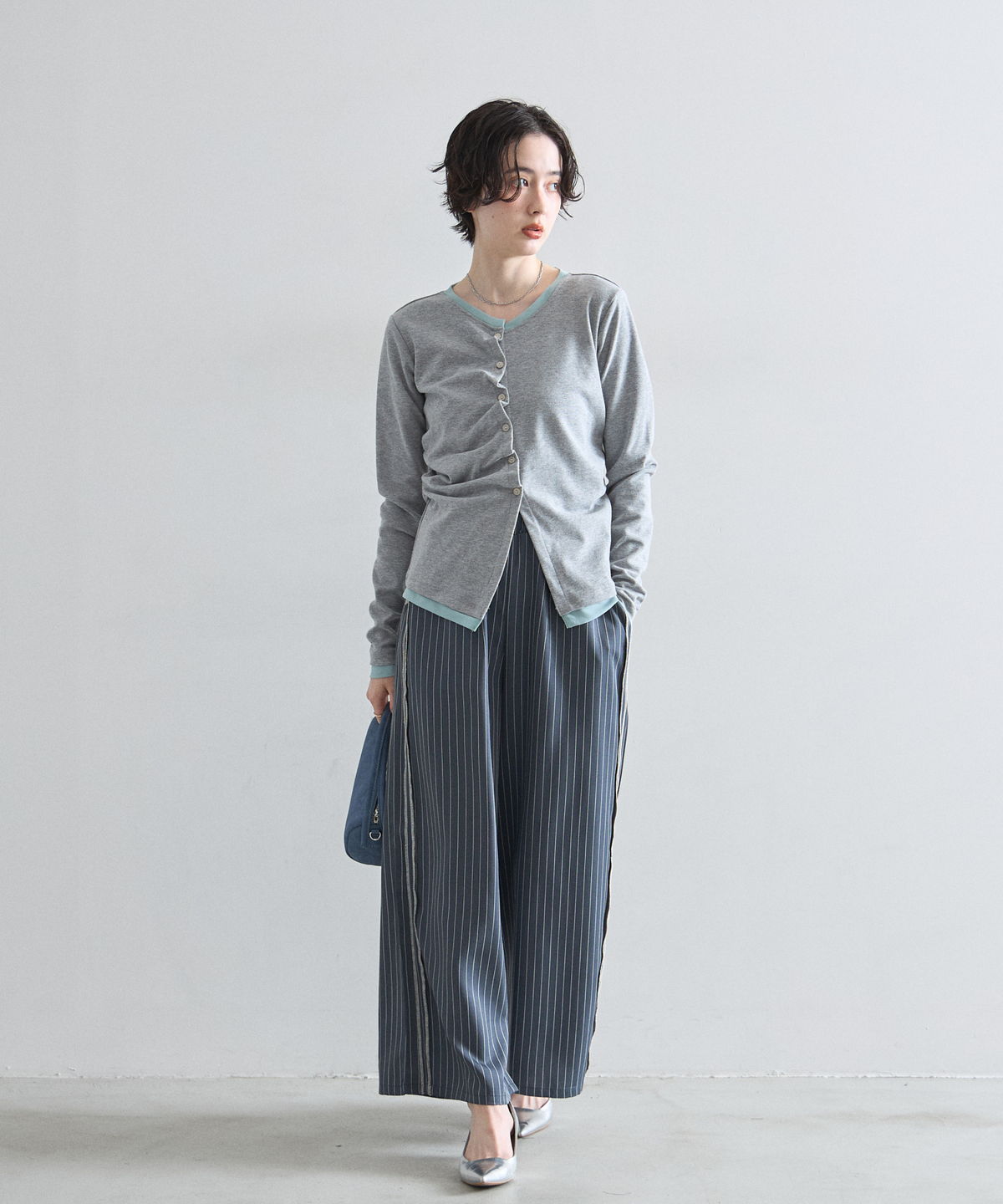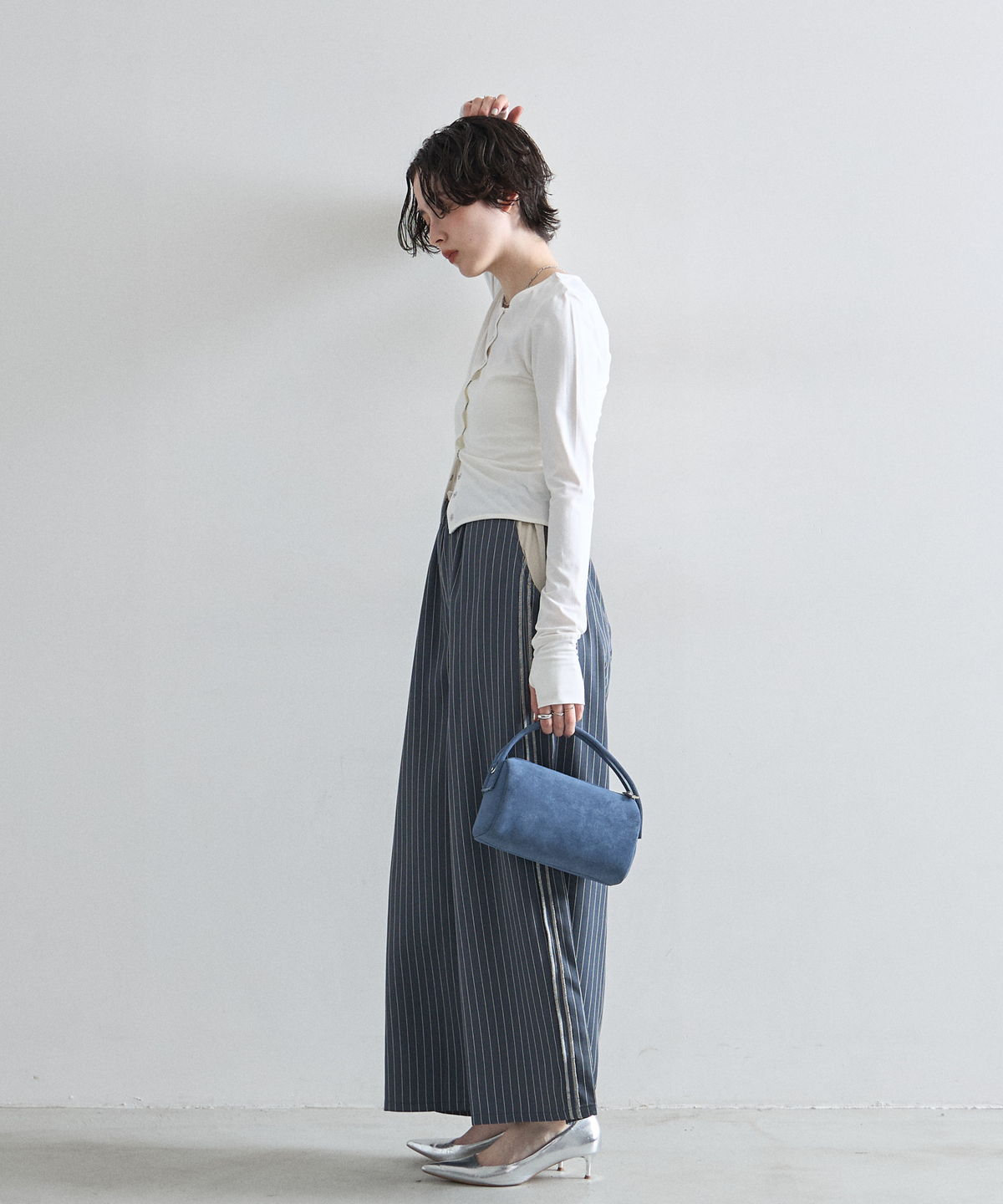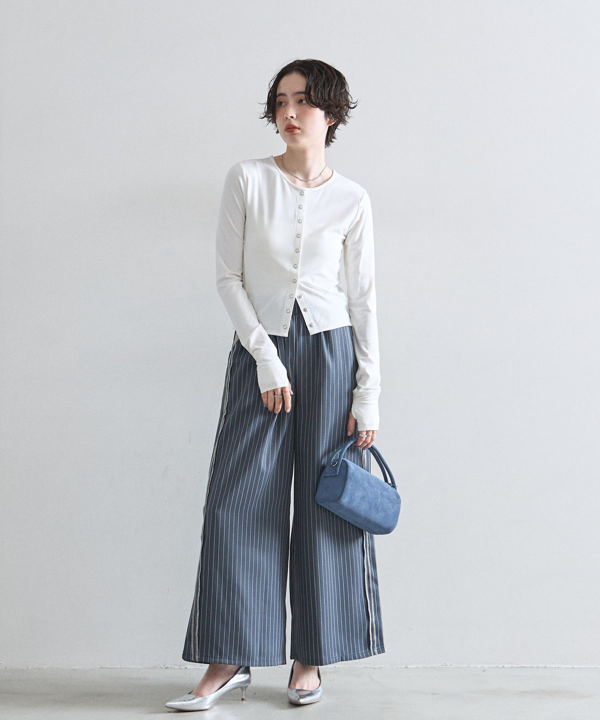 マニッシュな魅力が漂う、ピンストライプ柄のサイドラインワイドパンツ。