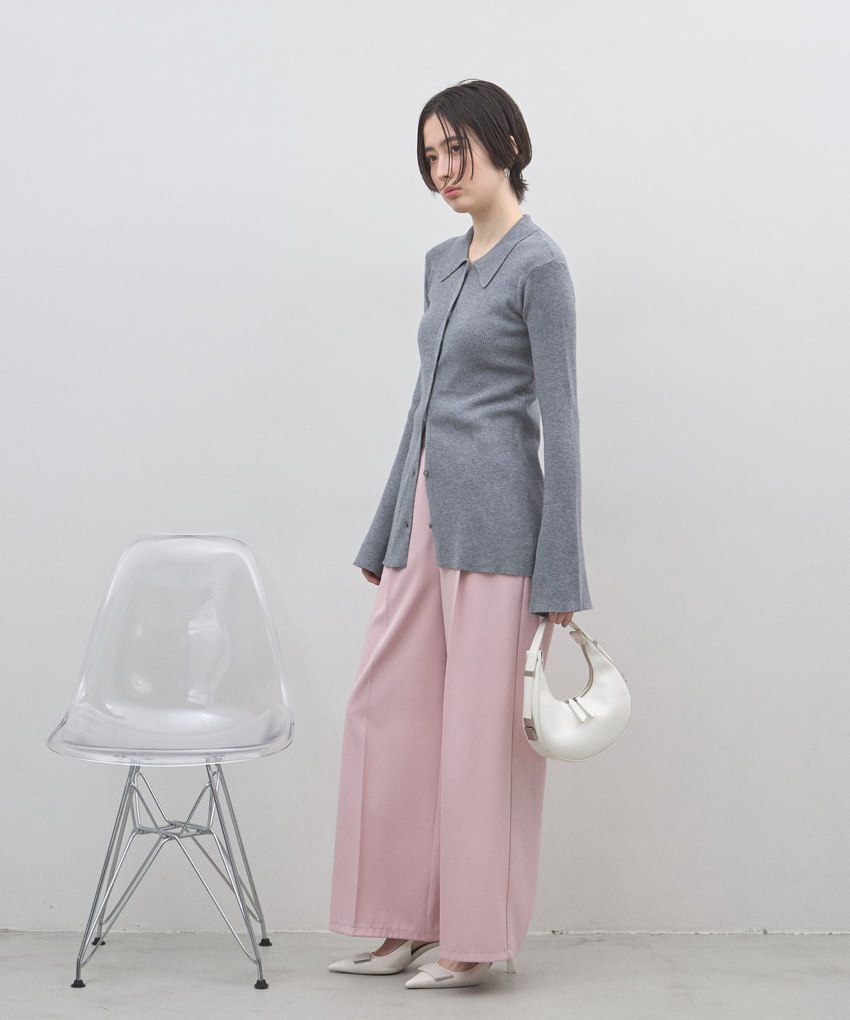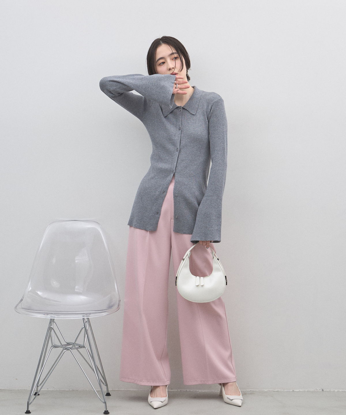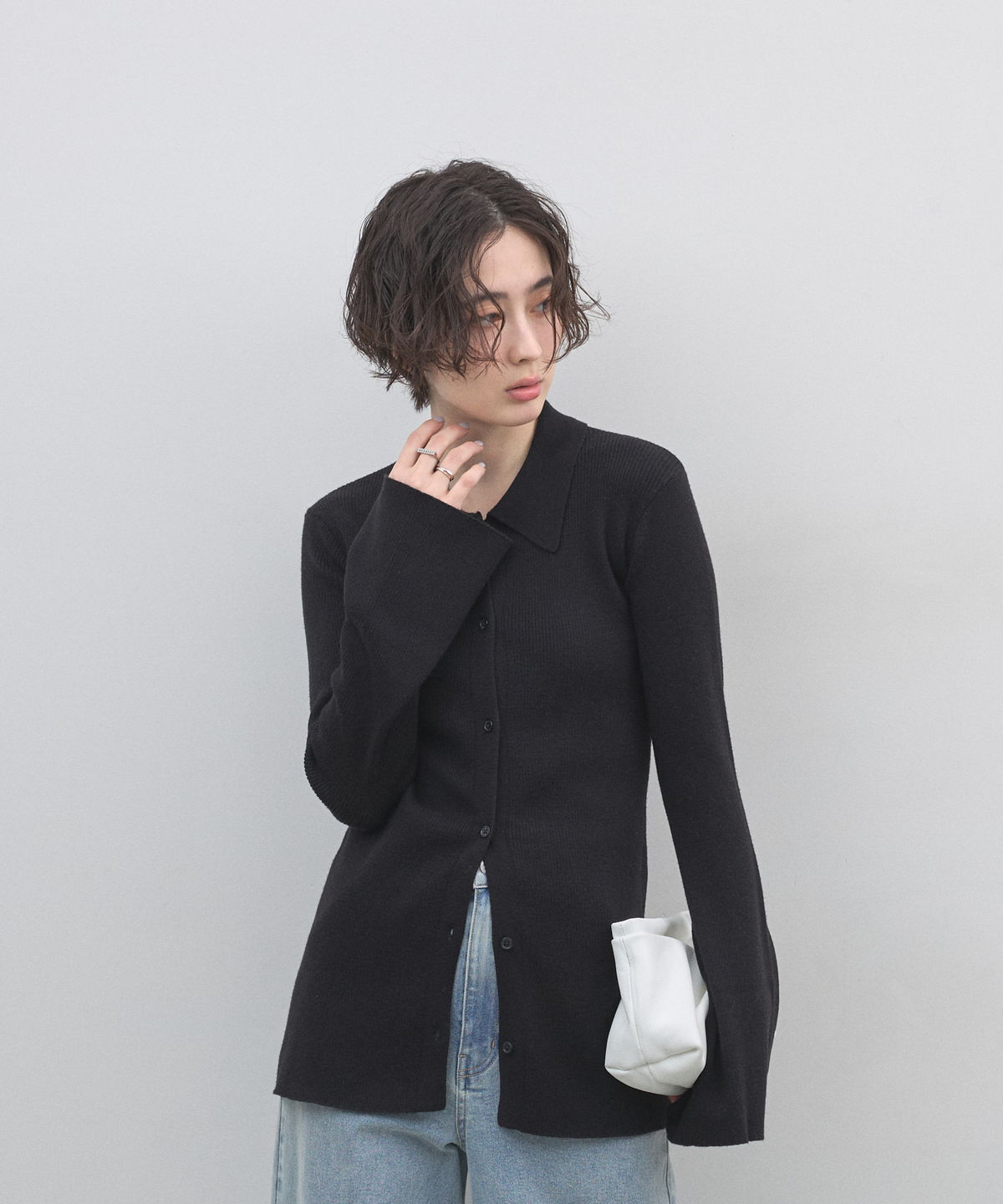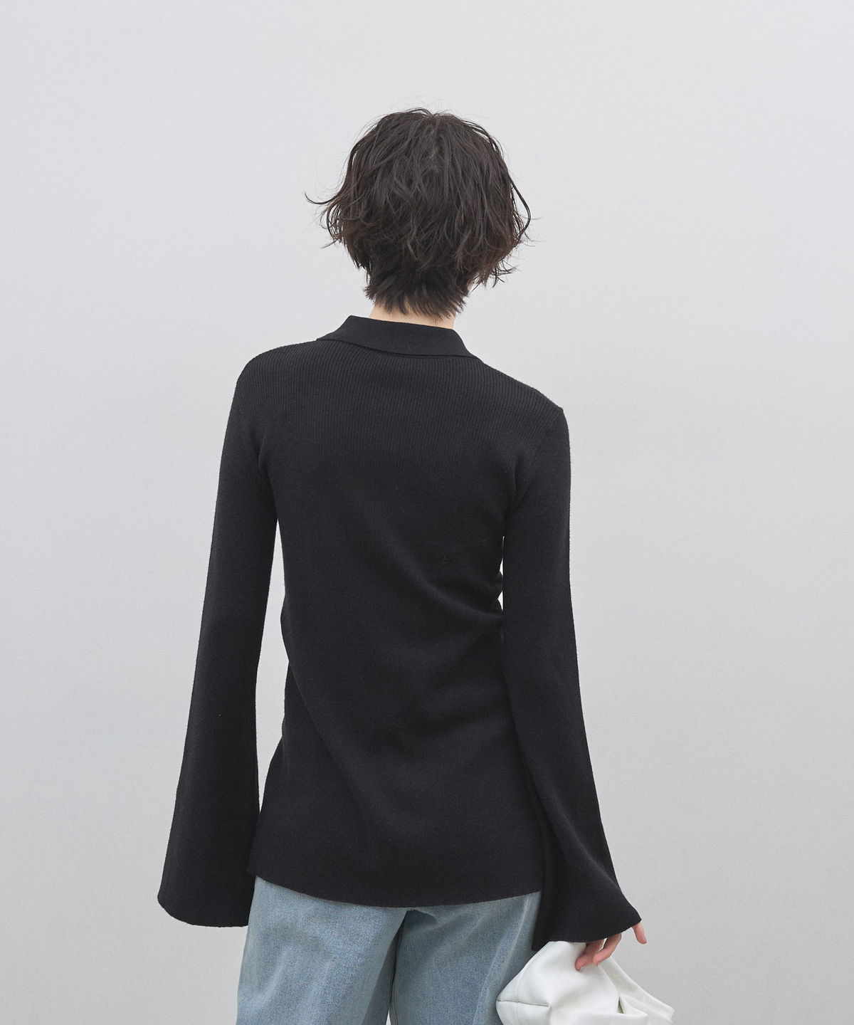 手元から溢れるエレガンス。ベルスリーブが描く、美シルエットのポロニットカーディガン。