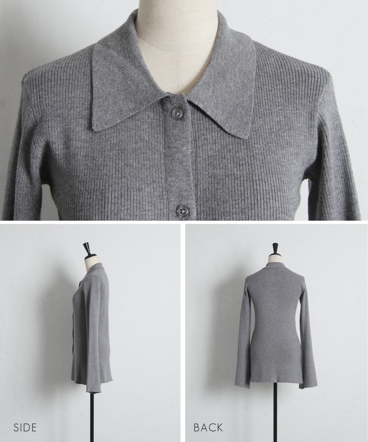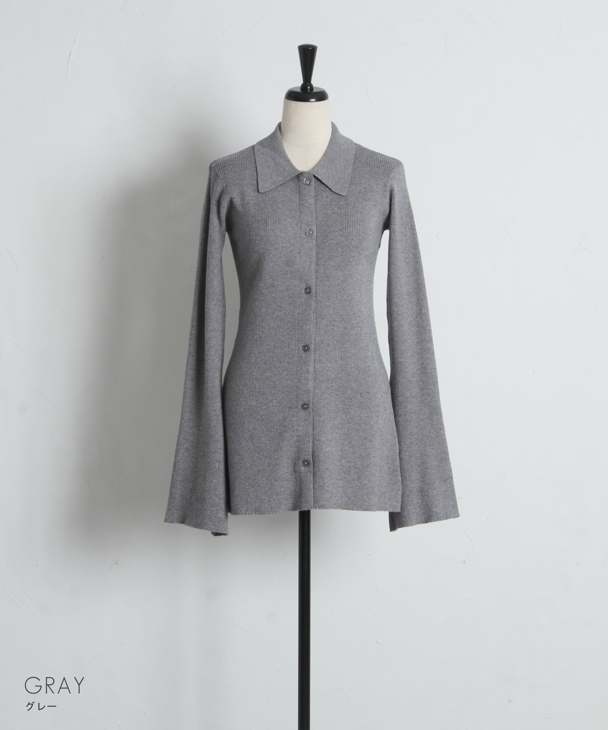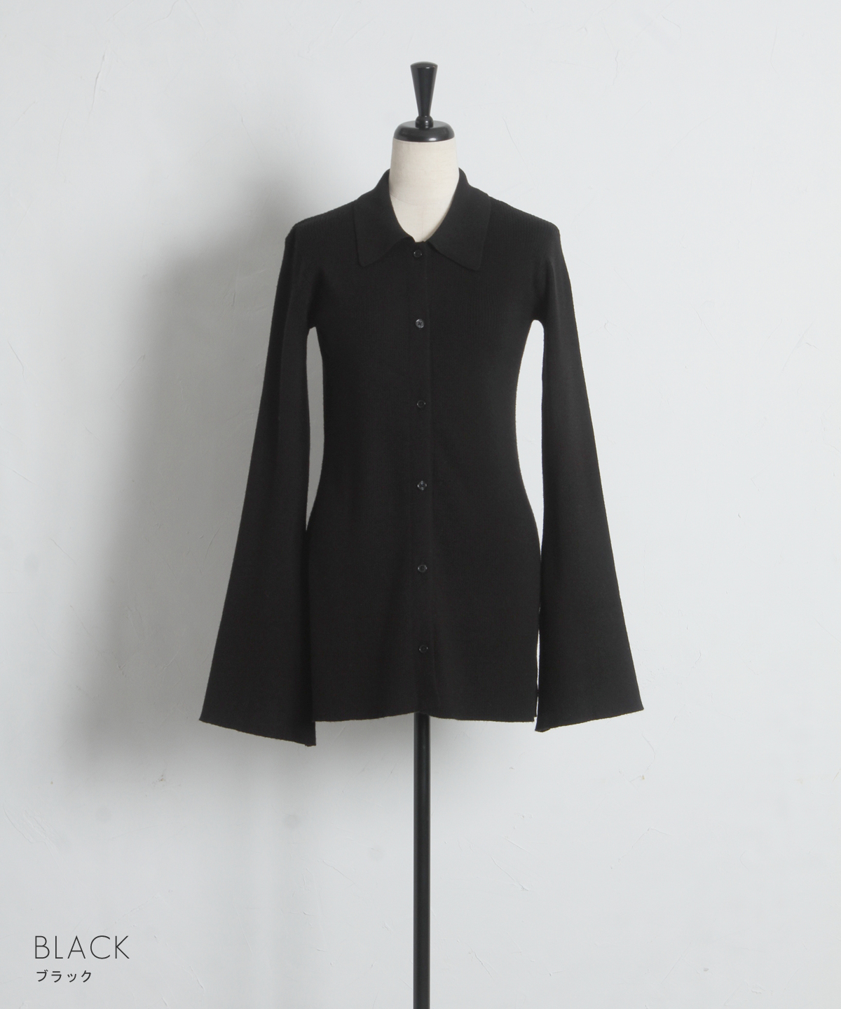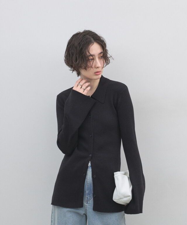 優雅に広がるベルスリーブが、動作のたびに美しい余韻を残すニットカーディガン。細めのリブ編みがボディラインにしなやかにフィットし、襟付きのデザインが顔周りに程よいきちんと感を与えます。