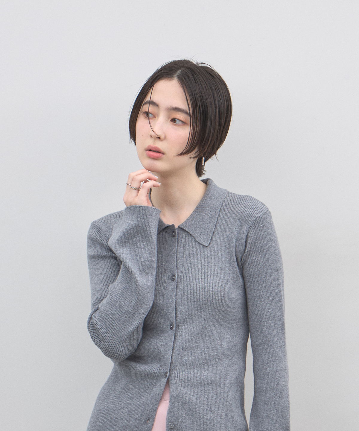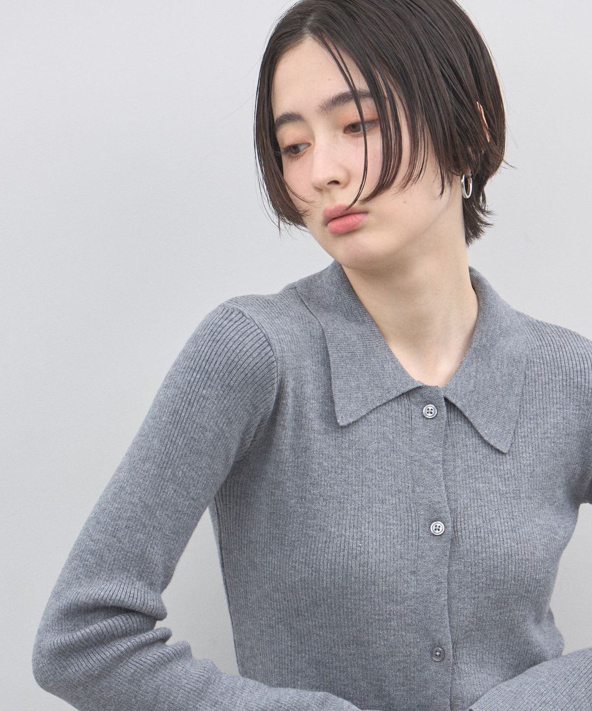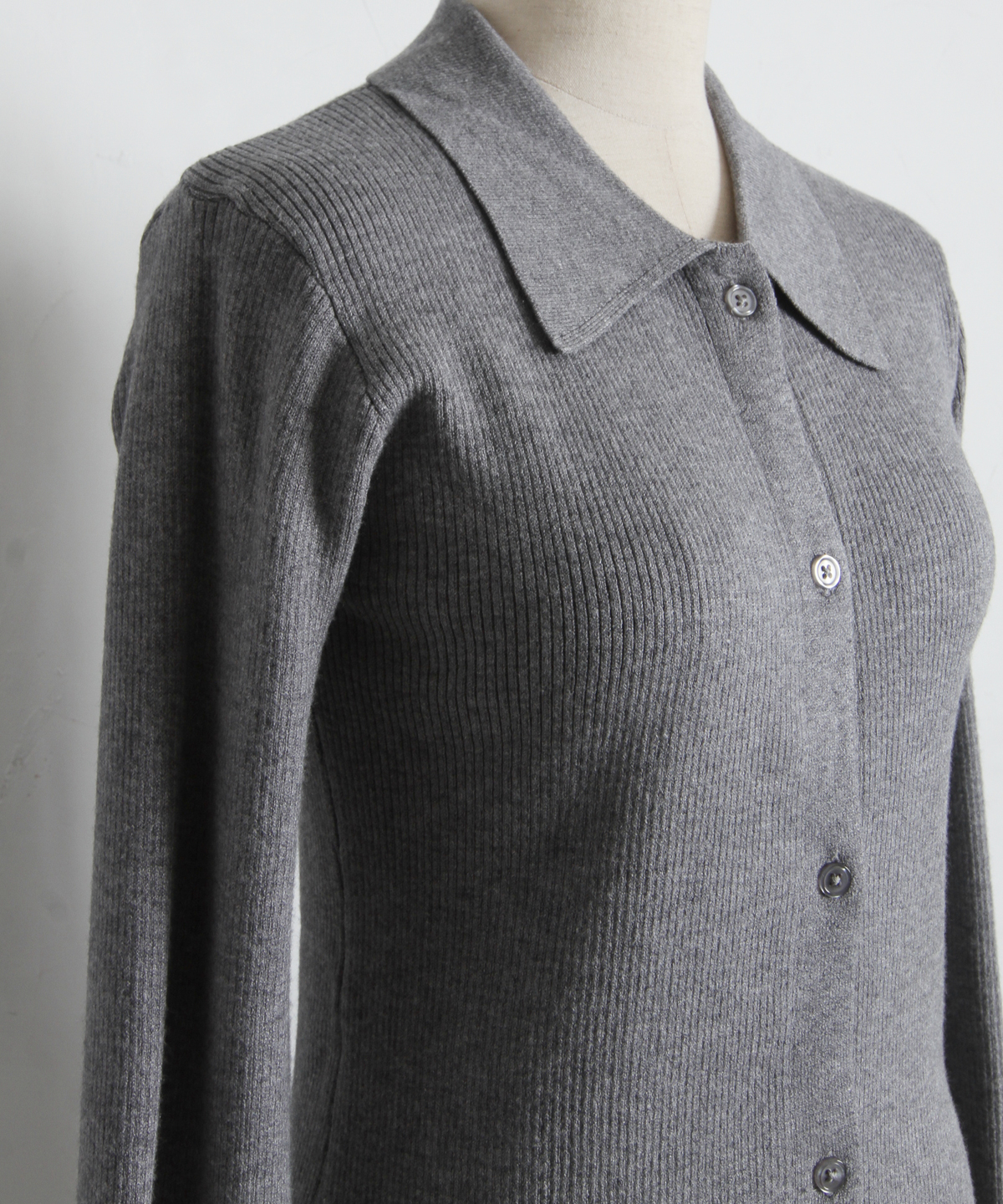 優雅に広がるベルスリーブが、動作のたびに美しい余韻を残すニットカーディガン。細めのリブ編みがボディラインにしなやかにフィットし、襟付きのデザインが顔周りに程よいきちんと感を与えます。