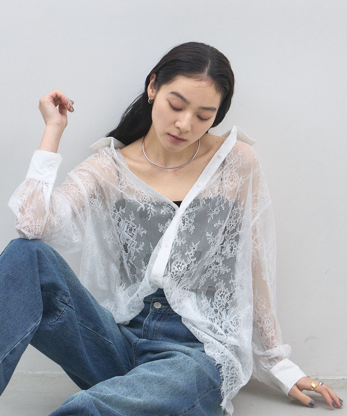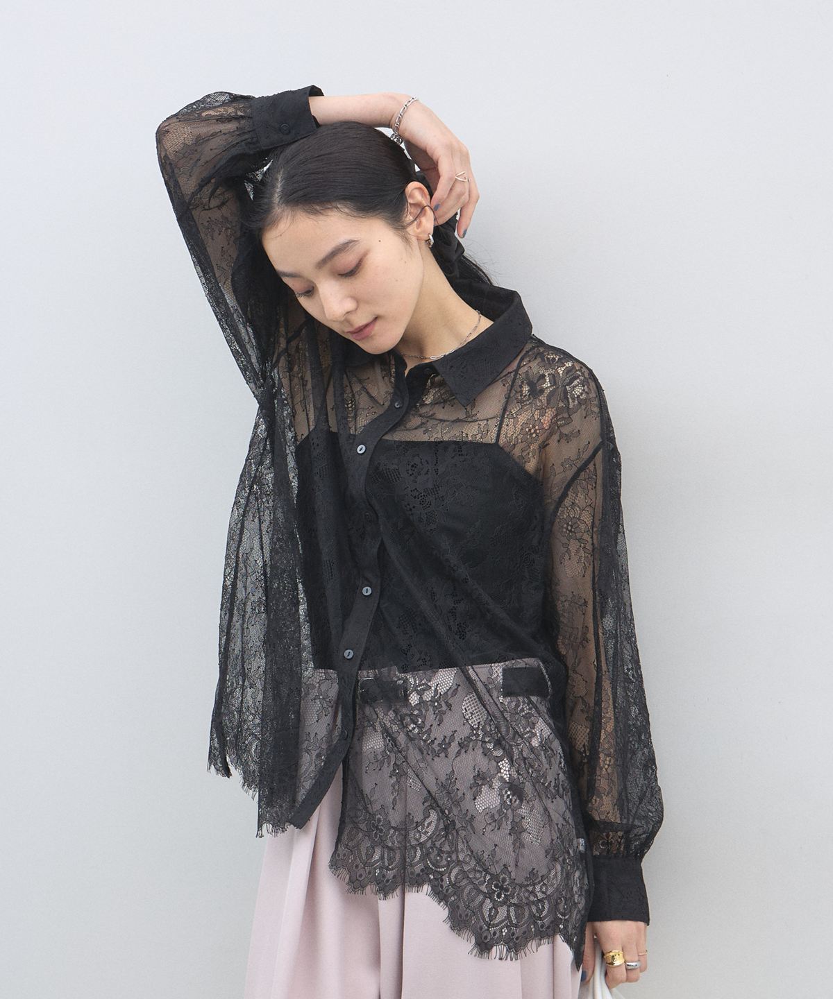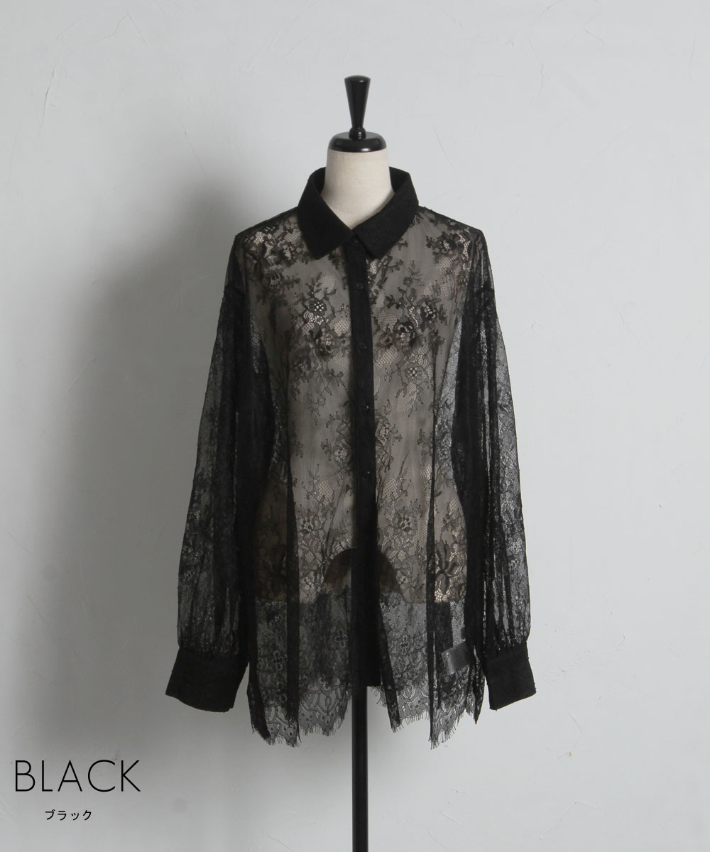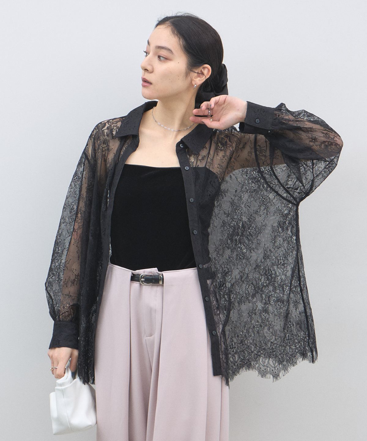 繊細な花柄の総レースが目を惹く、エレガントなシアーシャツです。