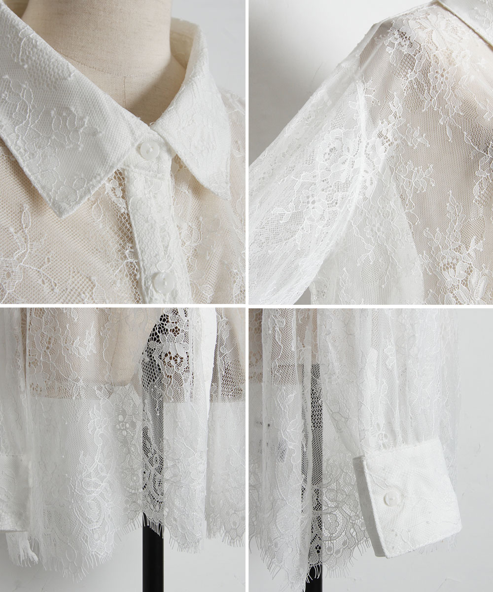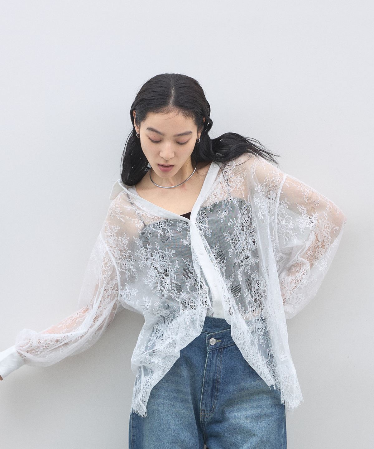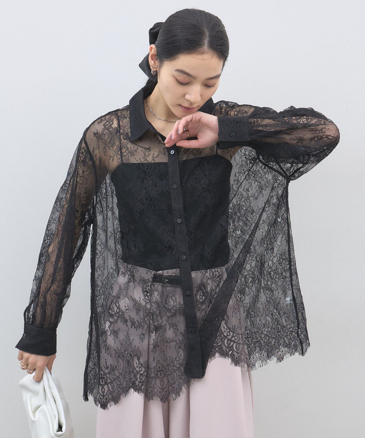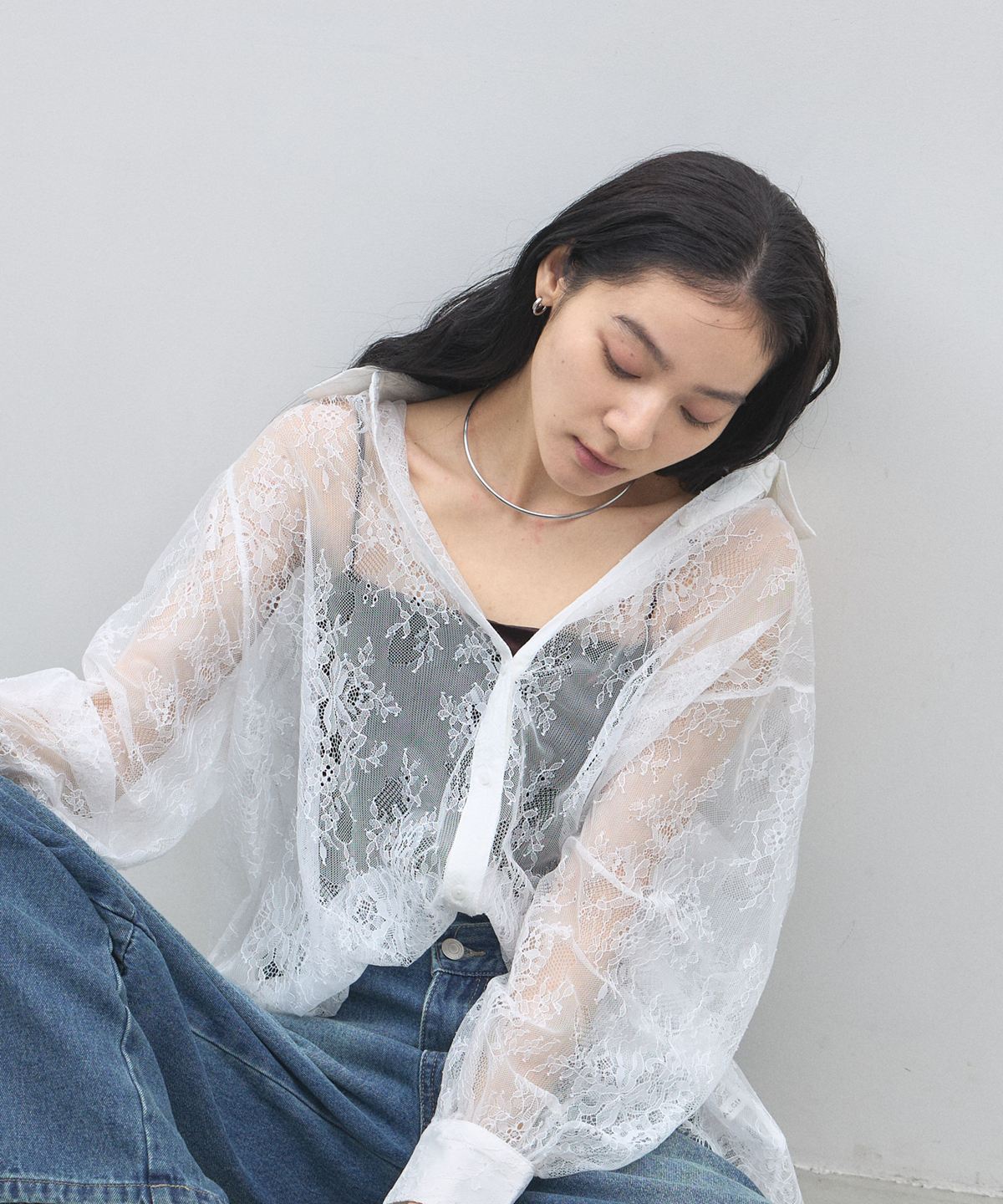 繊細な花柄の総レースが目を惹く、エレガントなシアーシャツです。