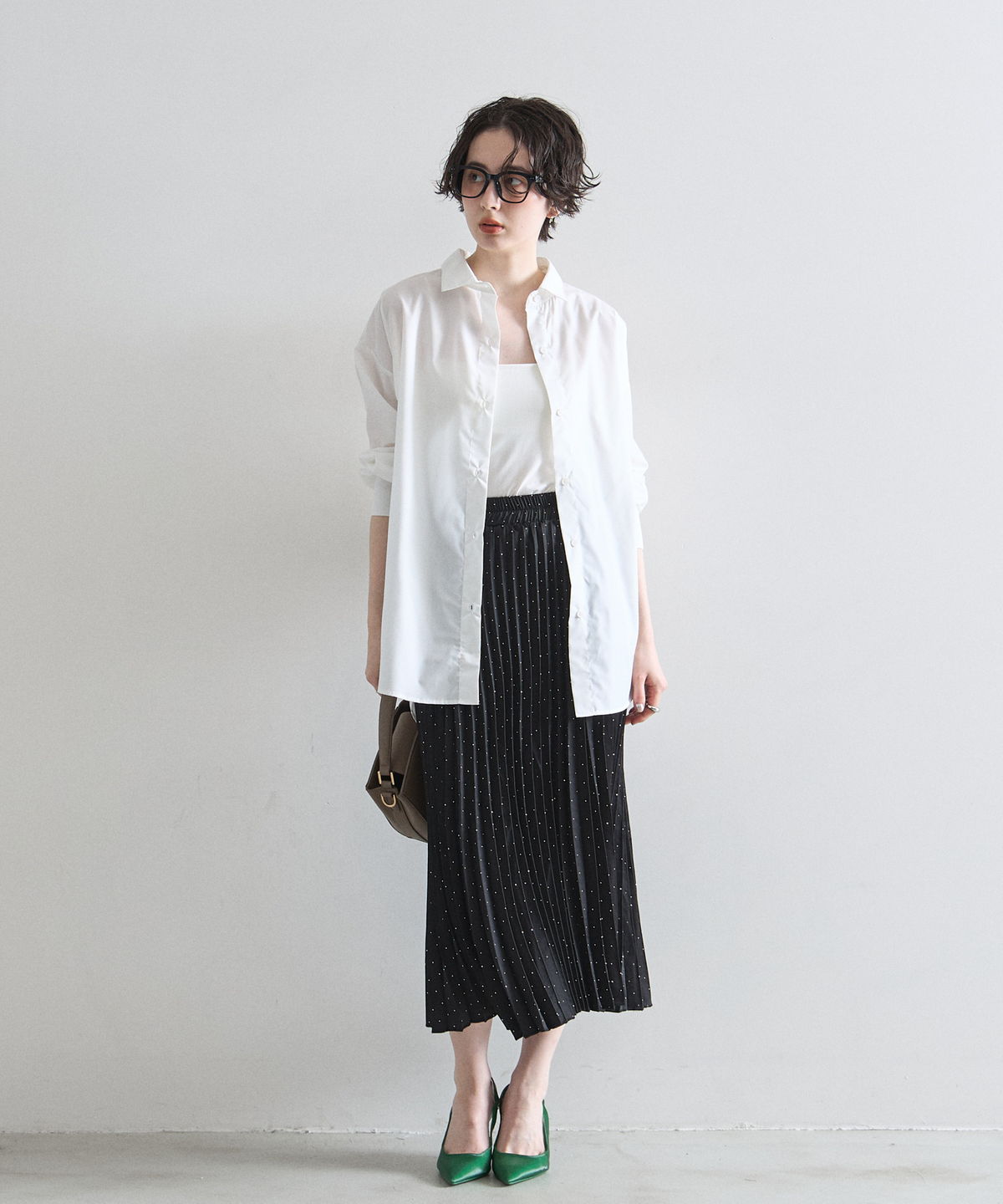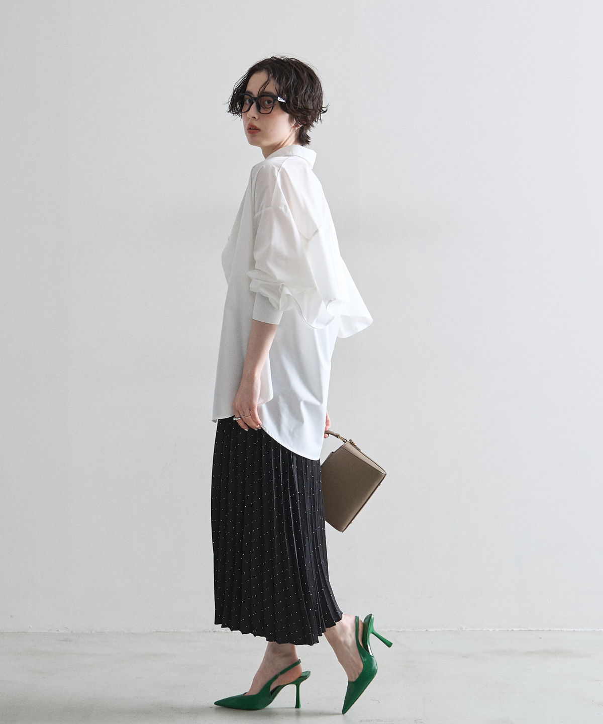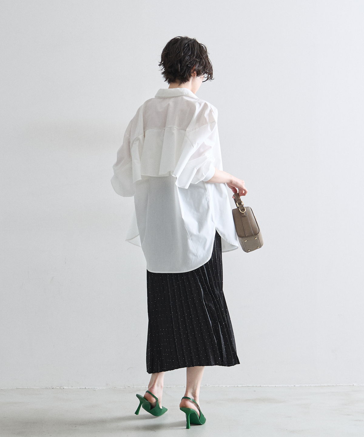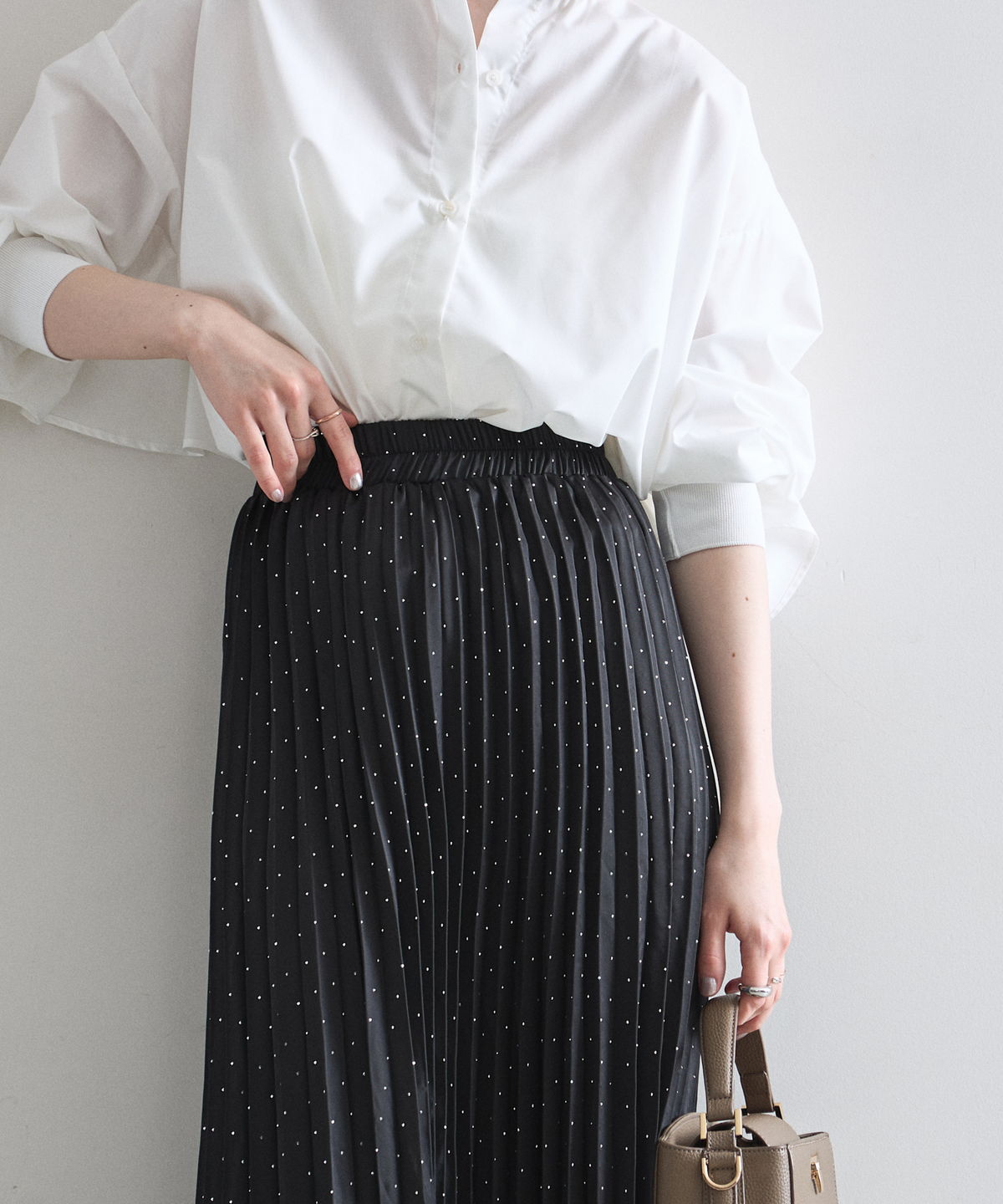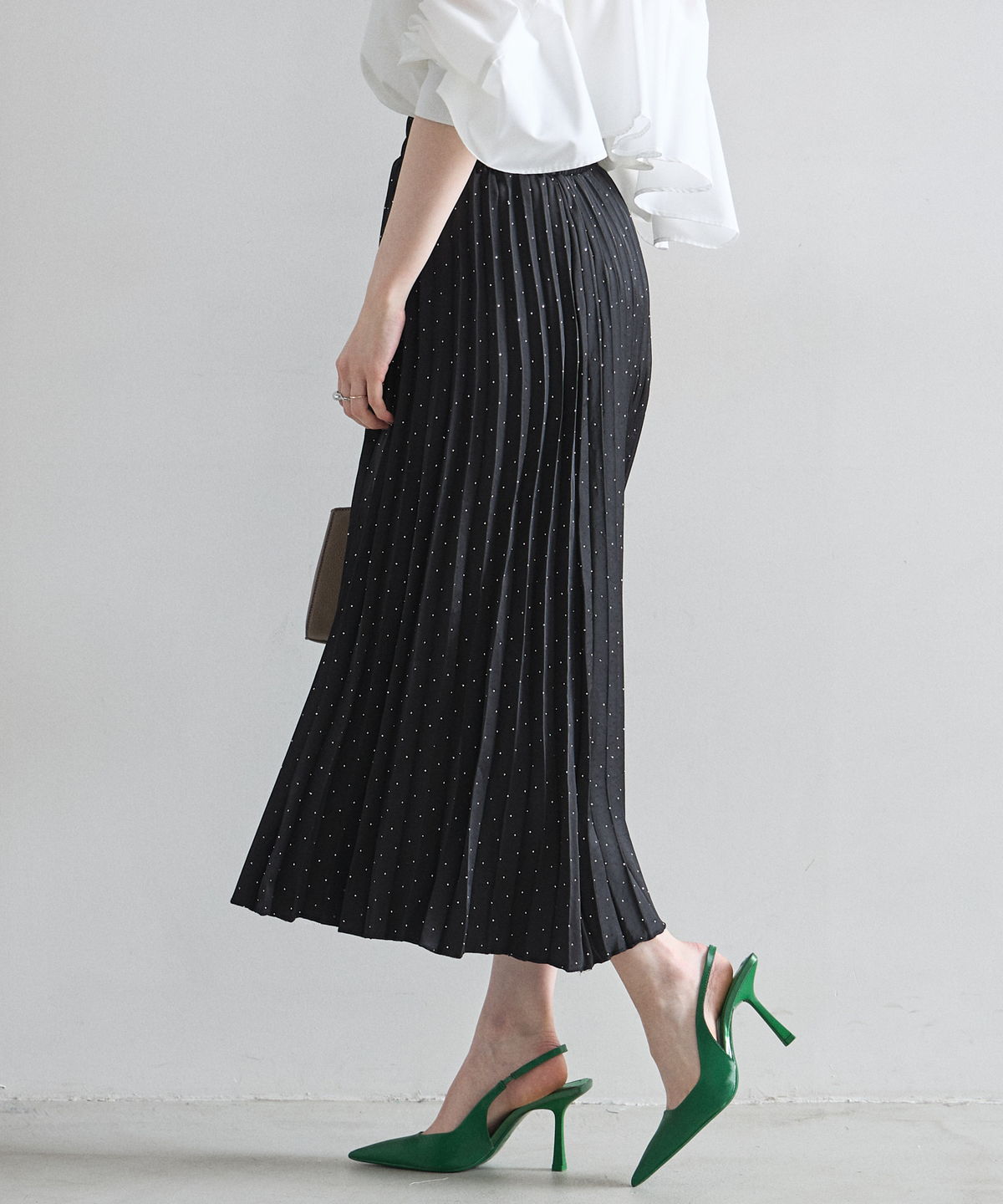 控えめなドット柄なので甘くなりすぎず、動くたびに軽やかに揺れる裾が女性らしさを引き立てます。