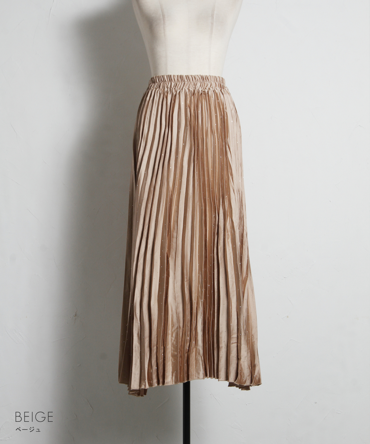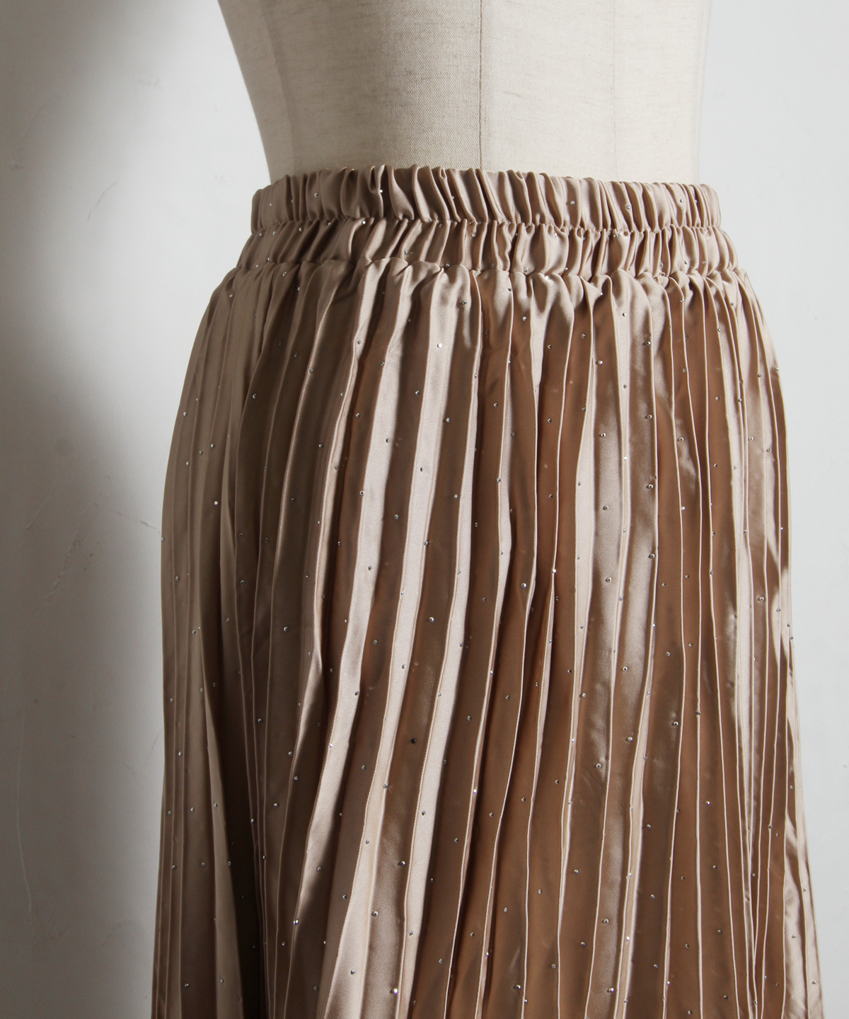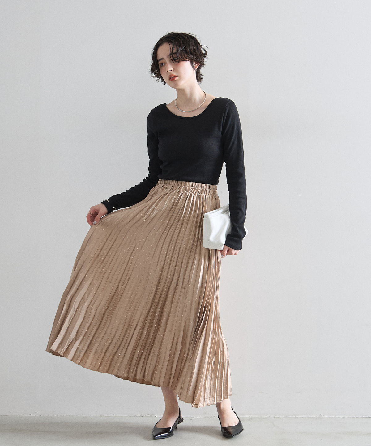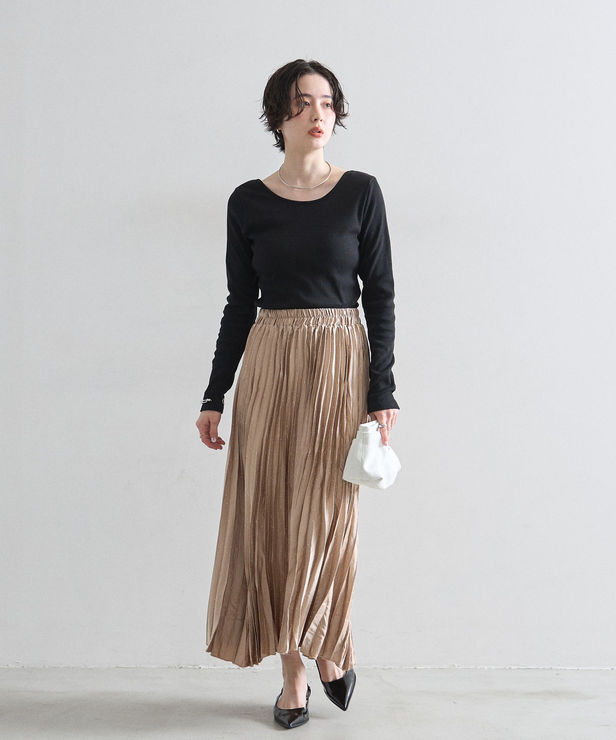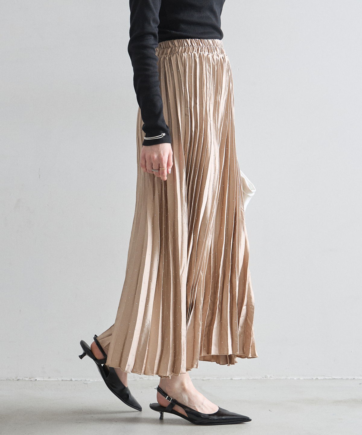 繊細なプリーツ加工が縦のラインを強調し、すっきりとしたシルエットを演出。