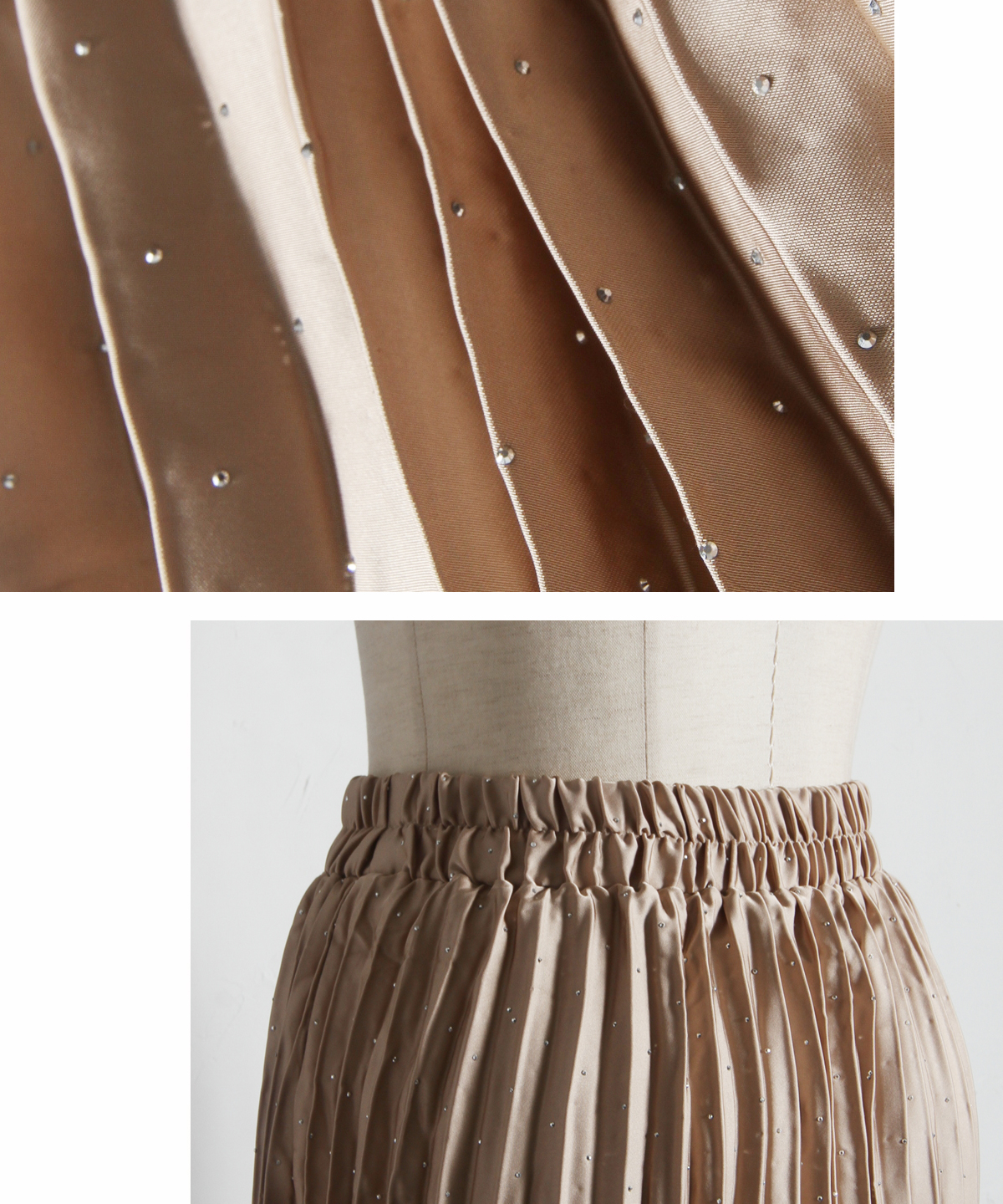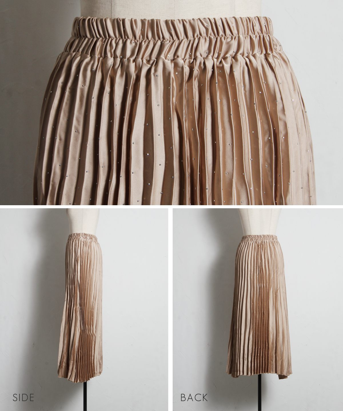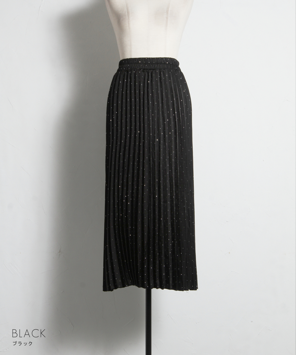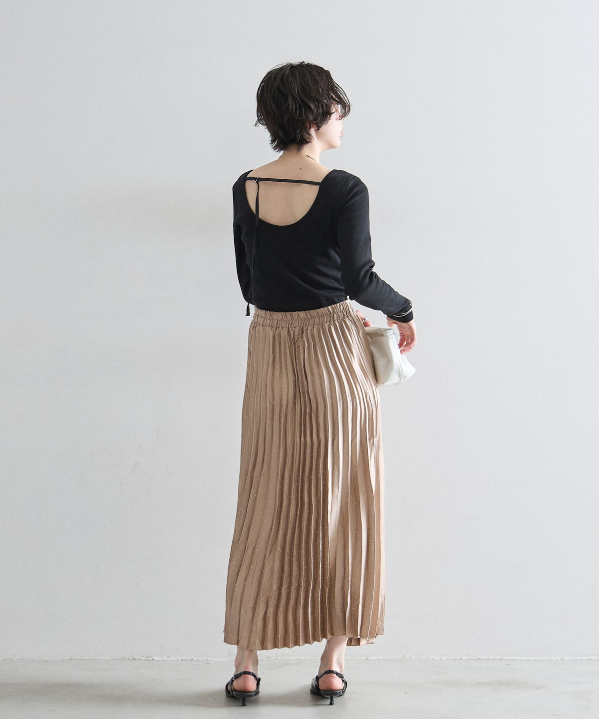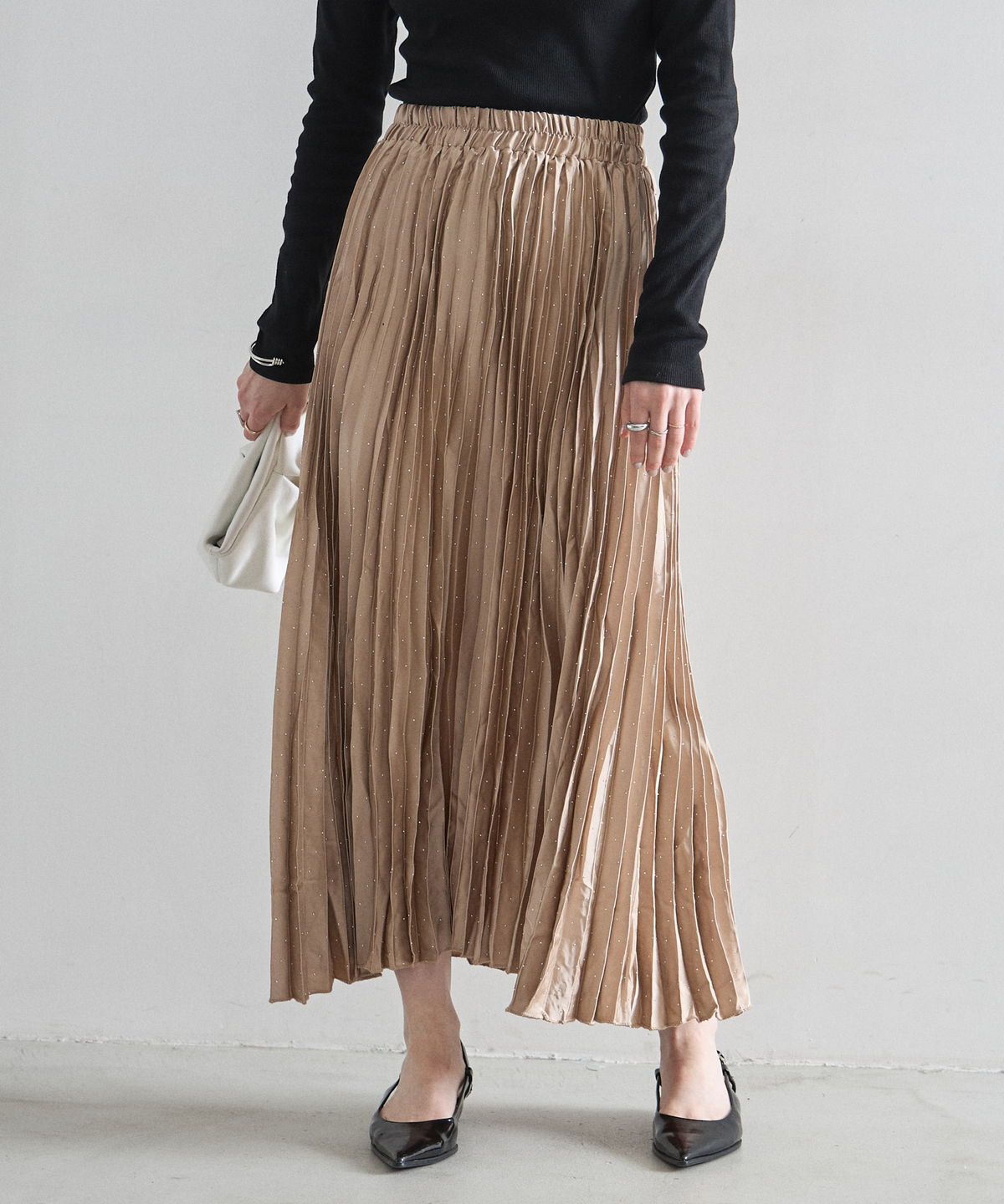 繊細なプリーツ加工が縦のラインを強調し、すっきりとしたシルエットを演出。