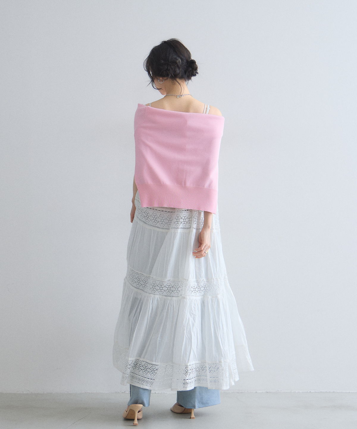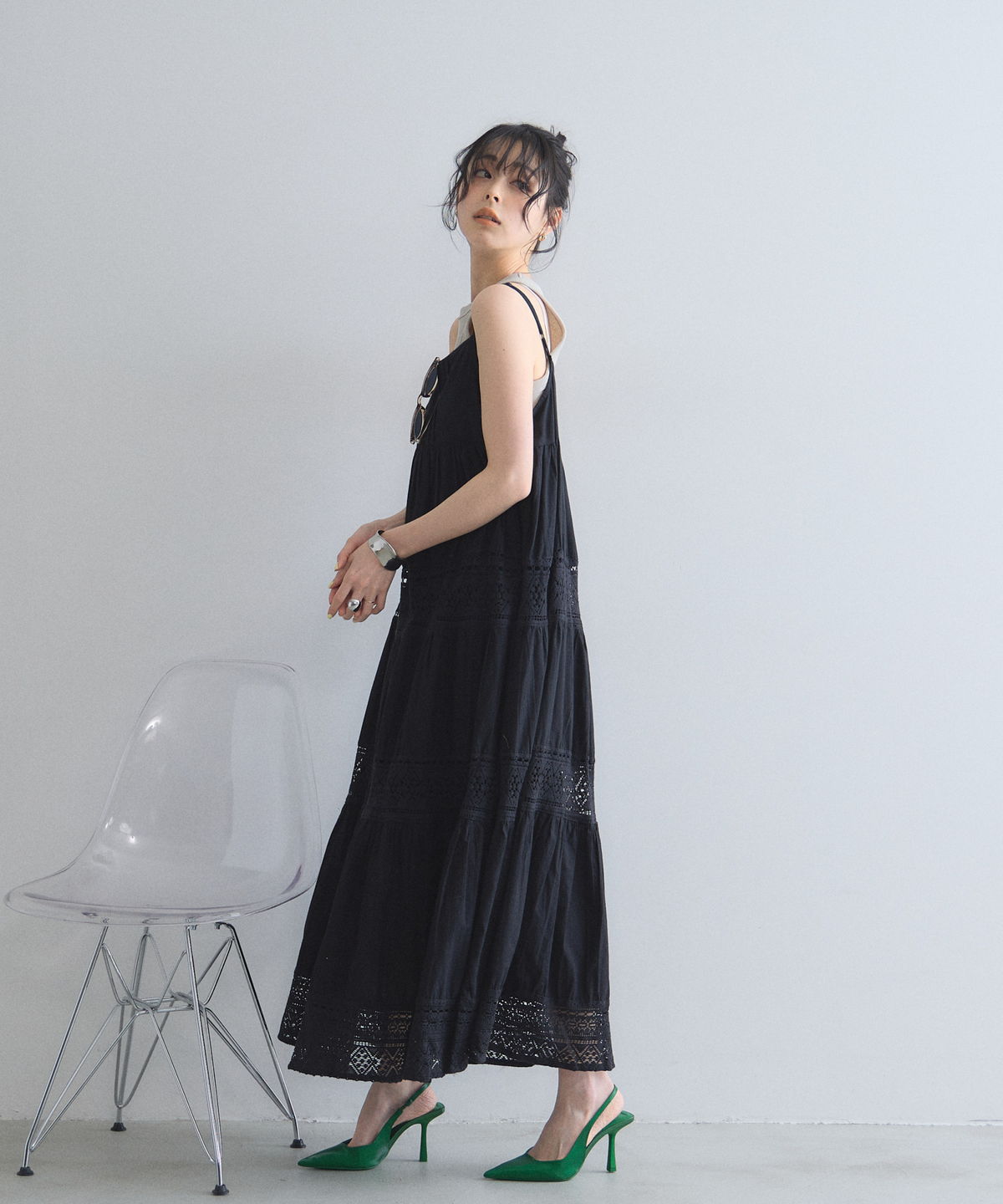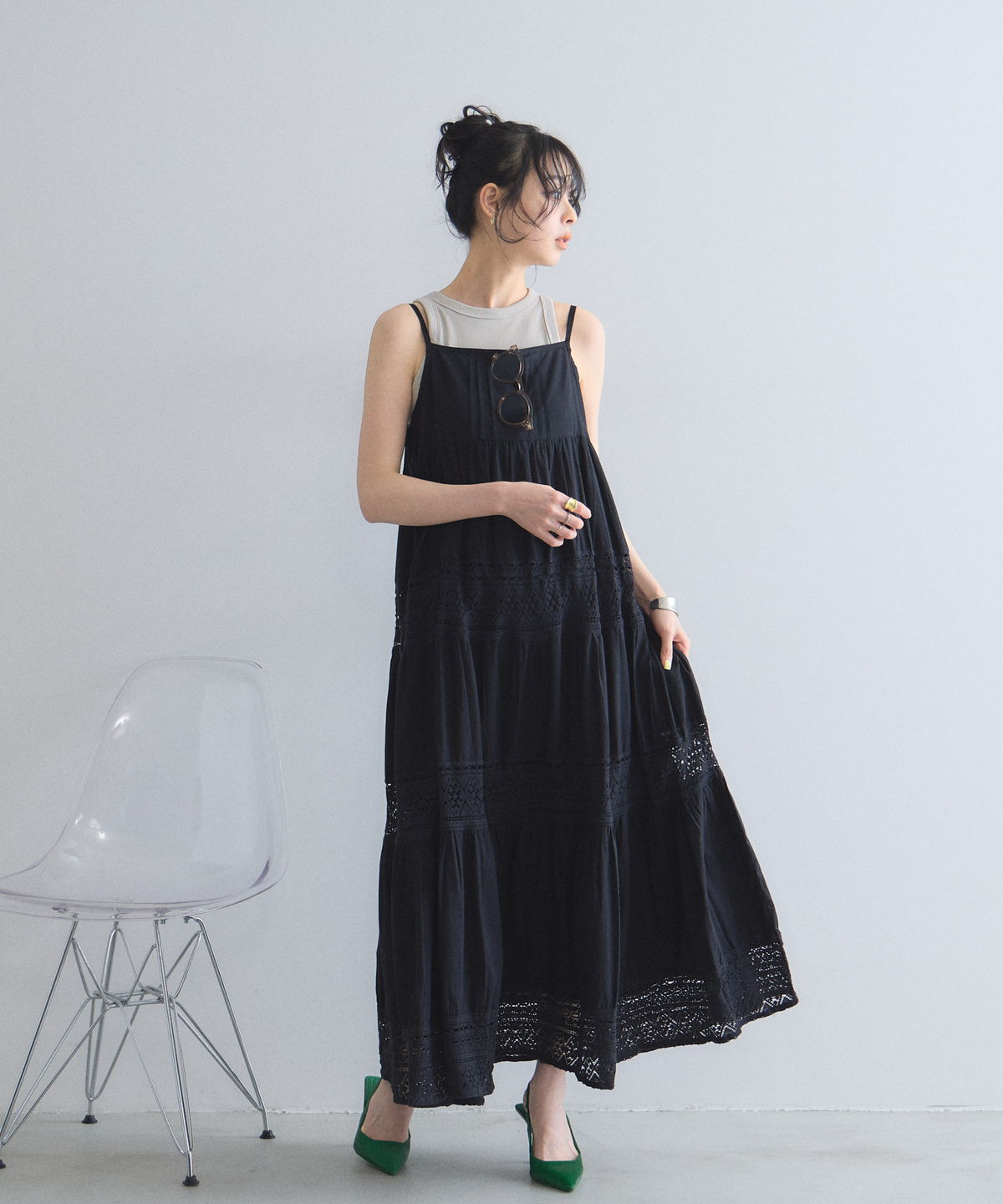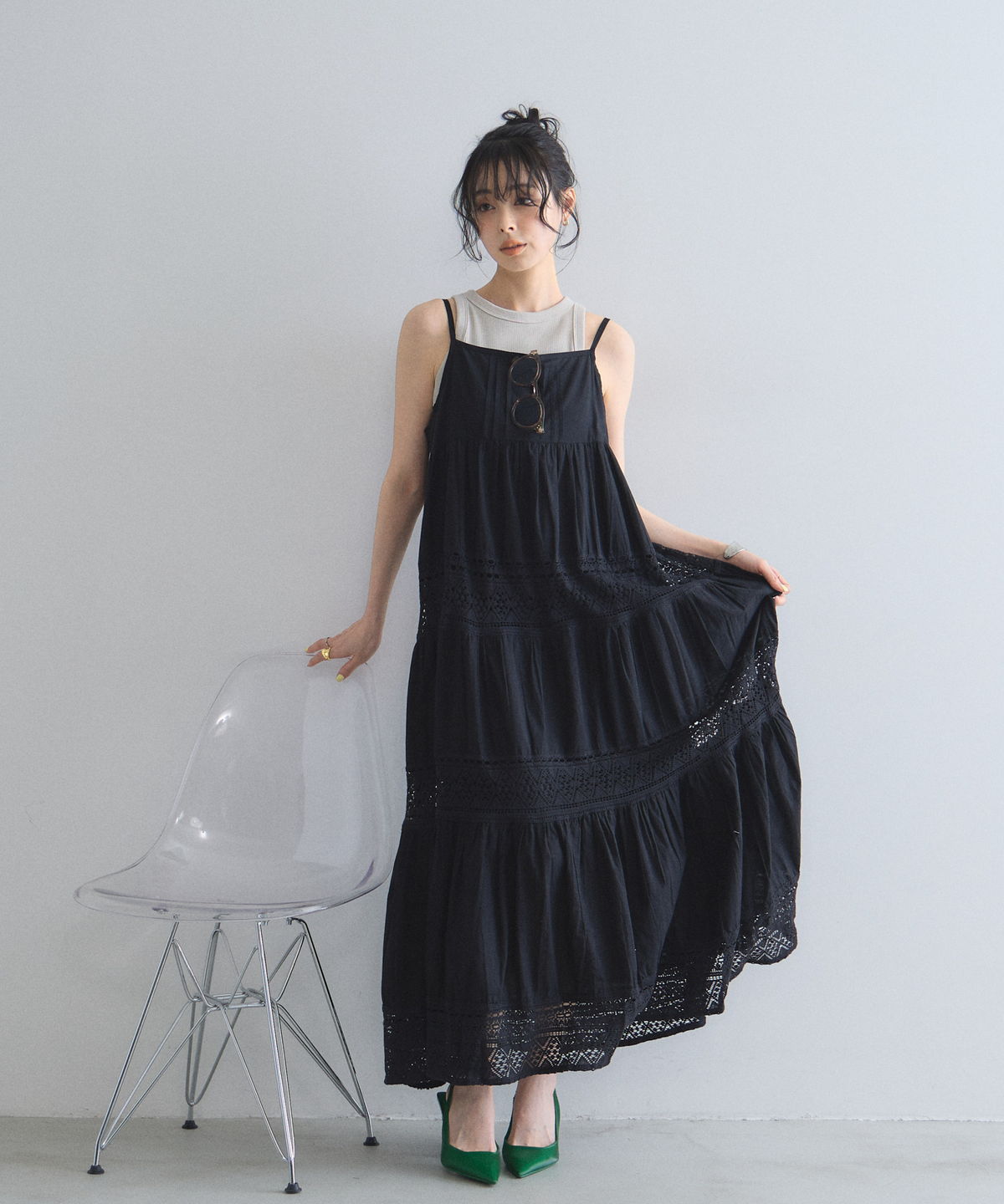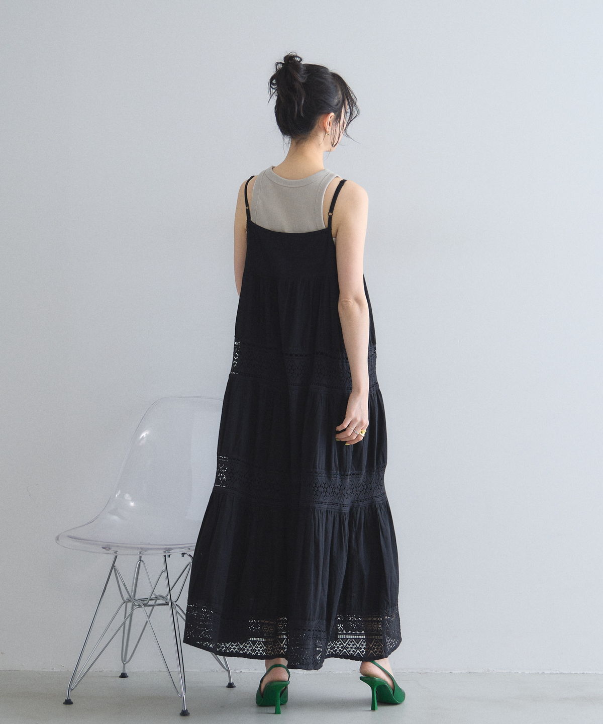 程よい透け感のレース切り替えが、ロング丈でも軽やかで涼しげな印象を与えます。
