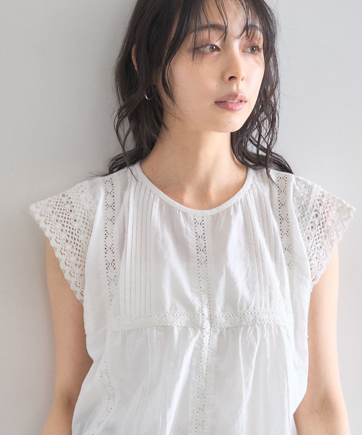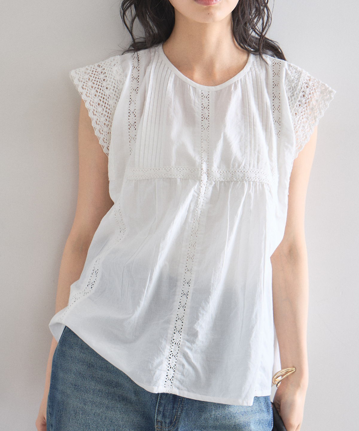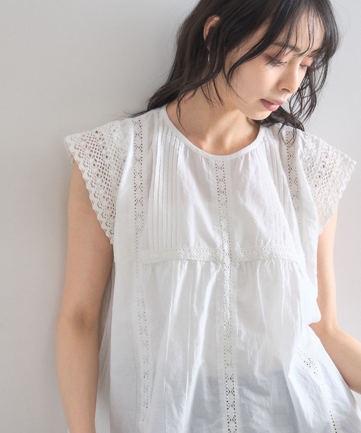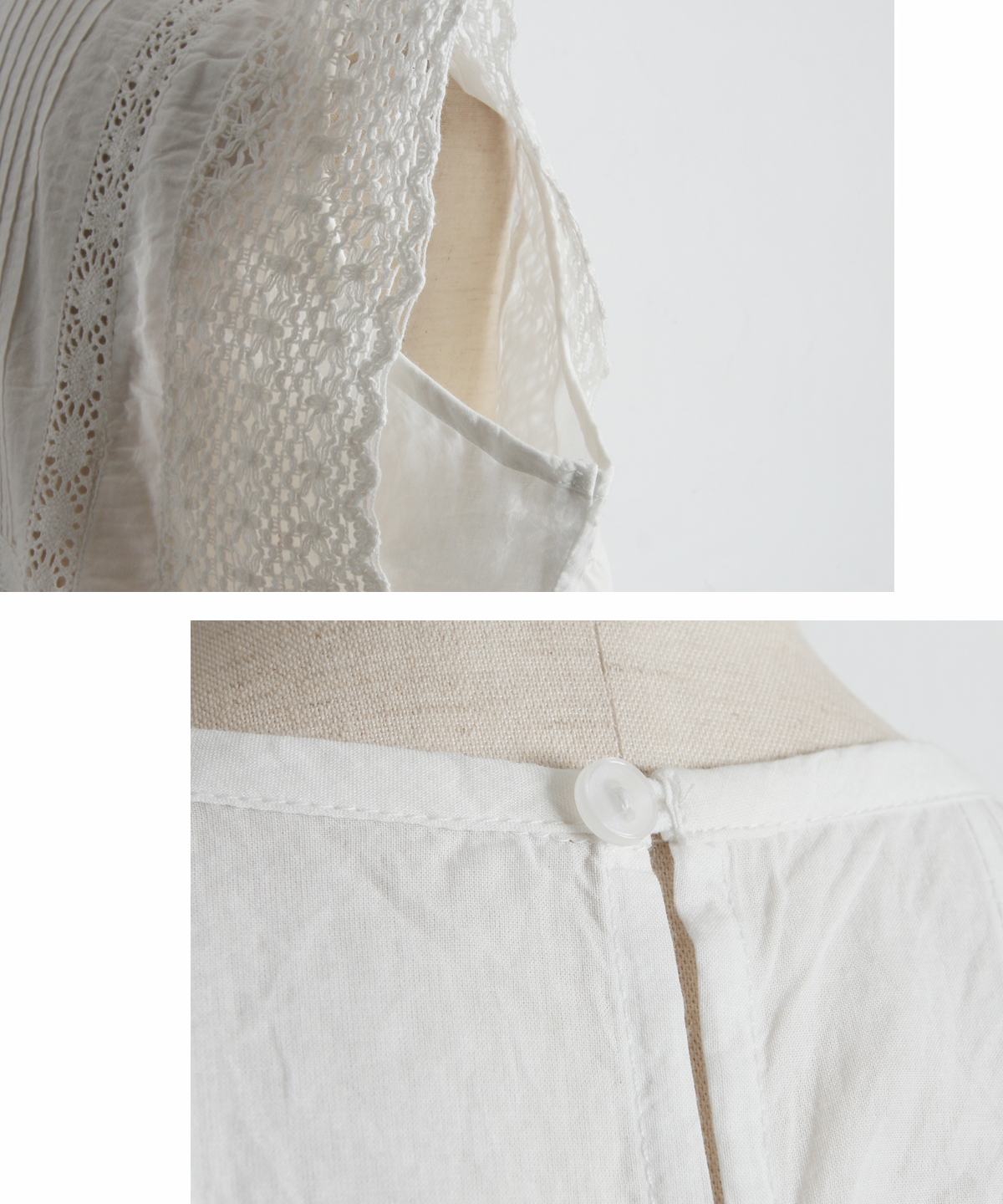 繊細なレースとピンタックが織りなす、クラシカルで贅沢なコットンブラウス。