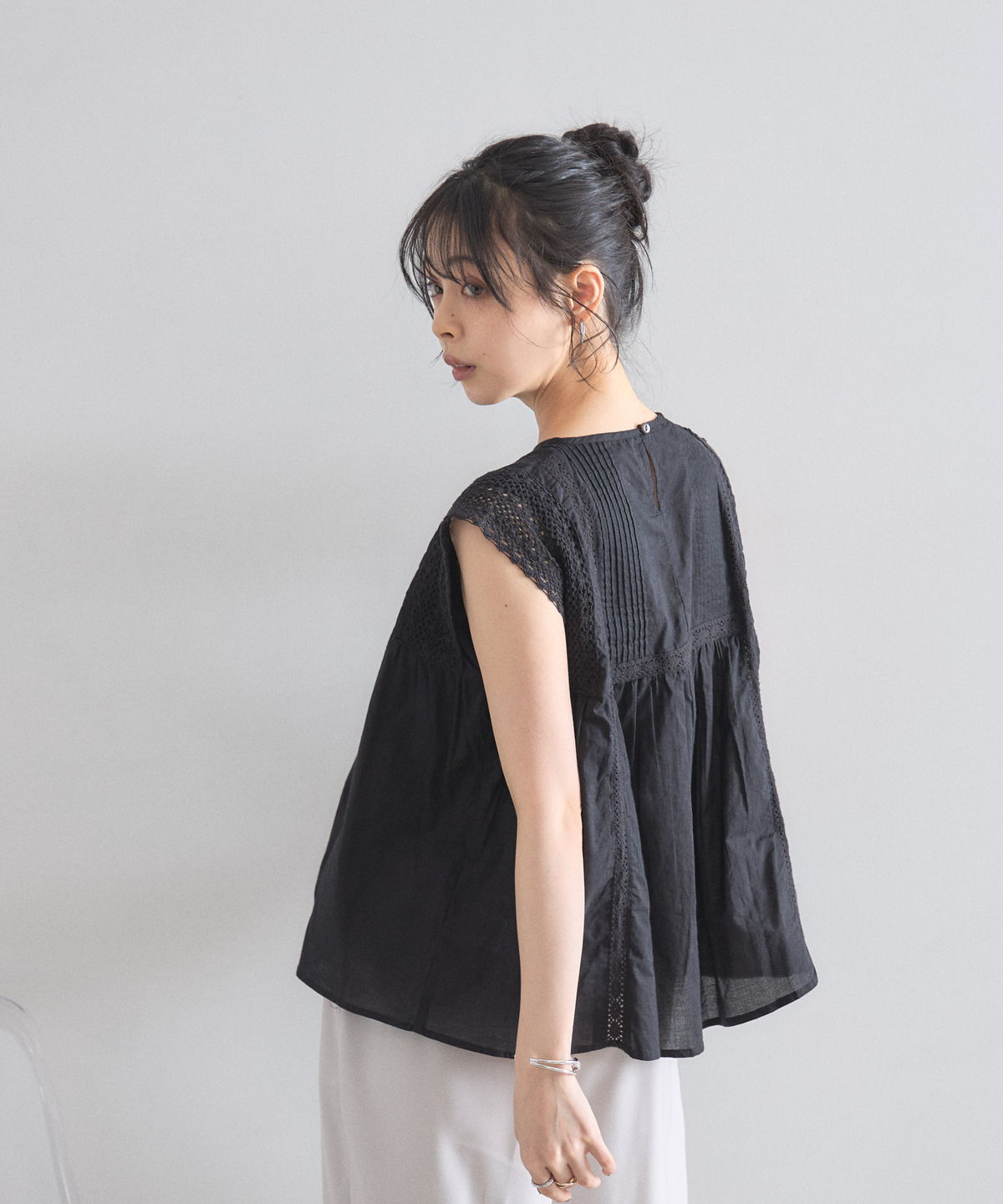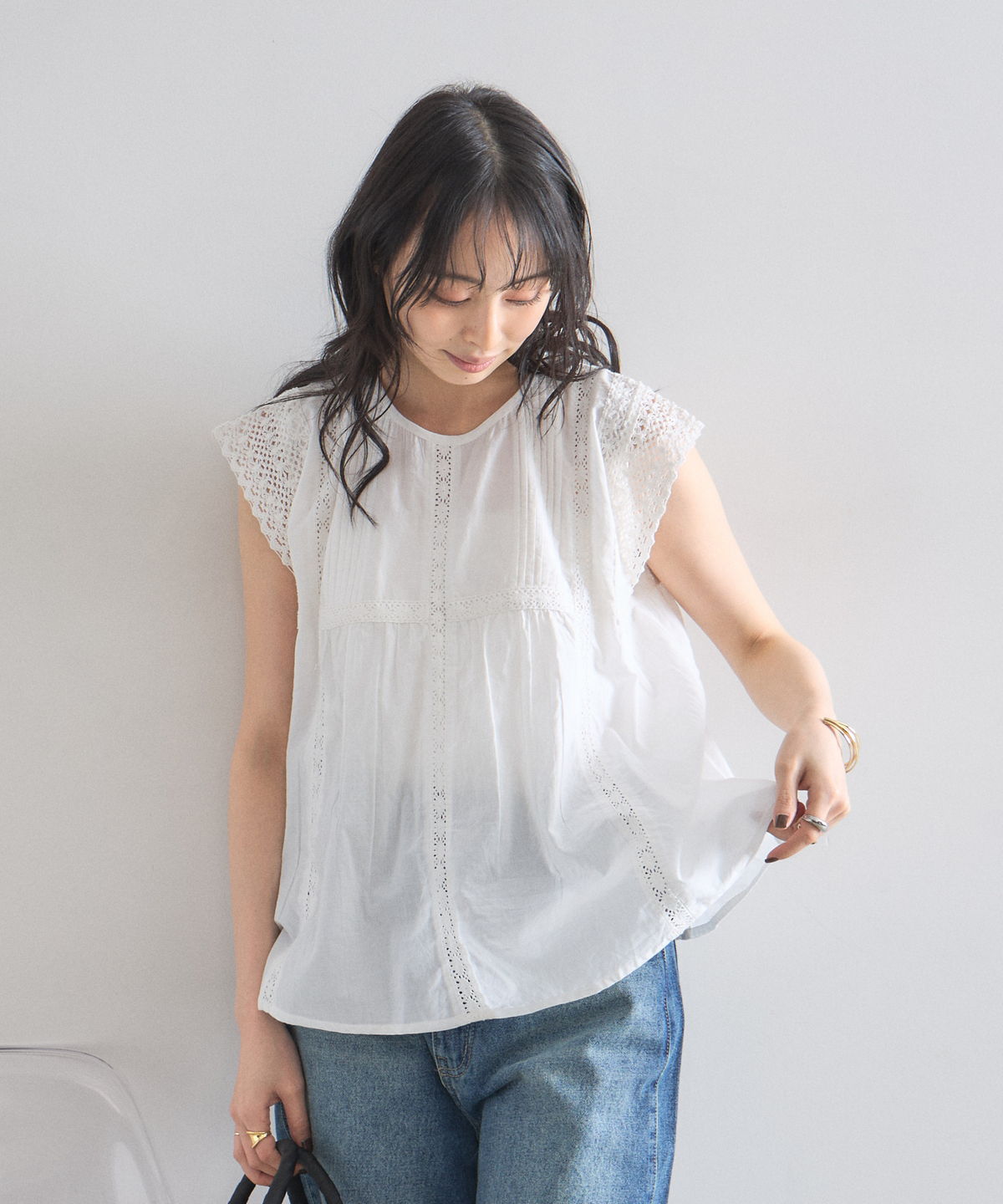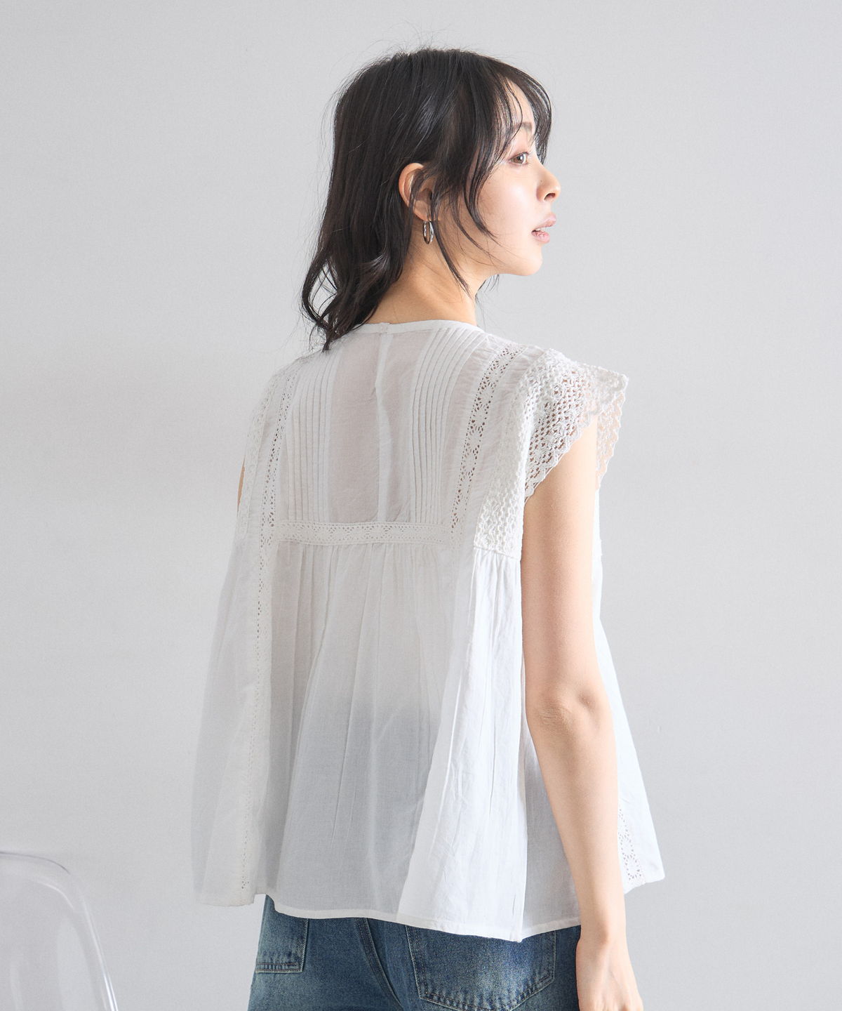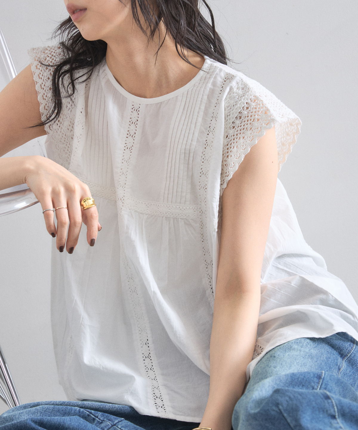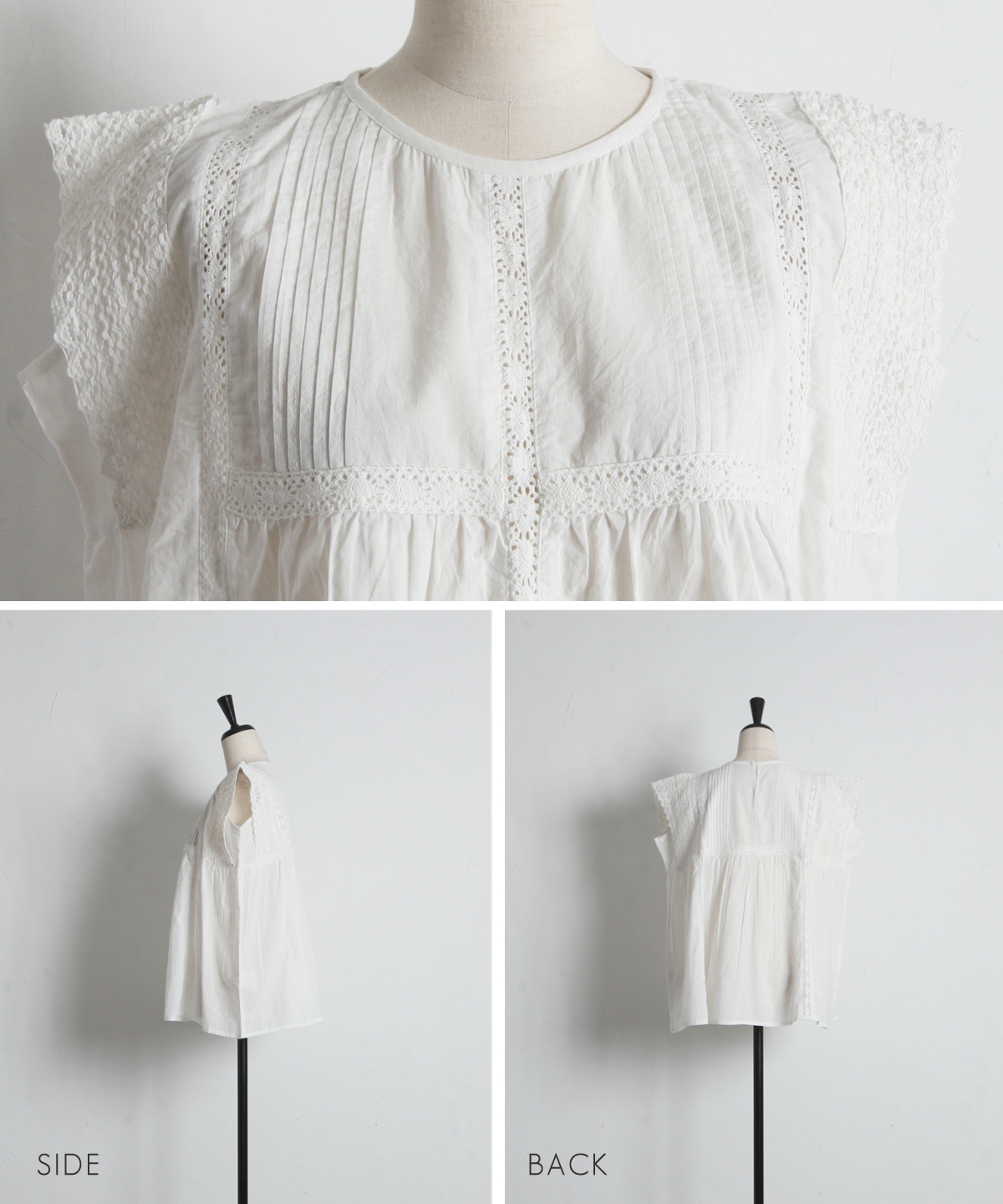 繊細なレースとピンタックが織りなす、クラシカルで贅沢なコットンブラウス。