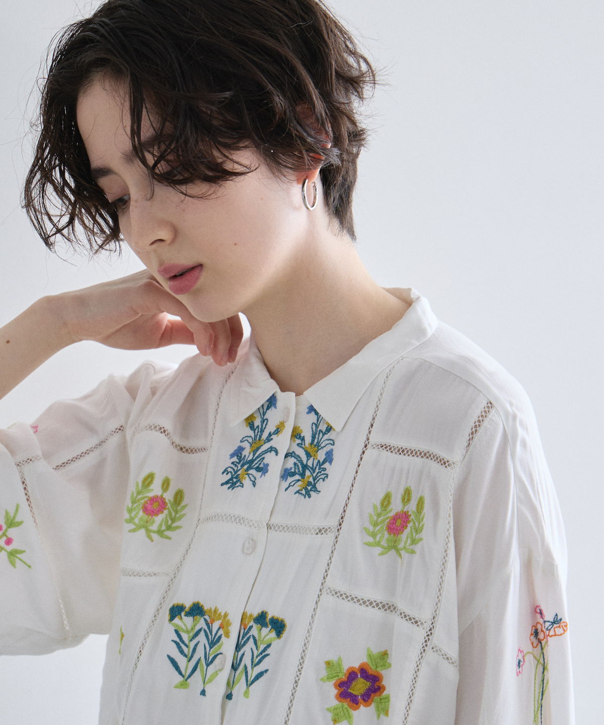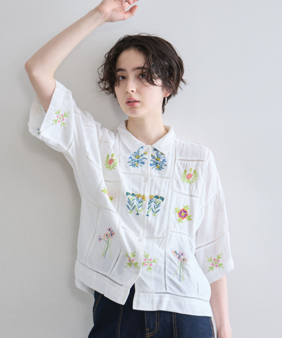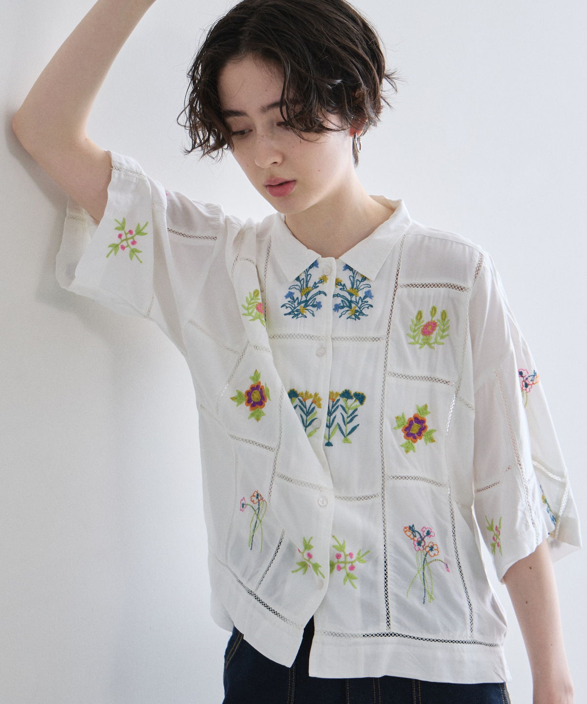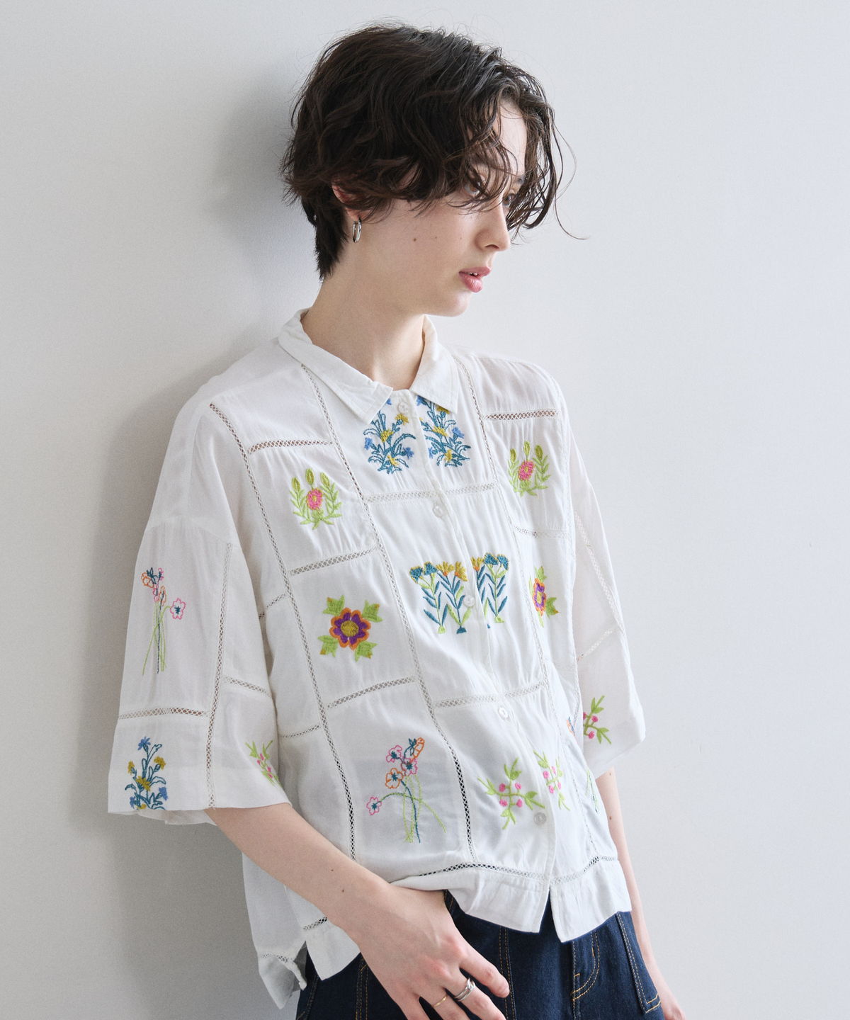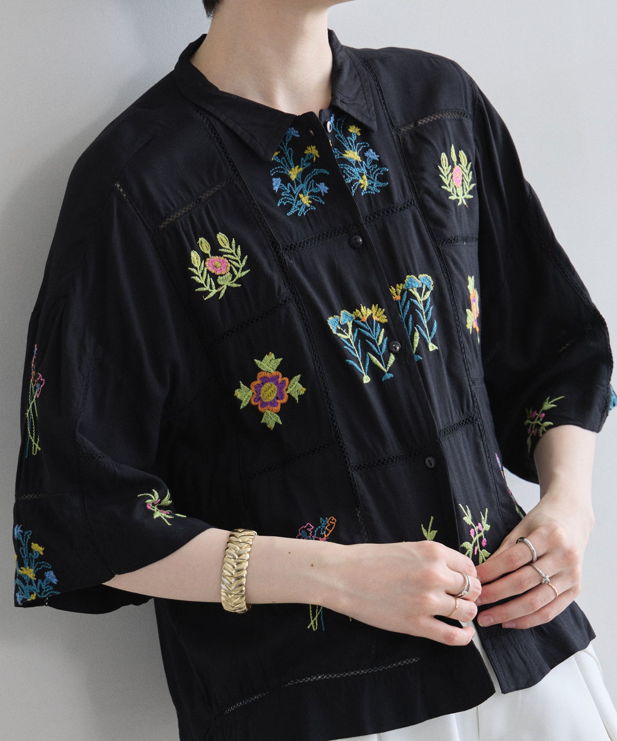 ノスタルジックな草花刺繍が心をくすぐる、大人可愛いフラワーエンブロイダリーシャツ。