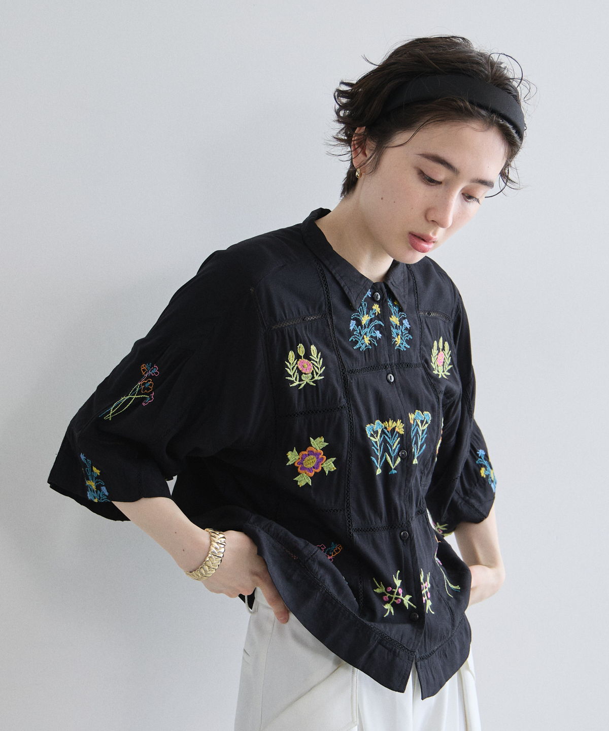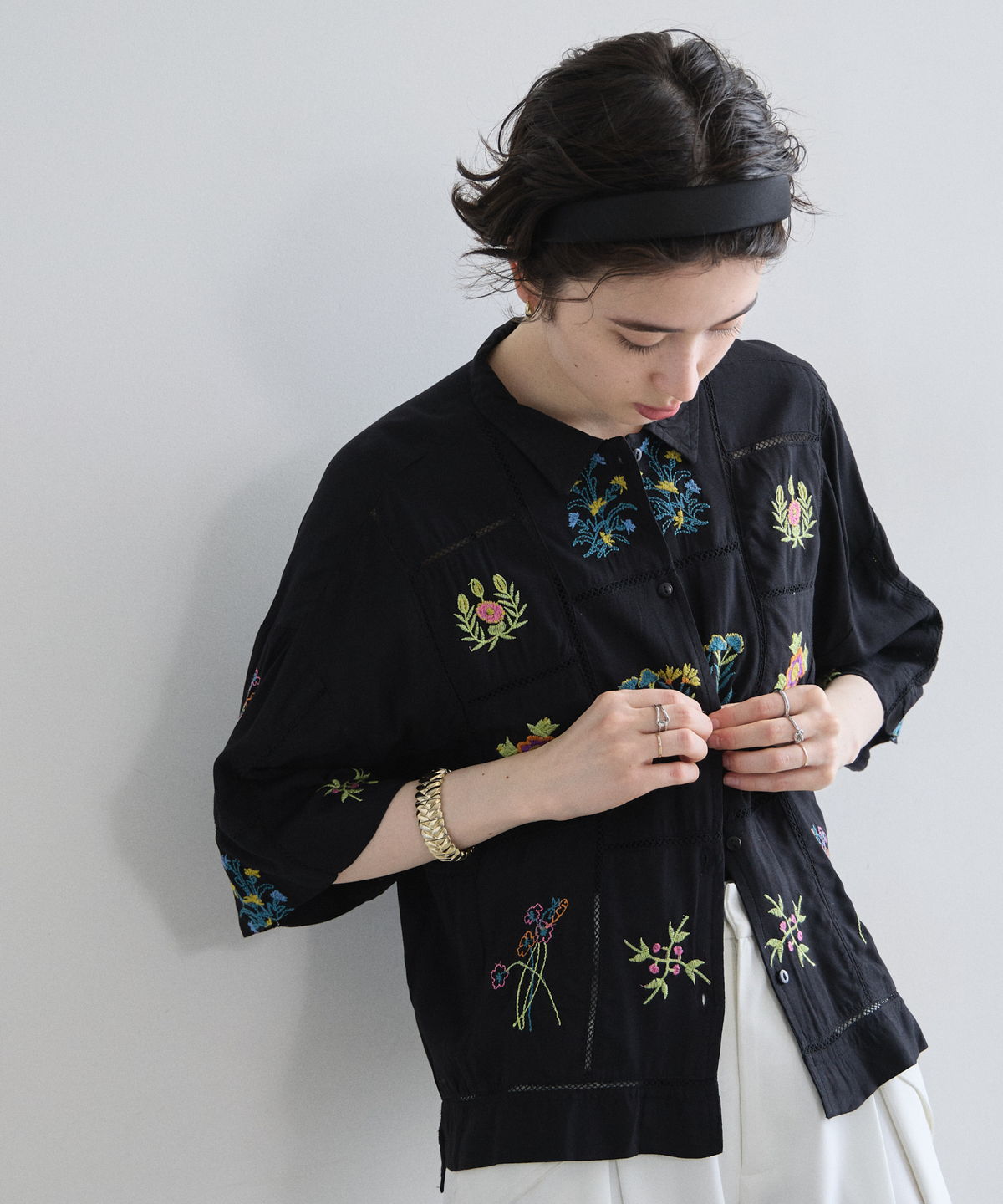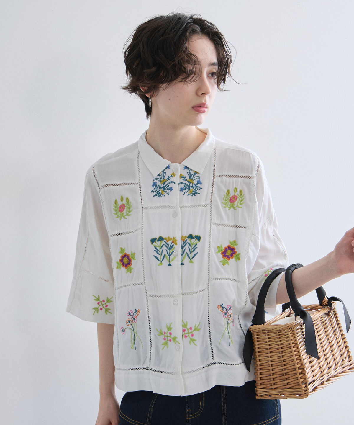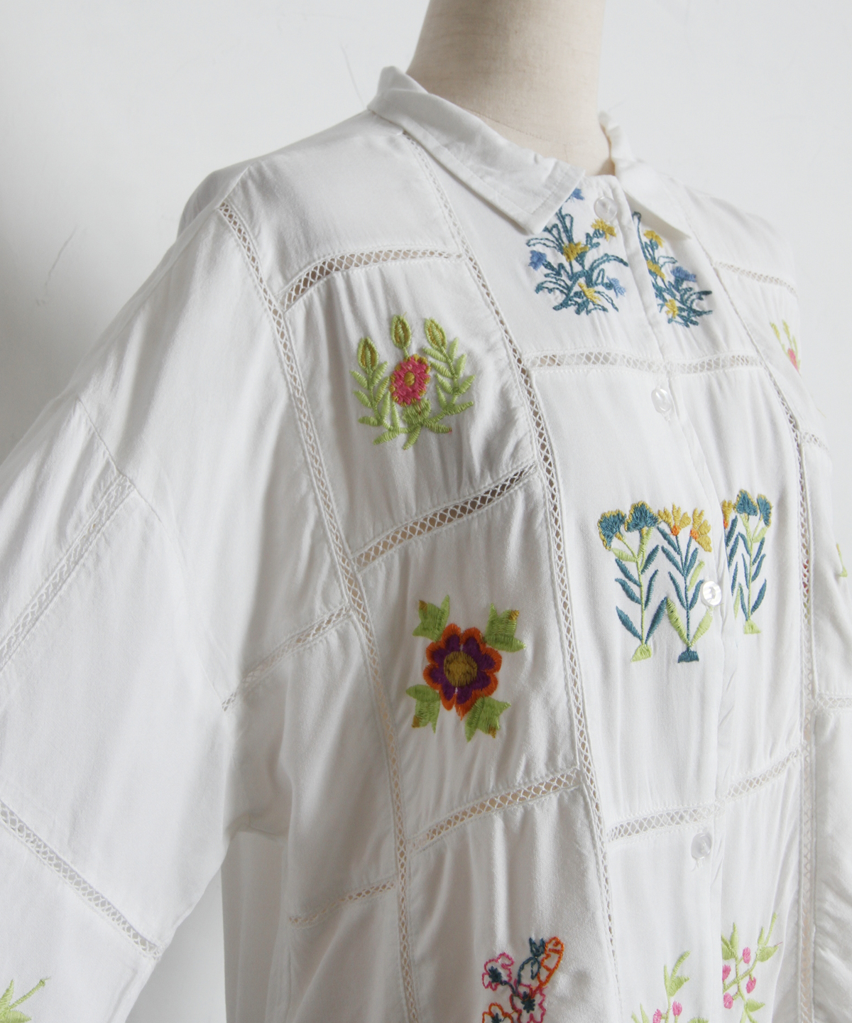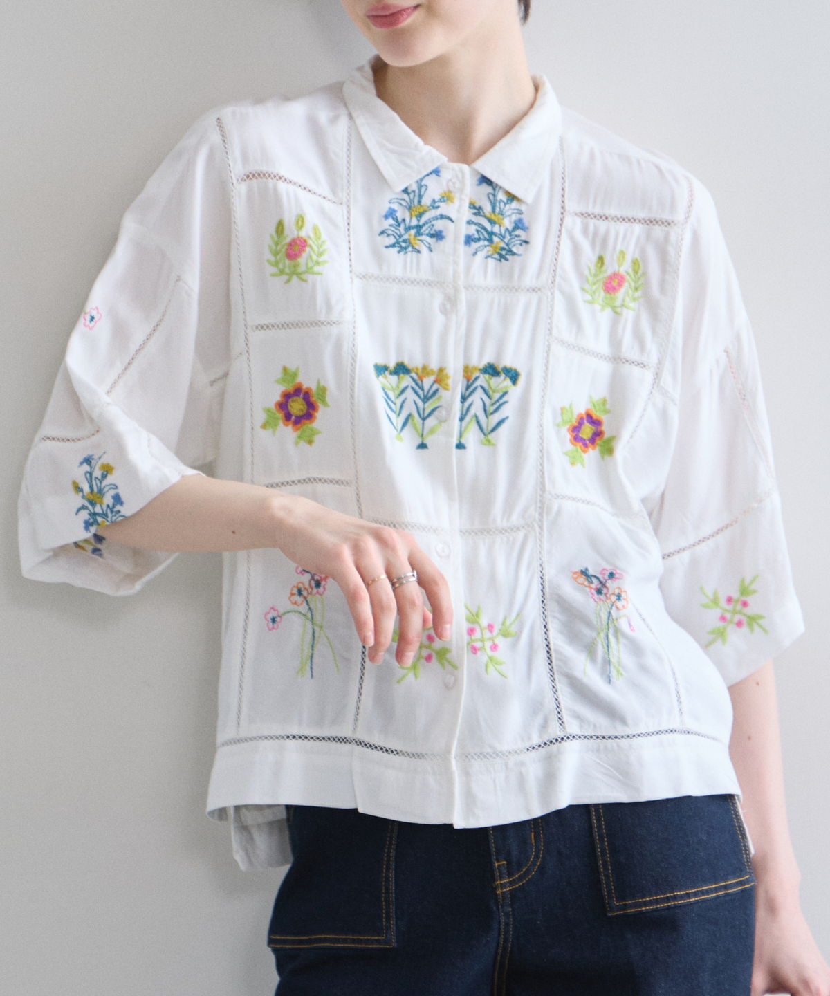 ノスタルジックな草花刺繍が心をくすぐる、大人可愛いフラワーエンブロイダリーシャツ。