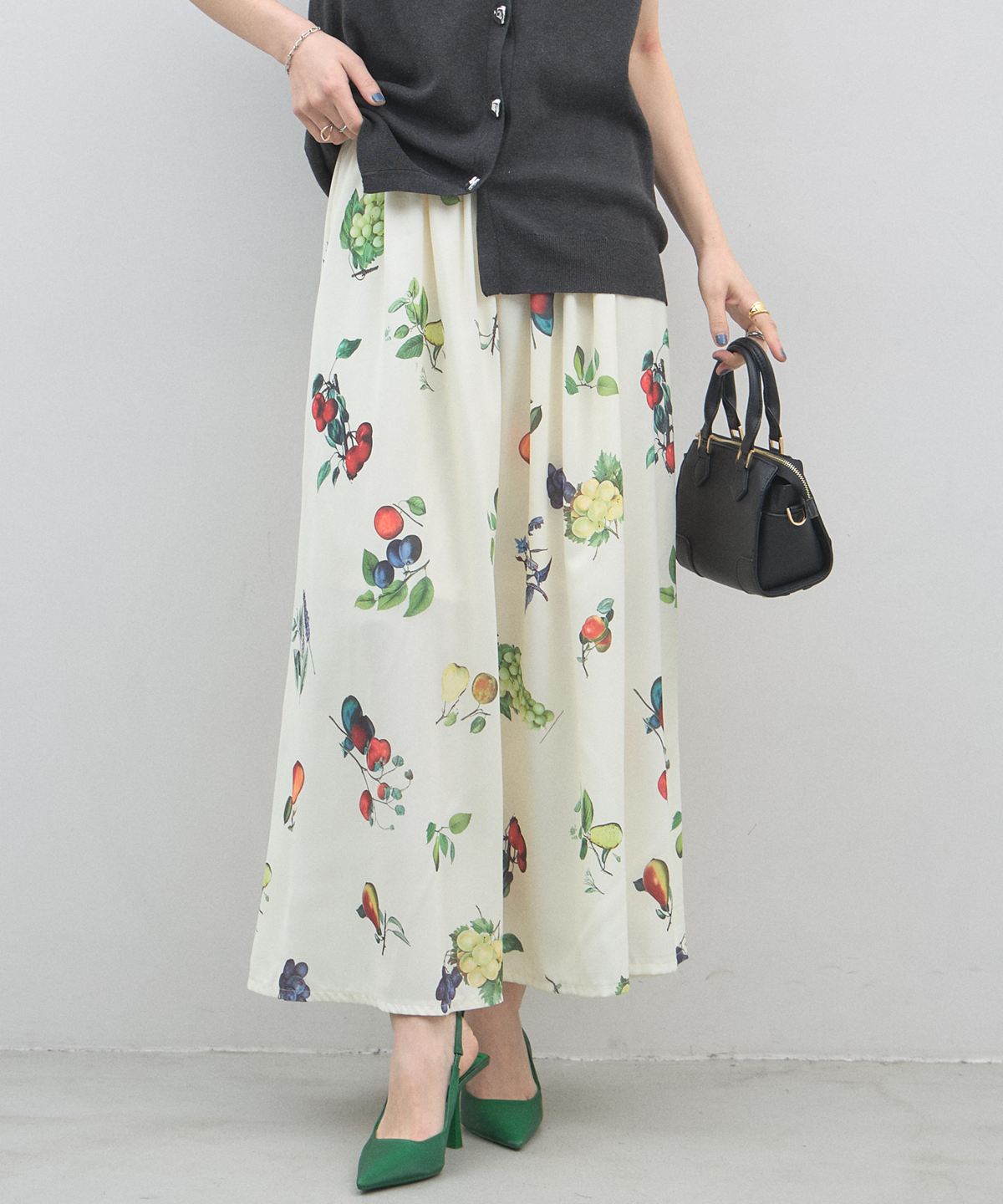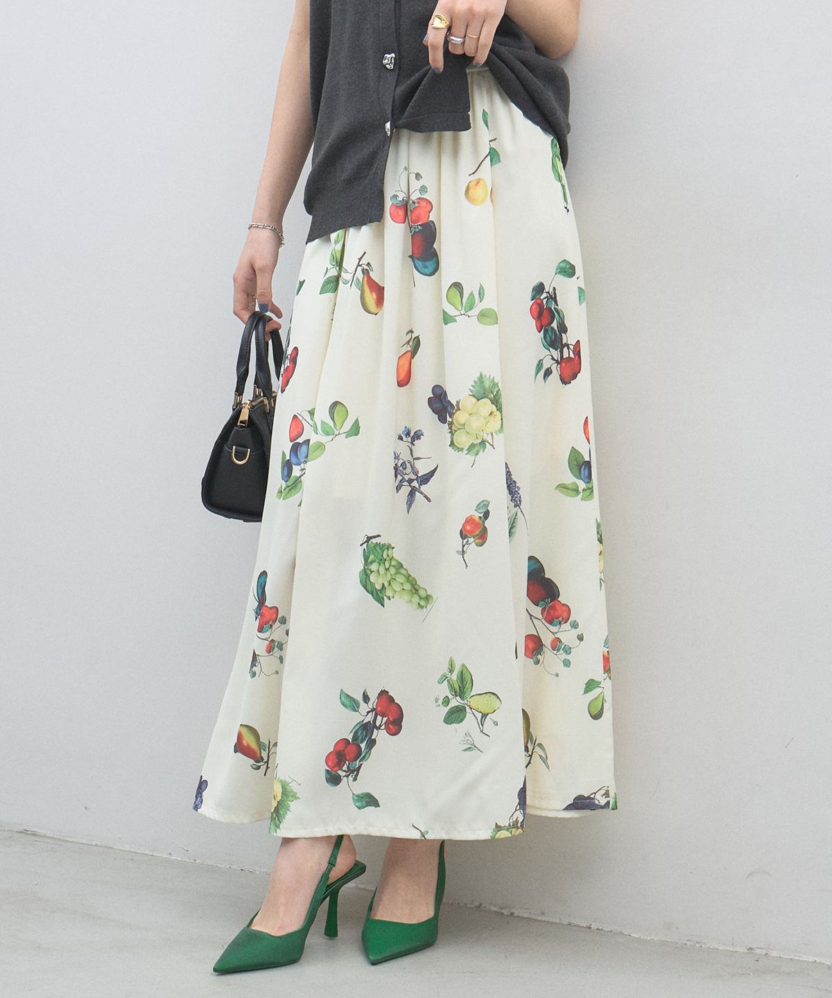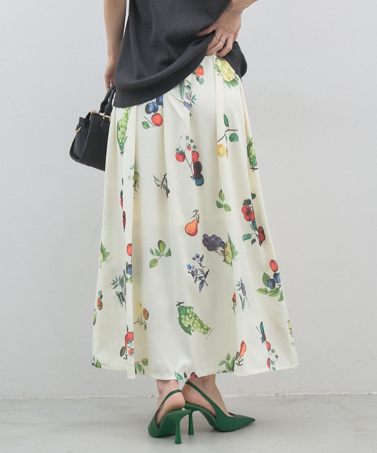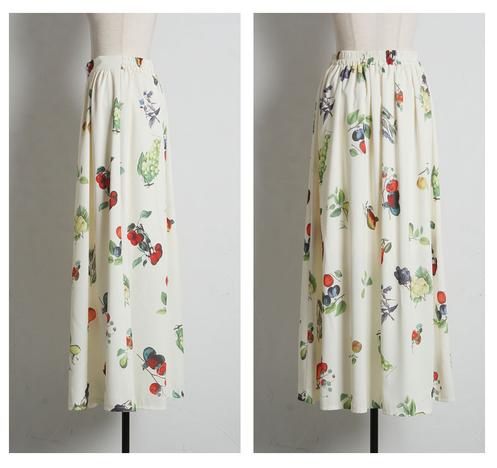 水彩画のようなフルーツ柄が華やかな印象を与える主役級スカート。