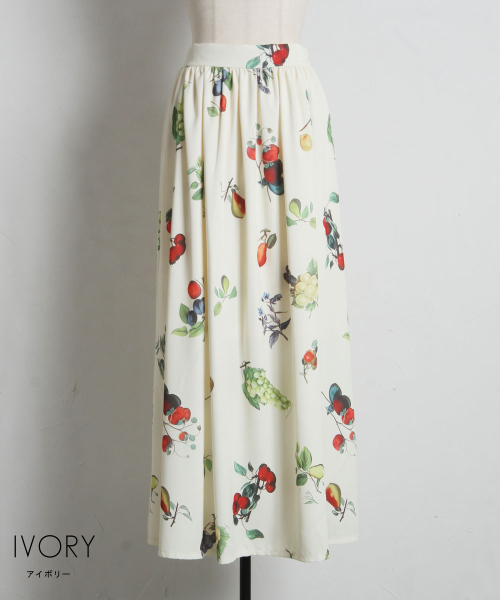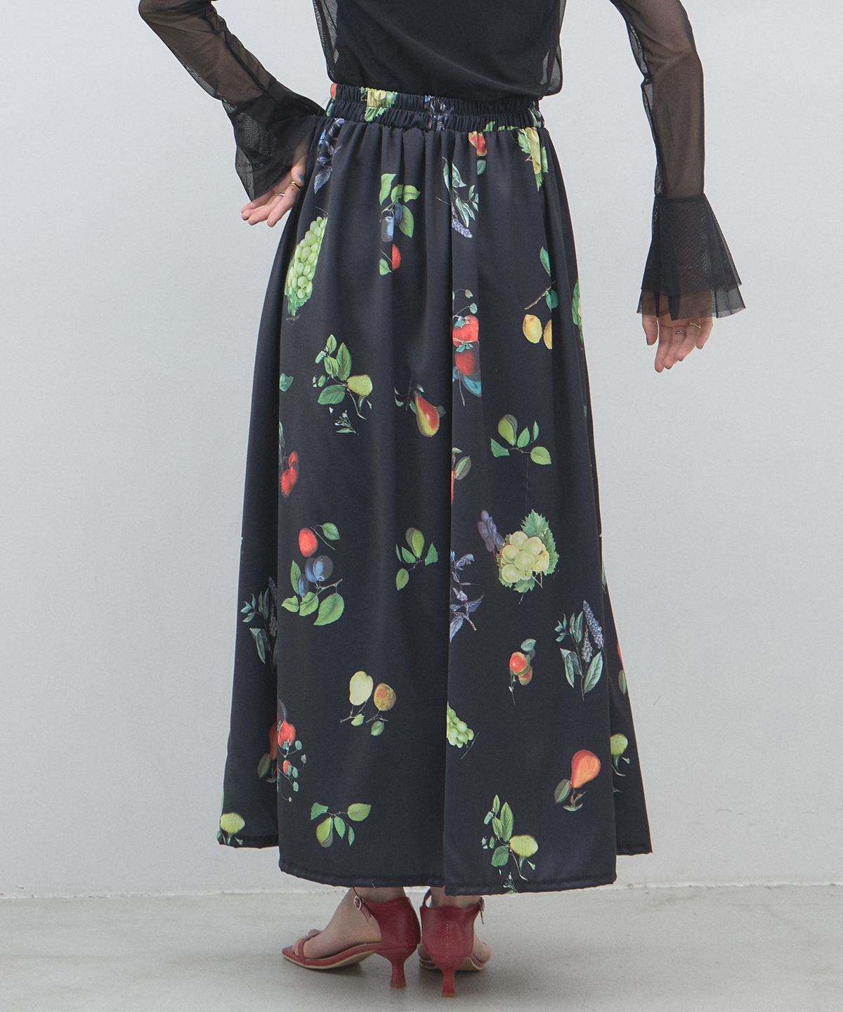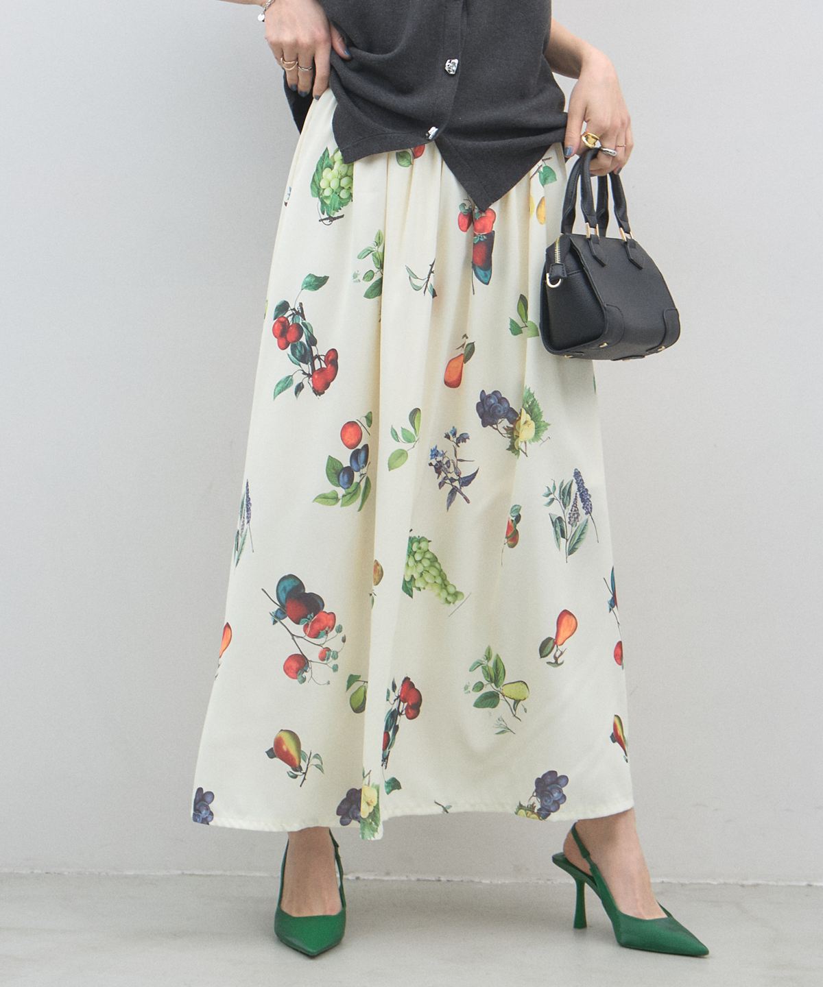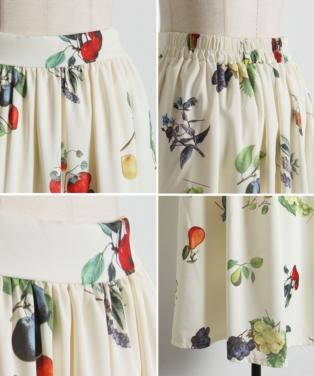 水彩画のようなフルーツ柄が華やかな印象を与える主役級スカート。