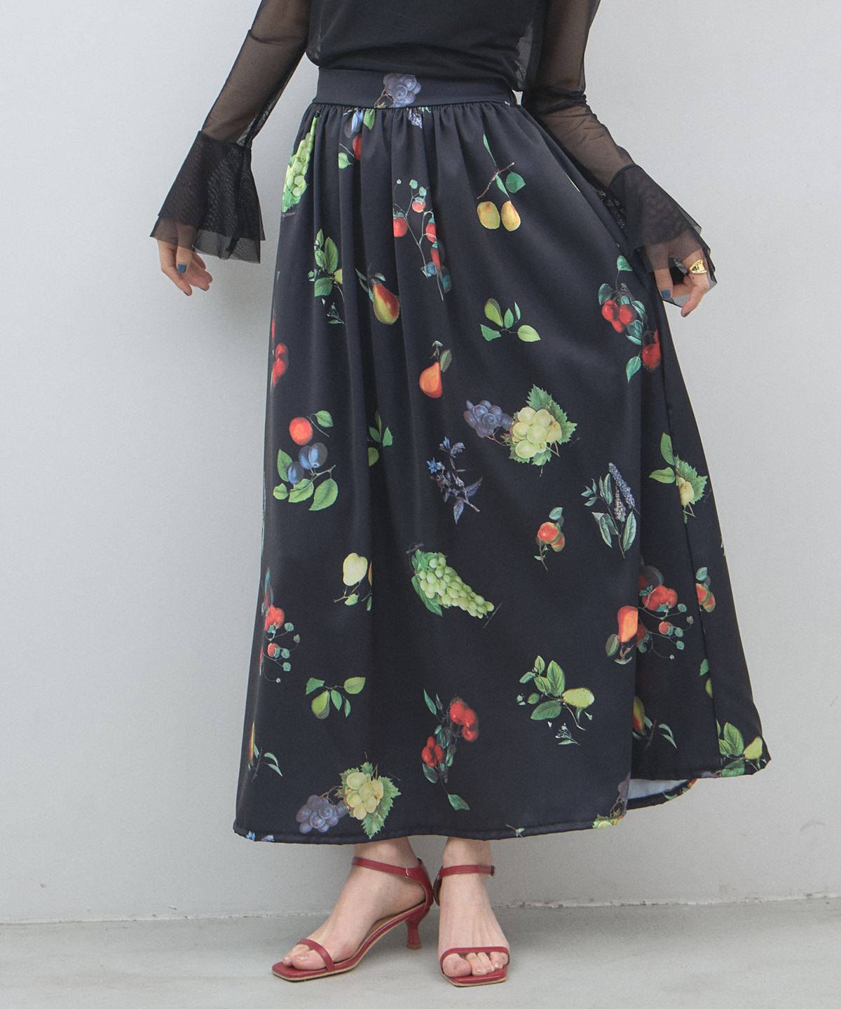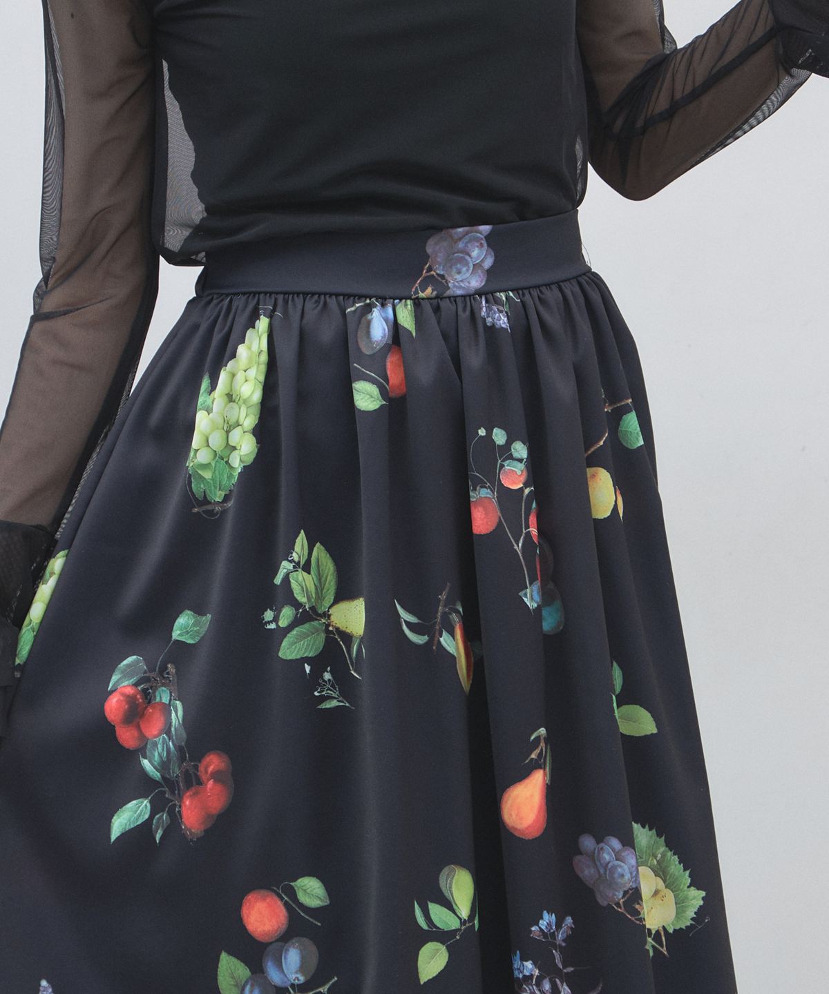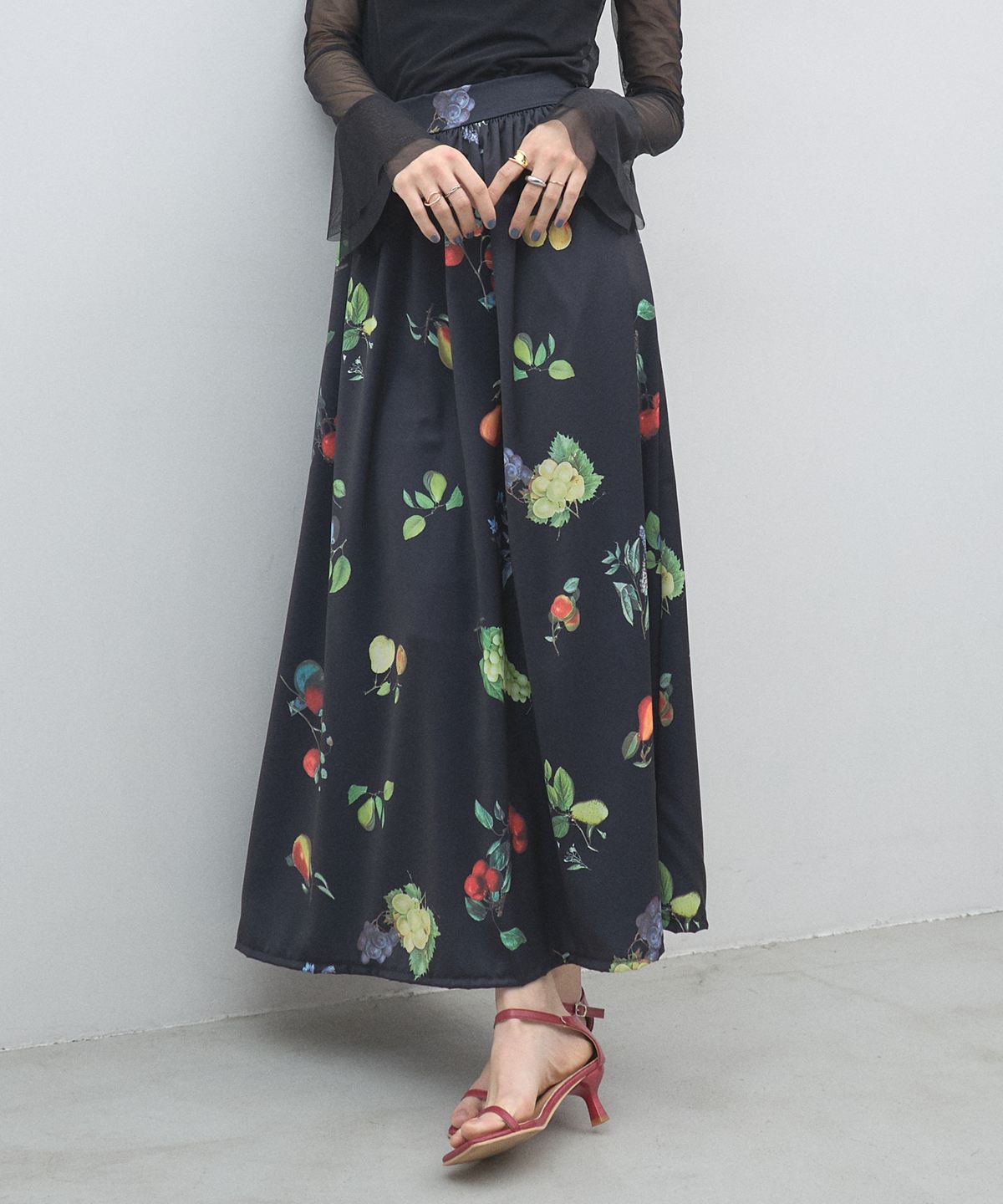 鮮やかなフルーツ柄が目を惹く、大人フェミニンなフレアスカート。