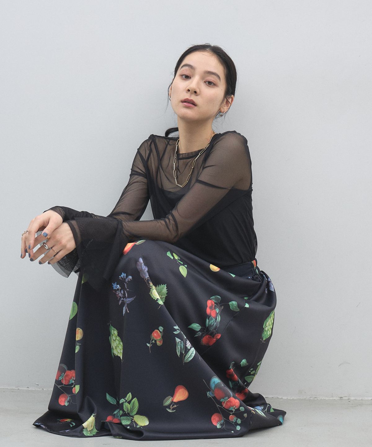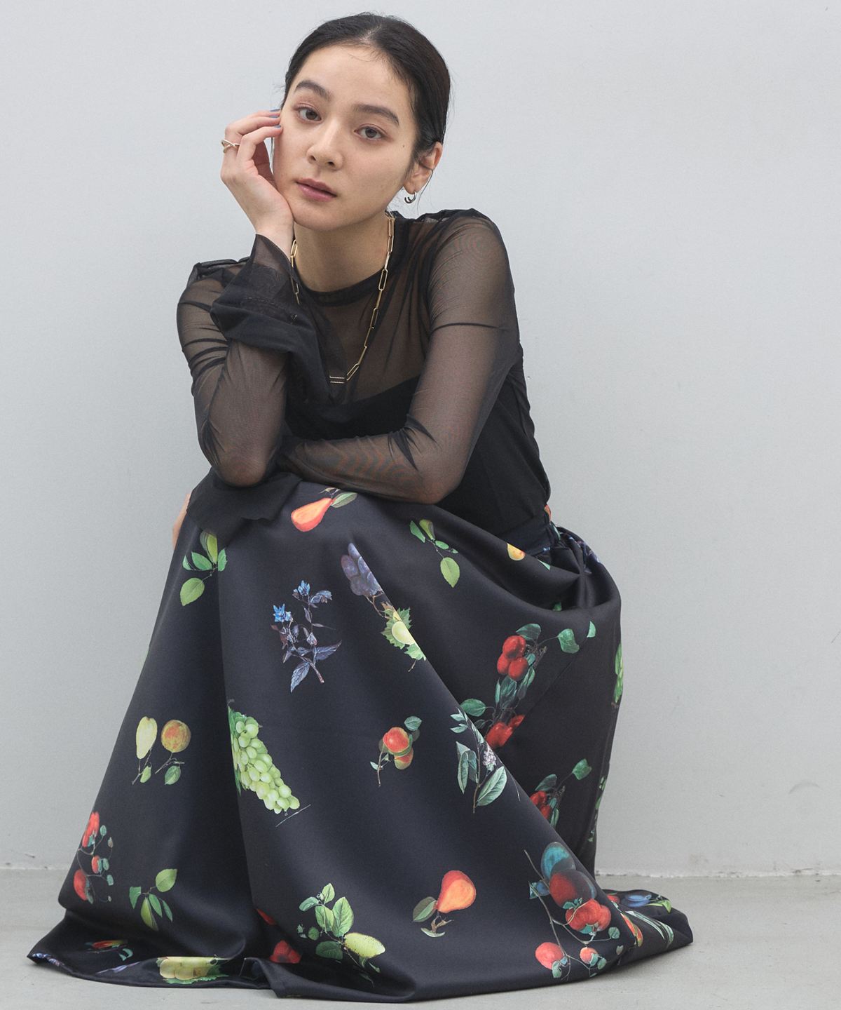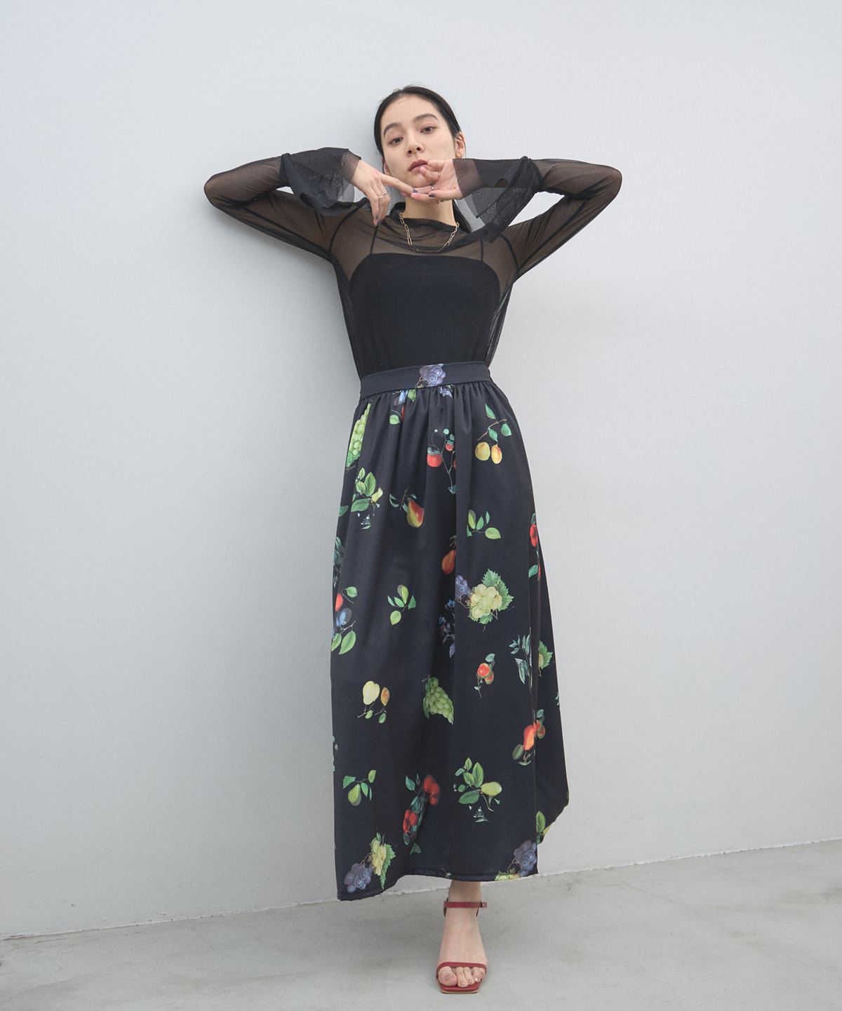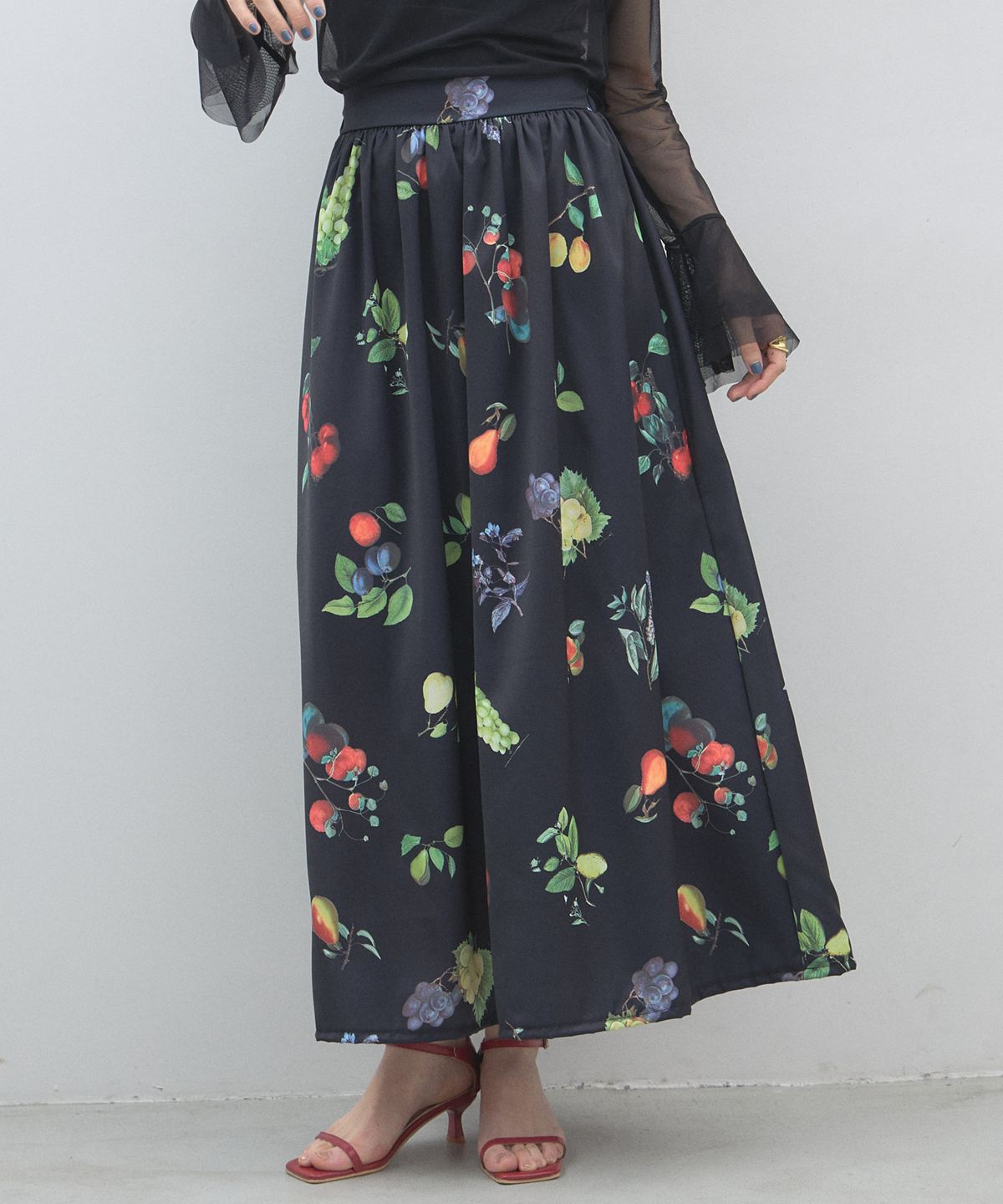鮮やかなフルーツ柄が目を惹く、大人フェミニンなフレアスカート。