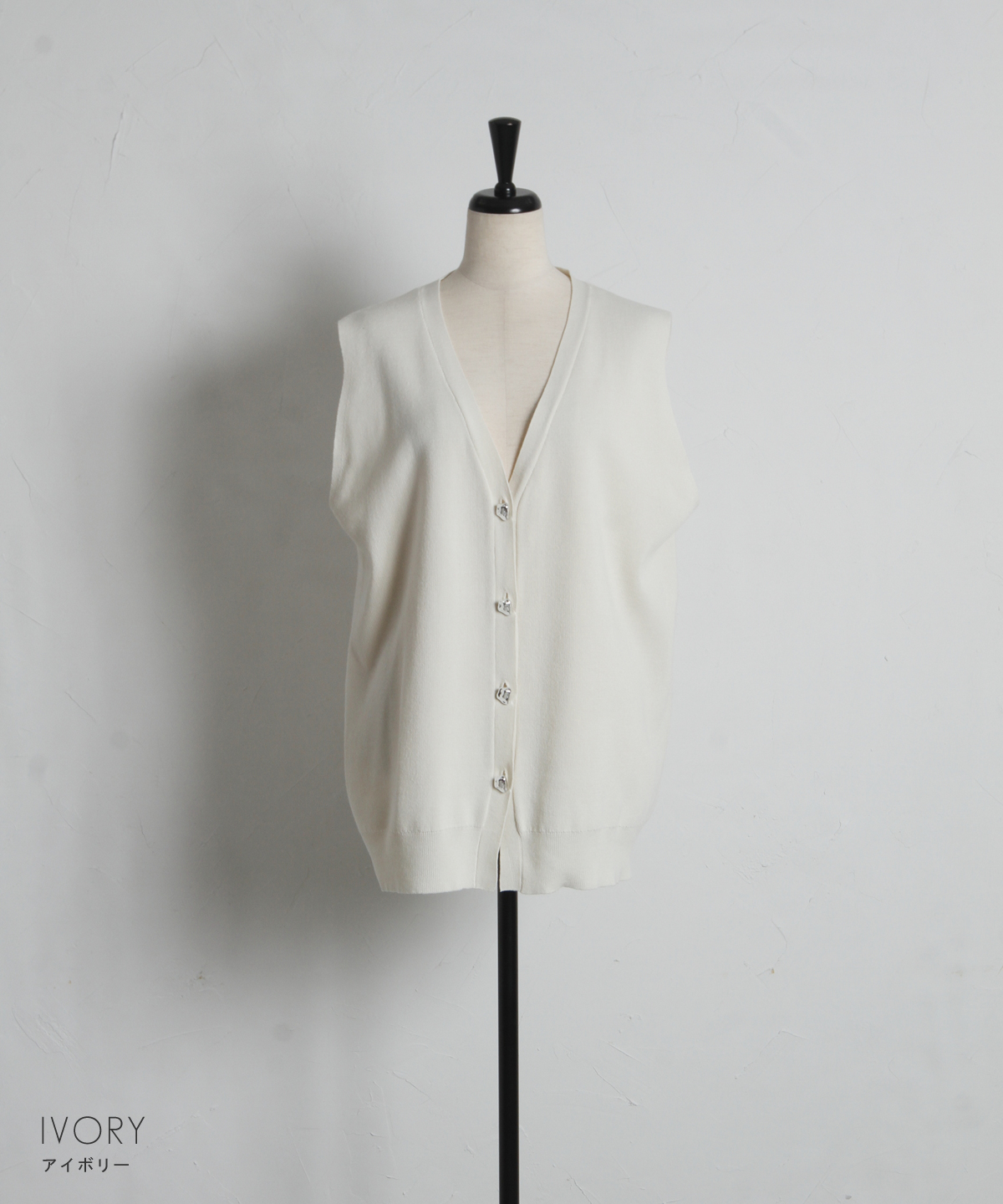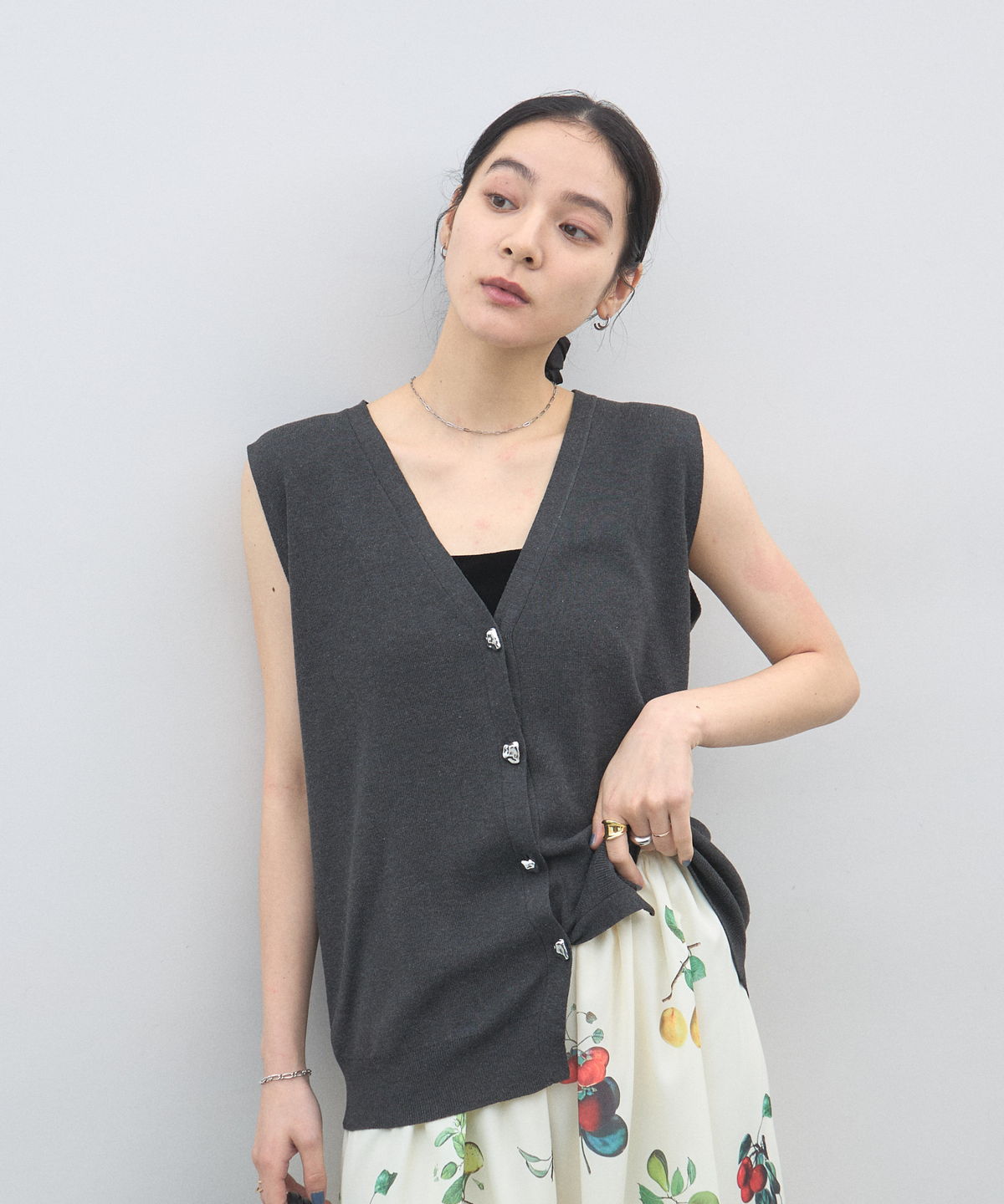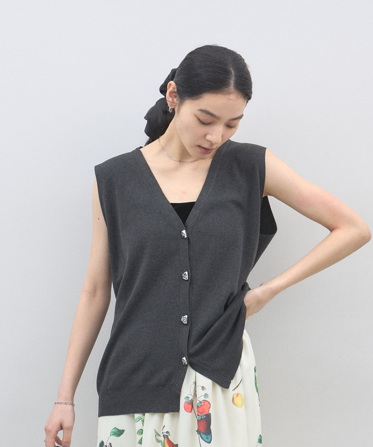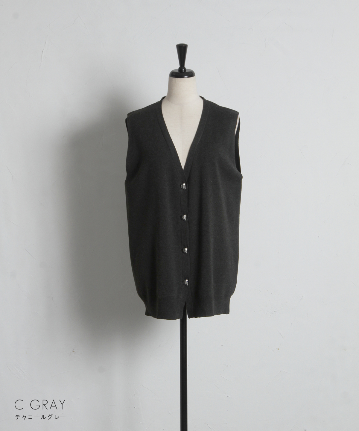 深めのVネックとメタルボタンがアクセントのニットベスト。