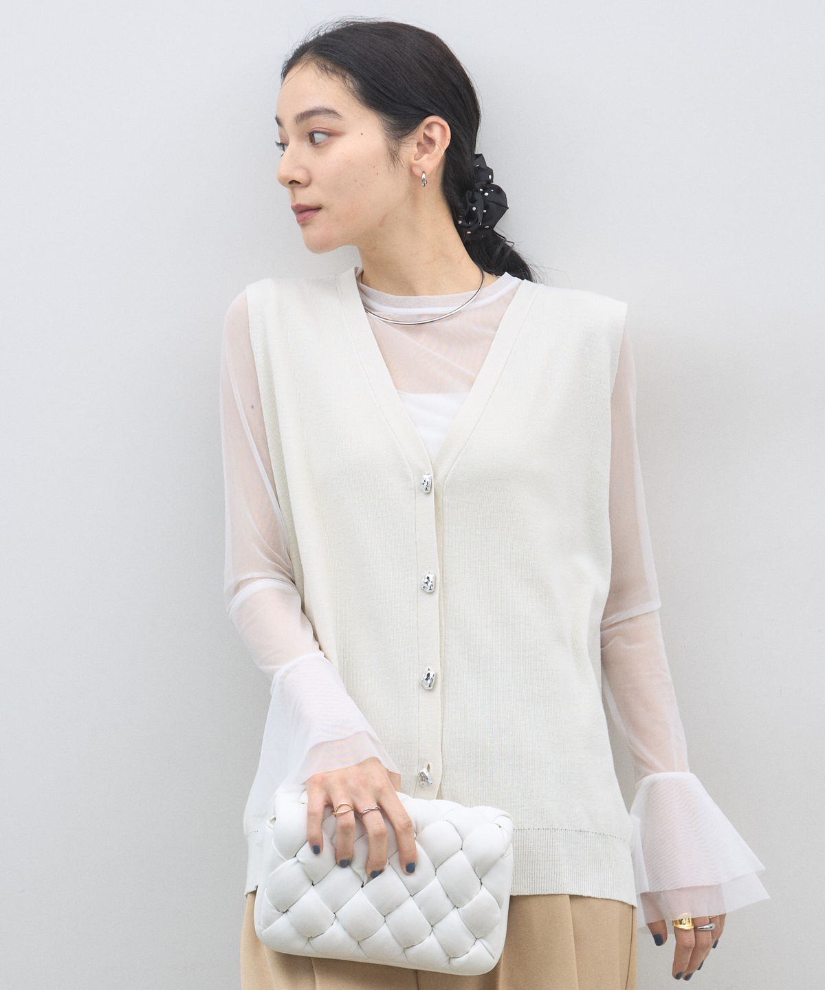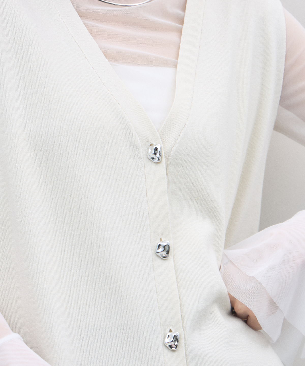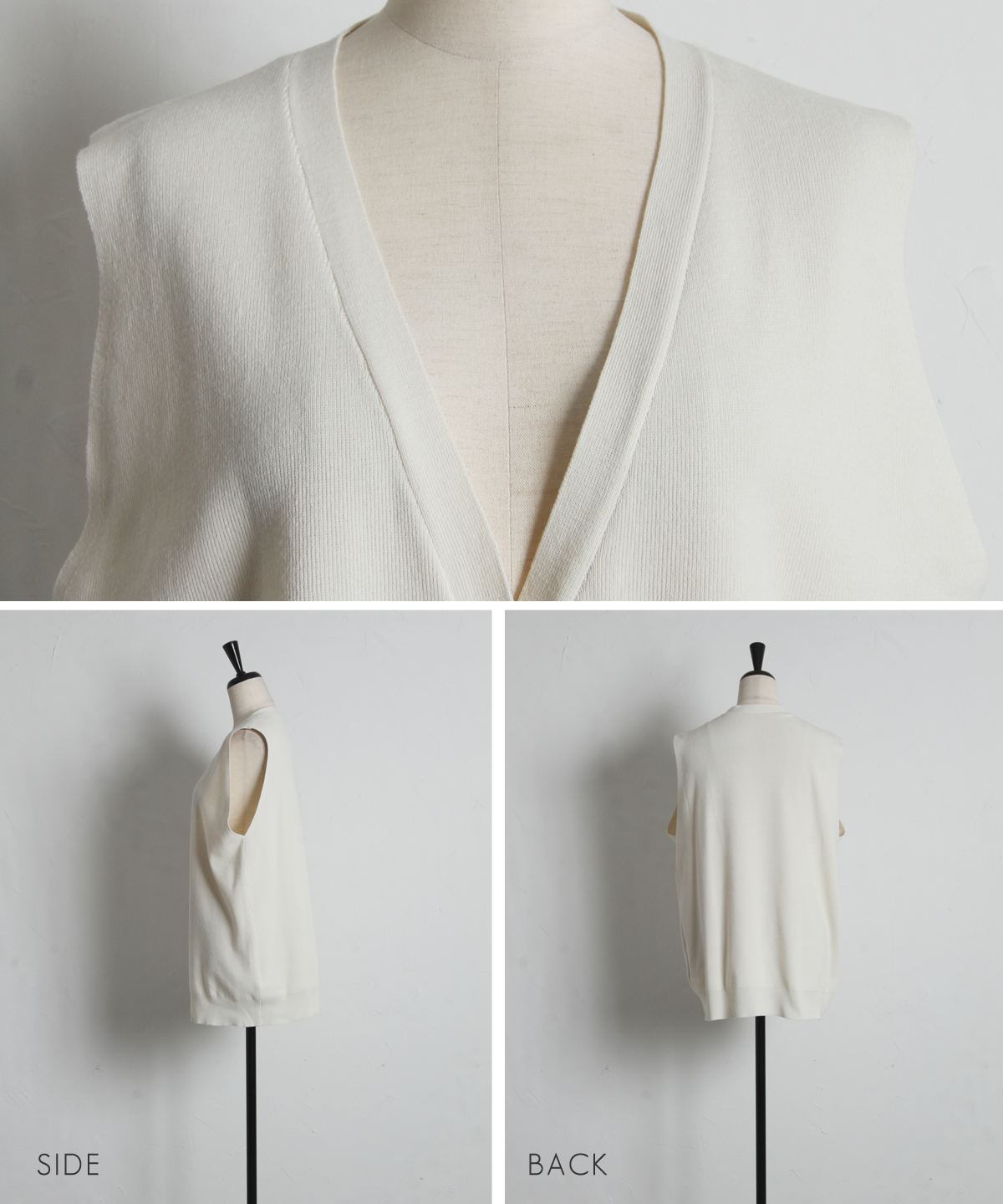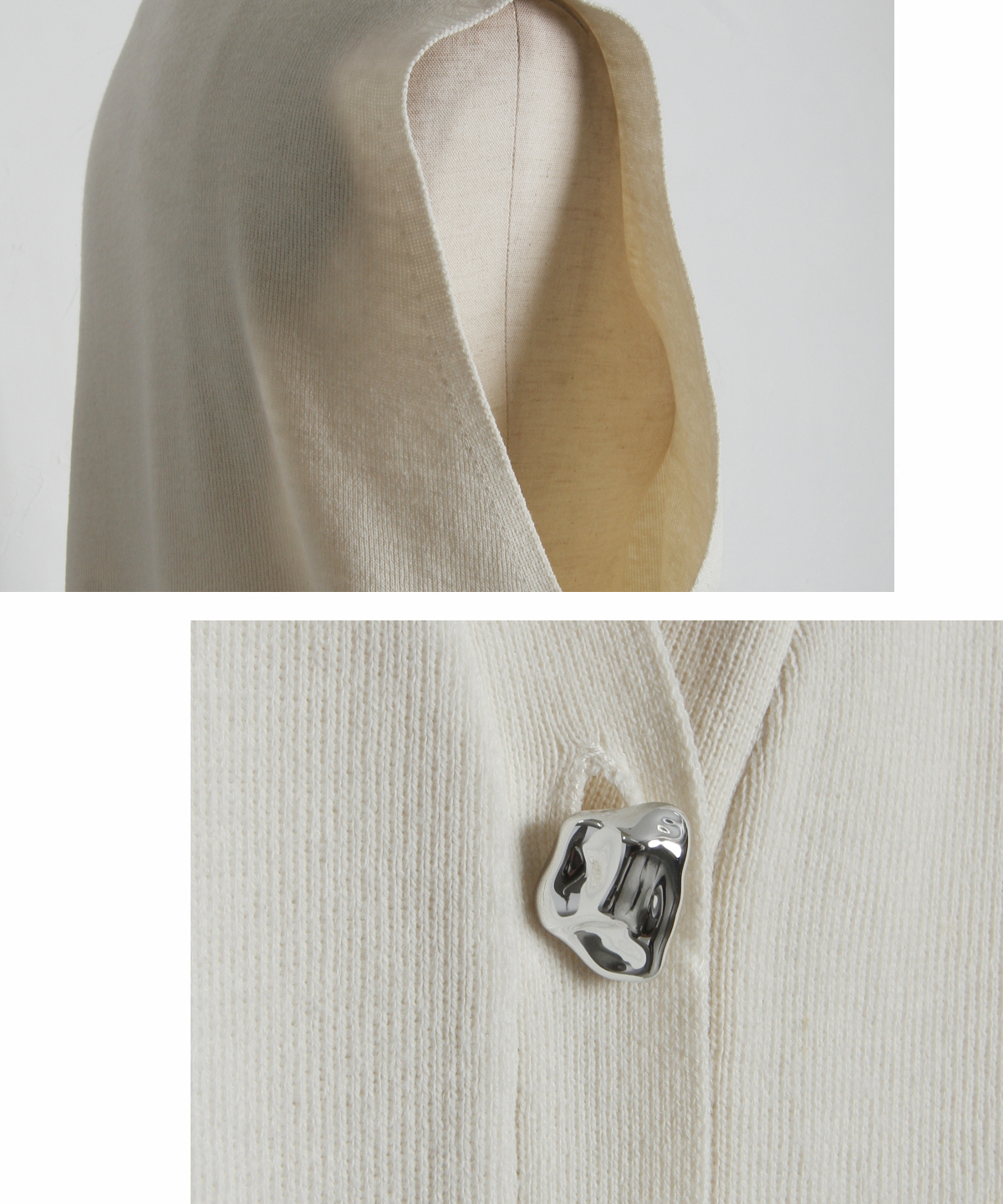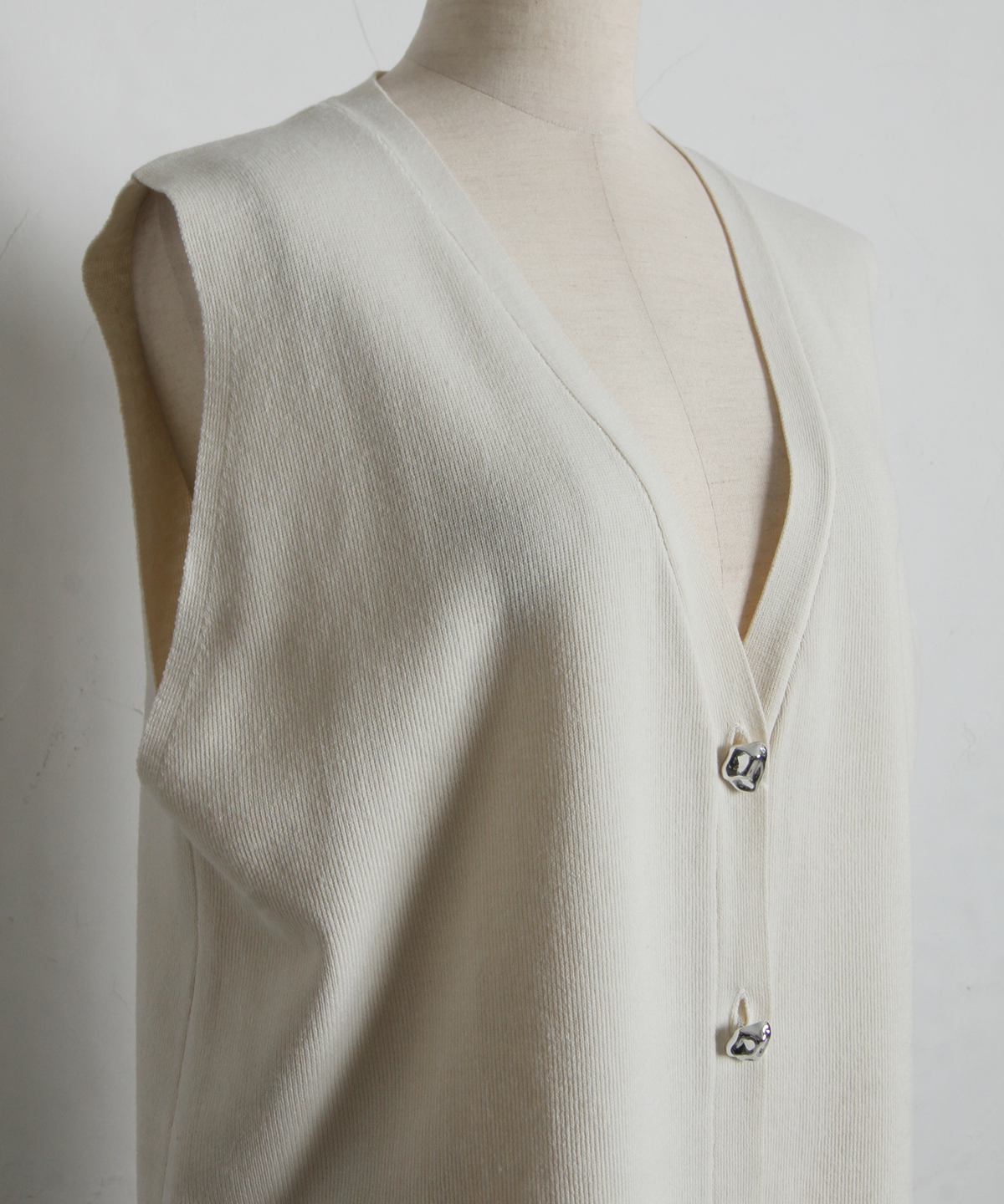 深めのVネックとメタルボタンがアクセントのニットベスト。