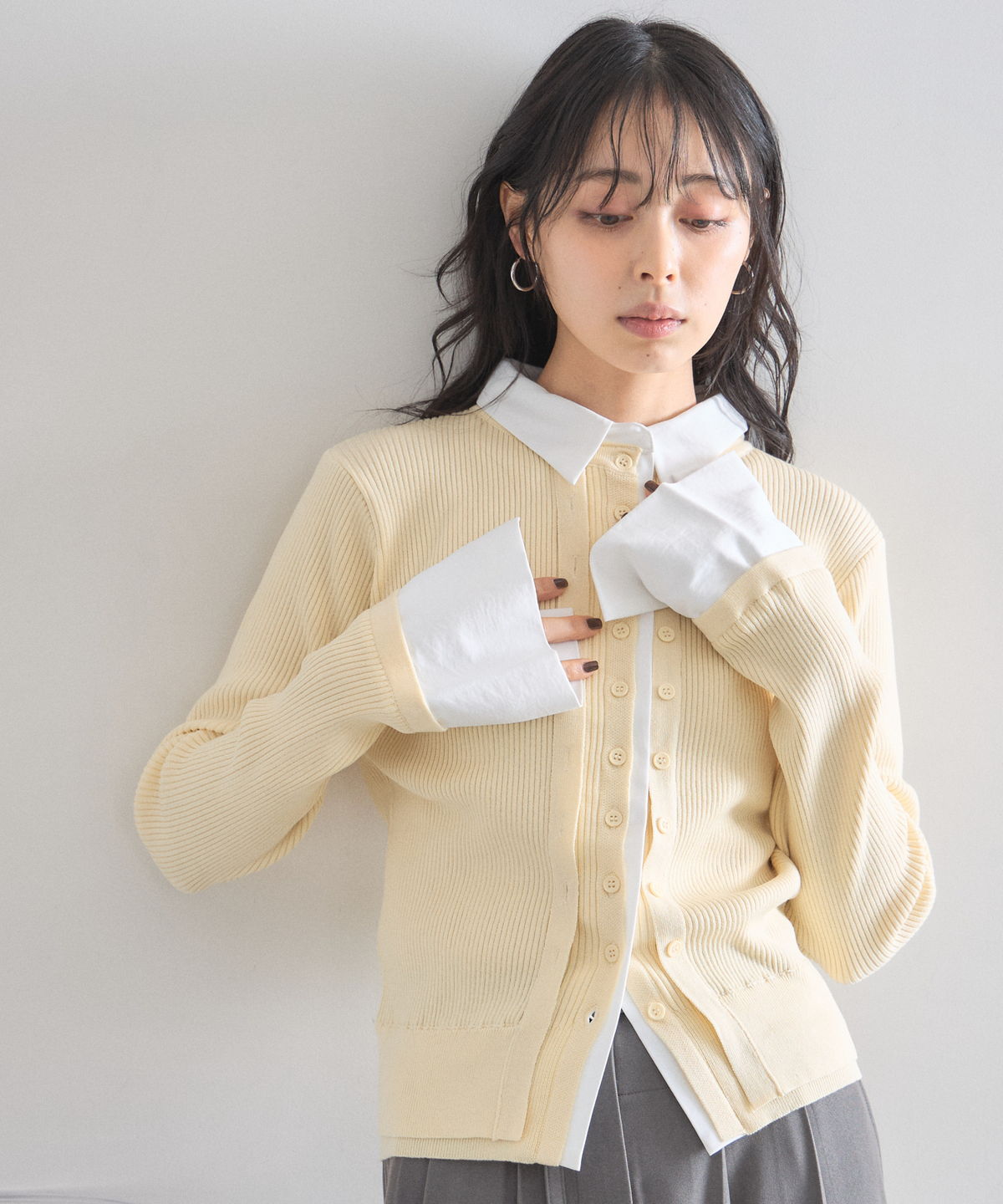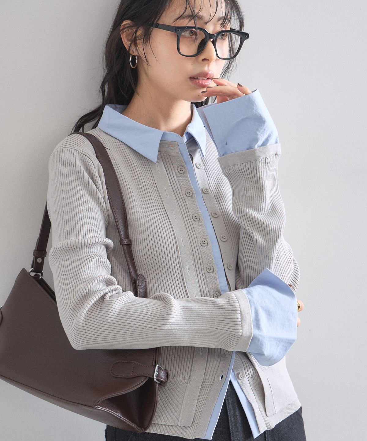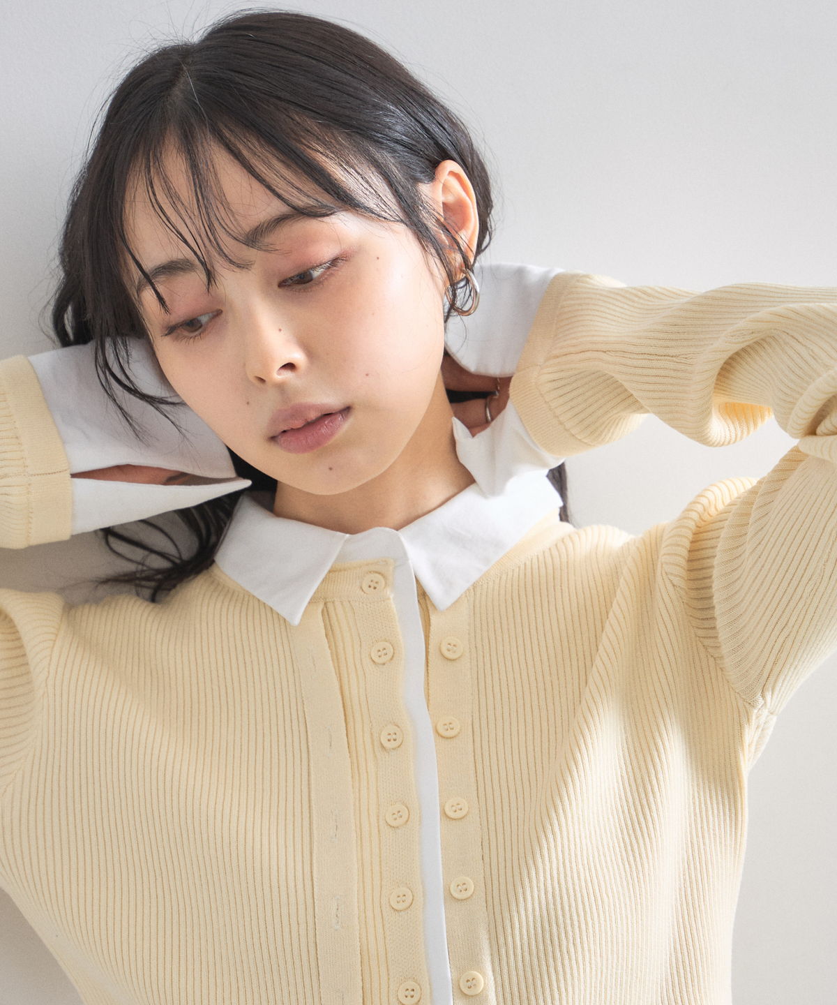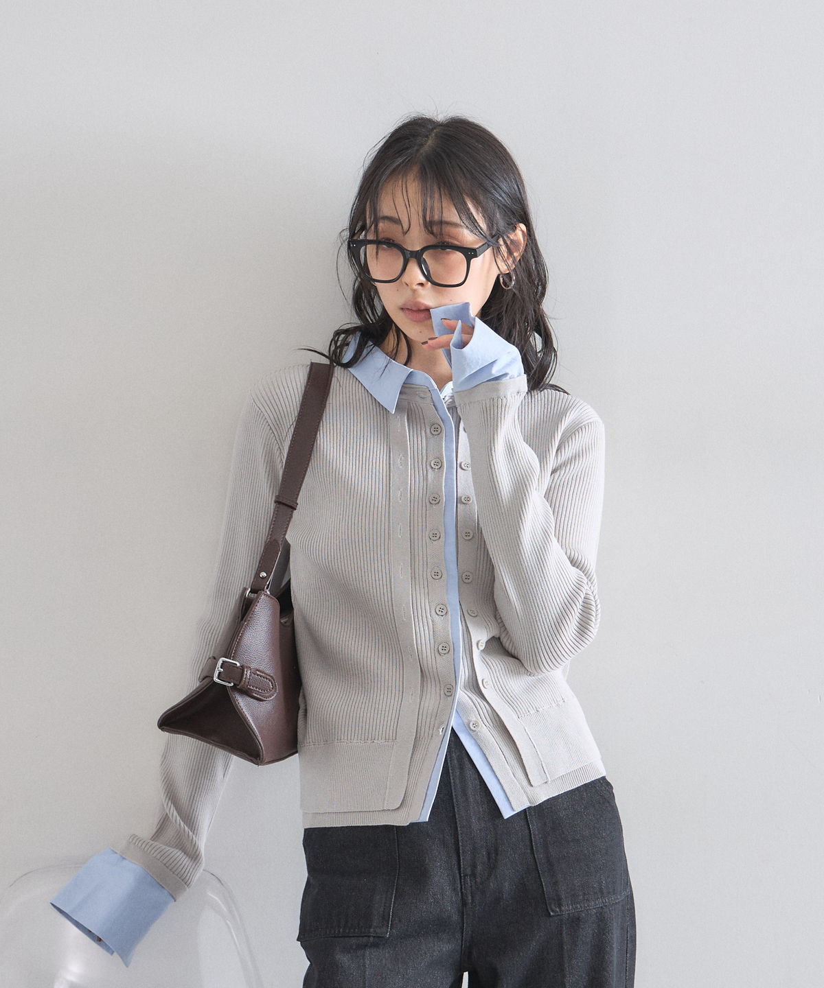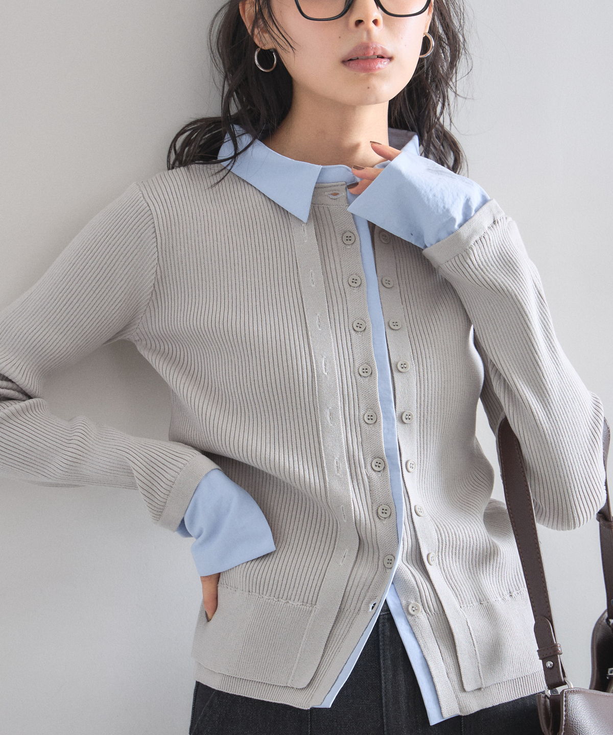 カーディガンを重ね着したような、フェイクレイヤードデザインの一着。