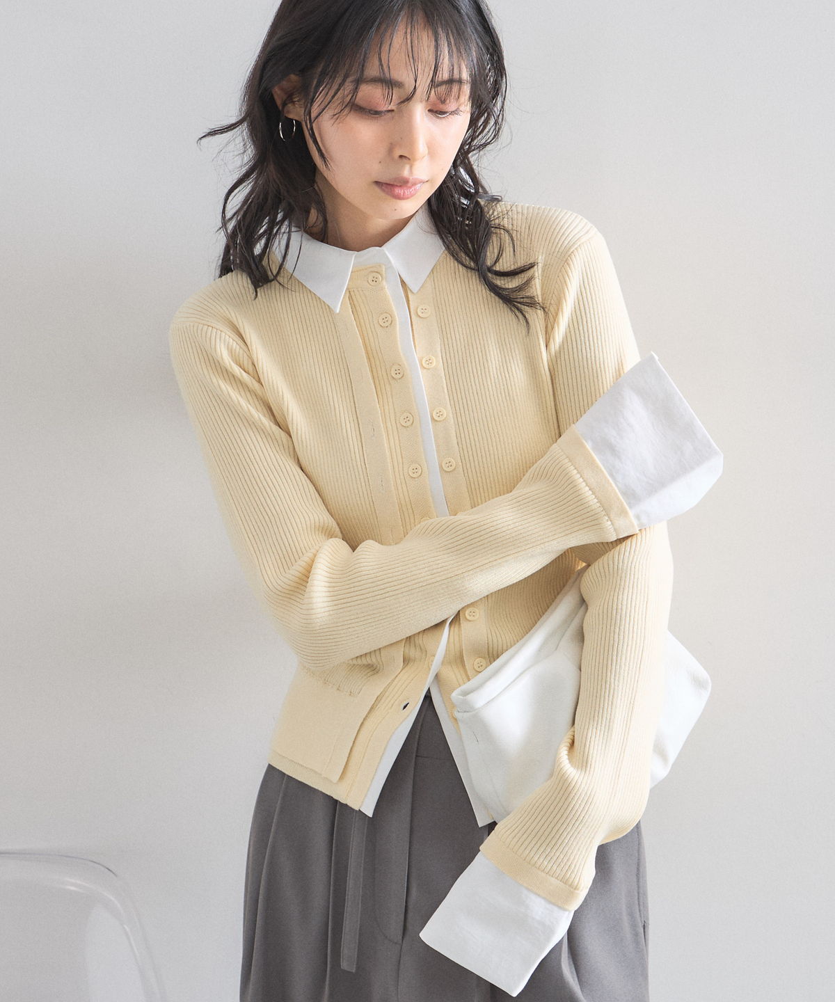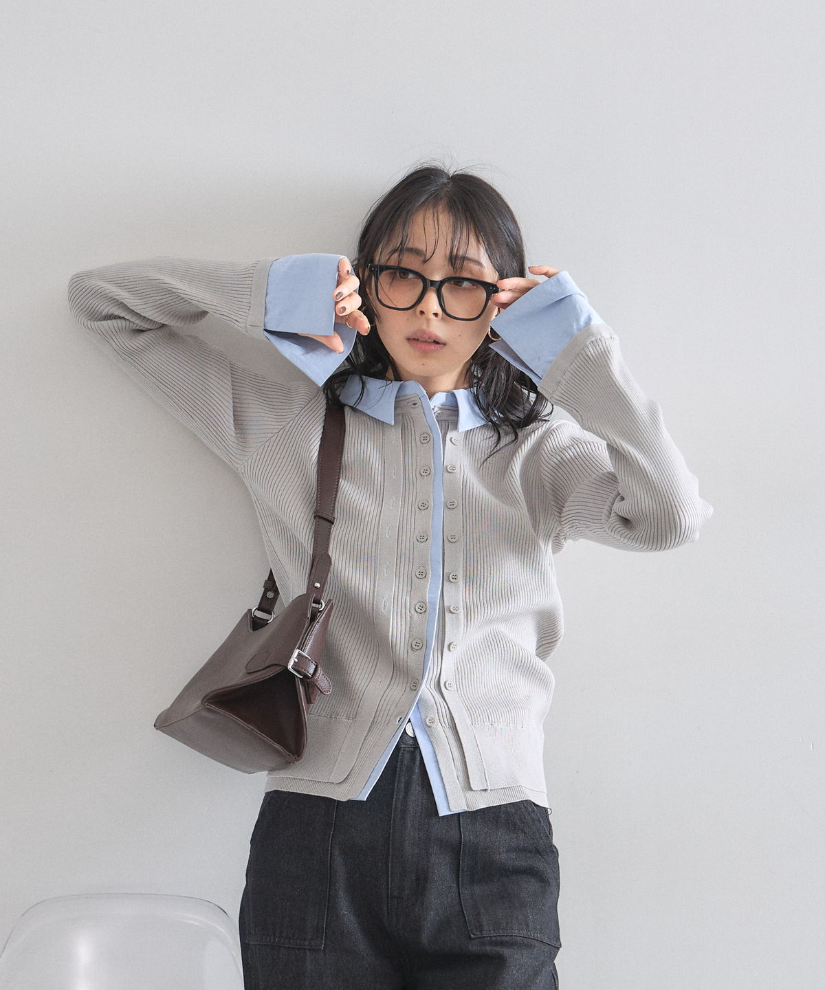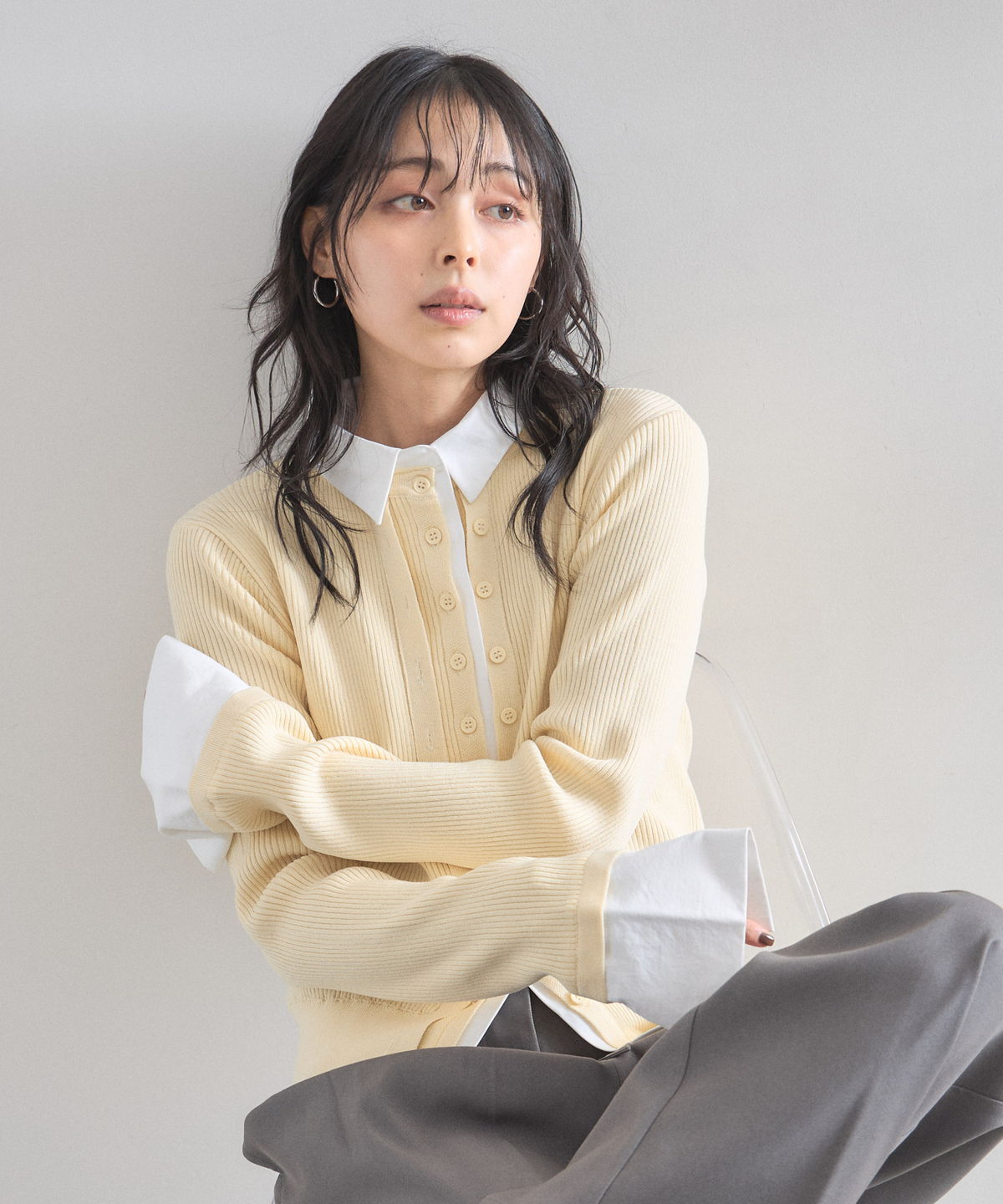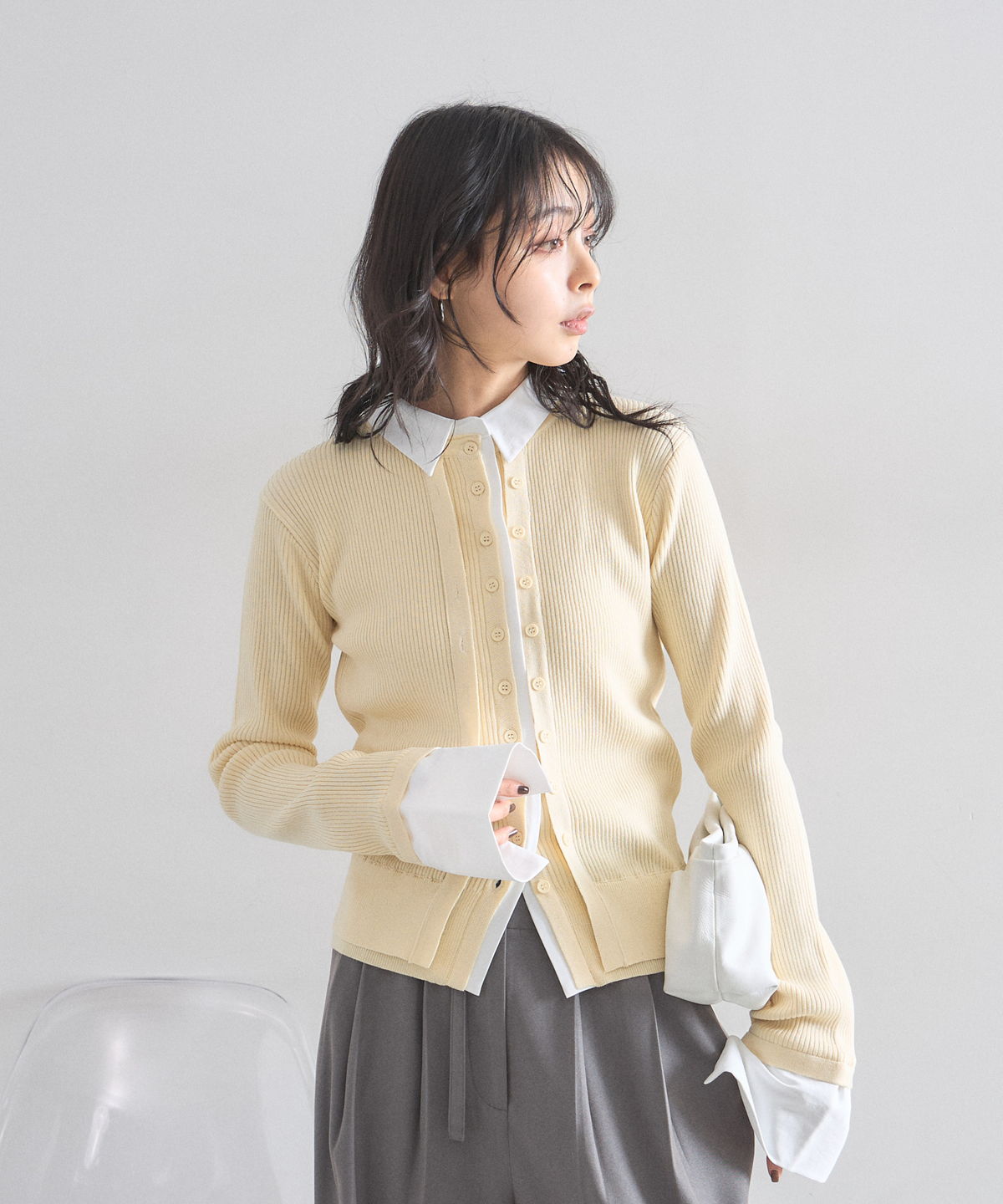 カーディガンを重ね着したような、フェイクレイヤードデザインの一着。