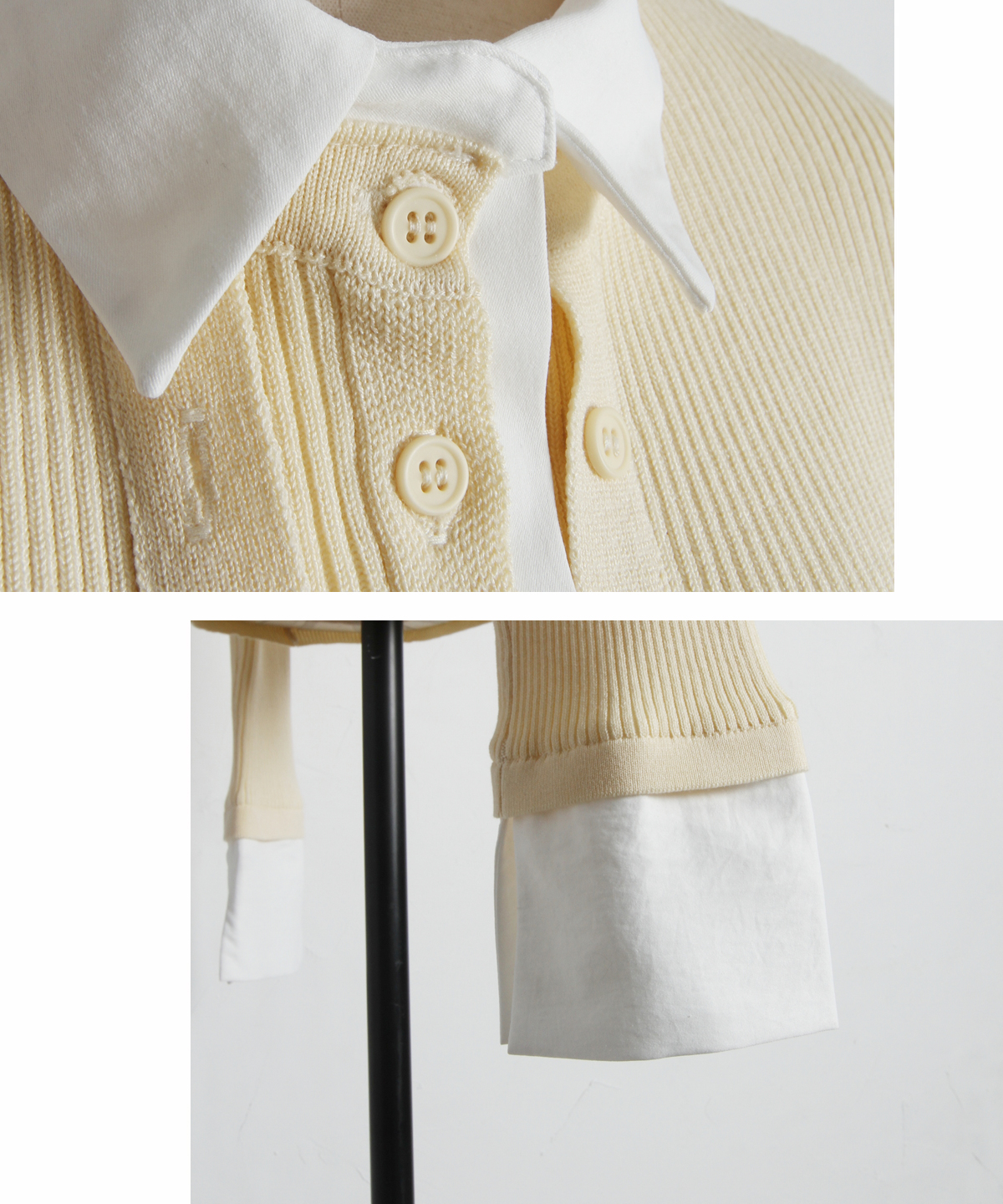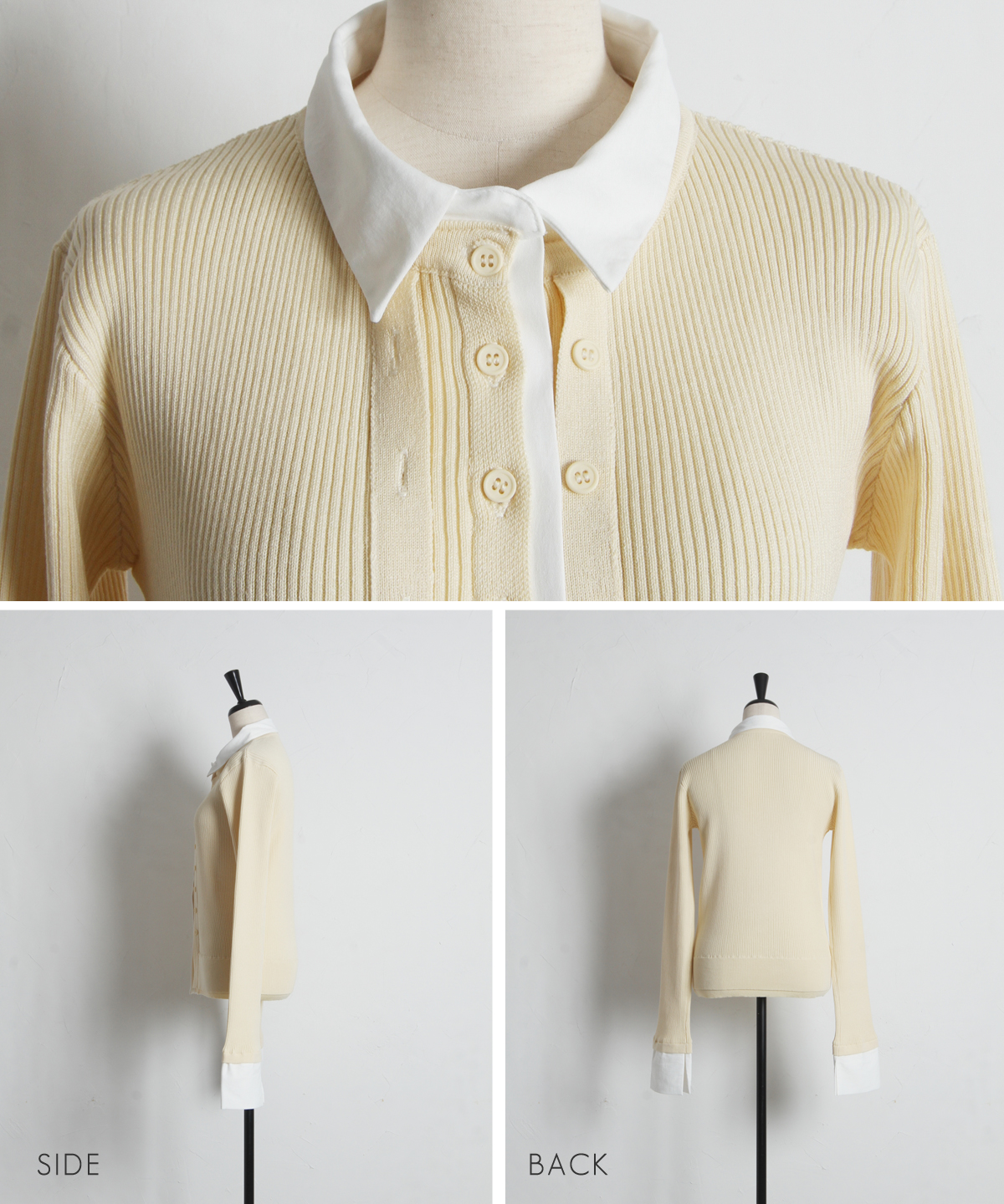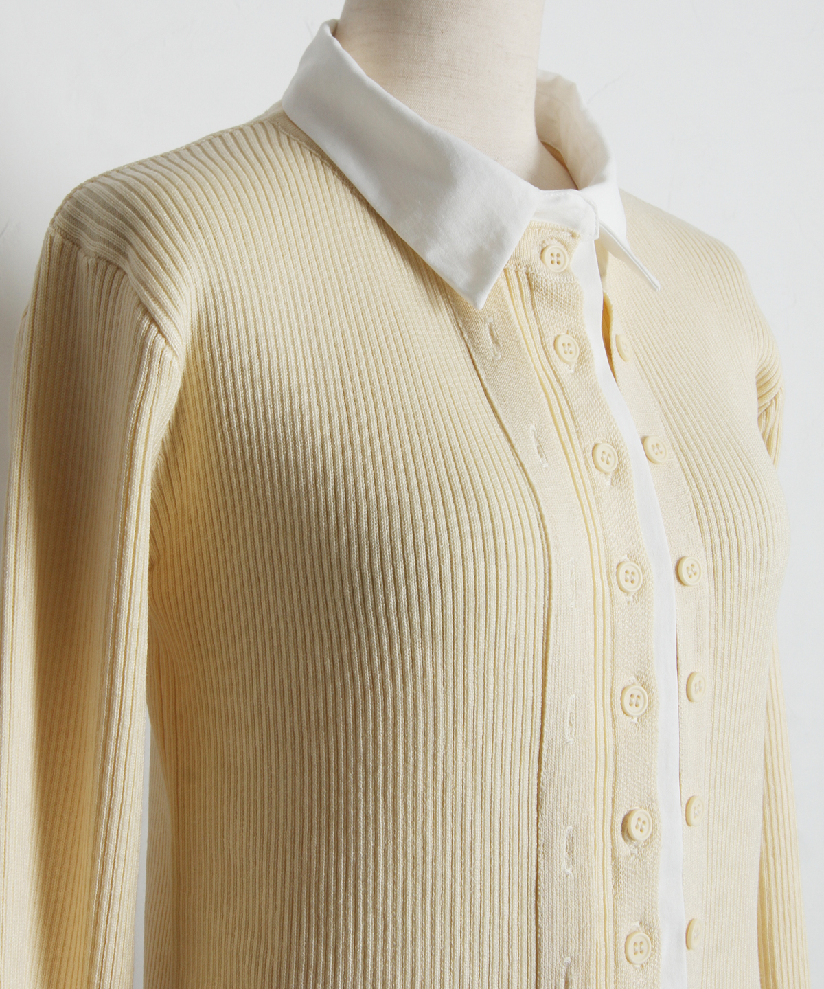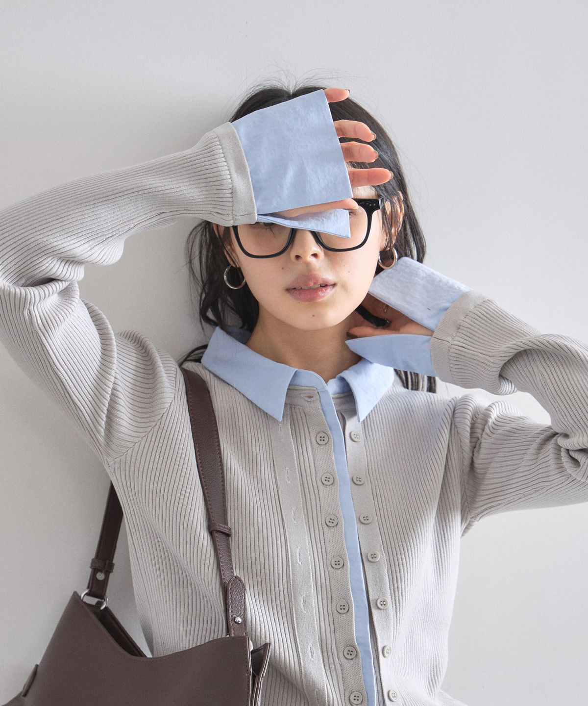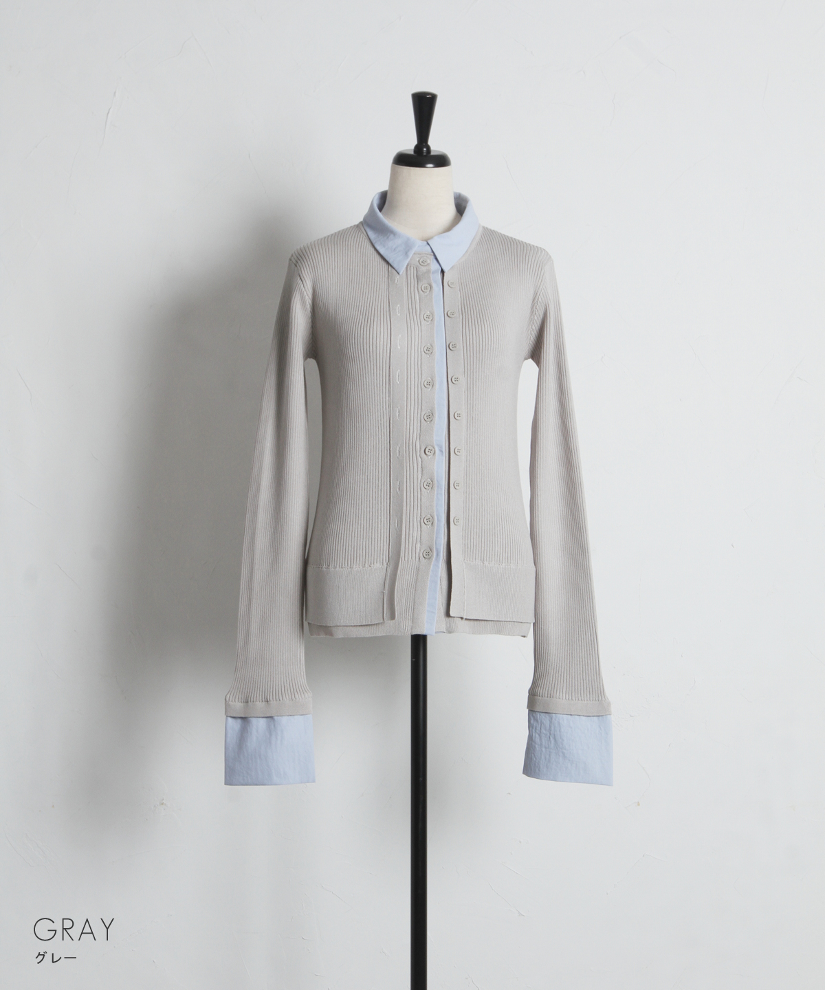 カーディガンを重ね着したような、フェイクレイヤードデザインの一着。