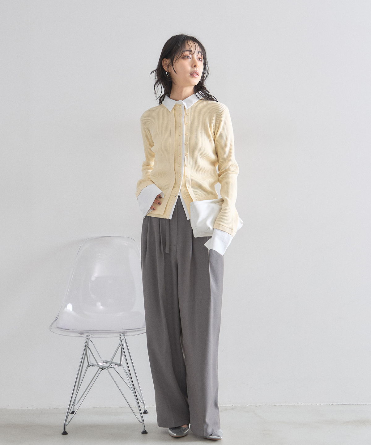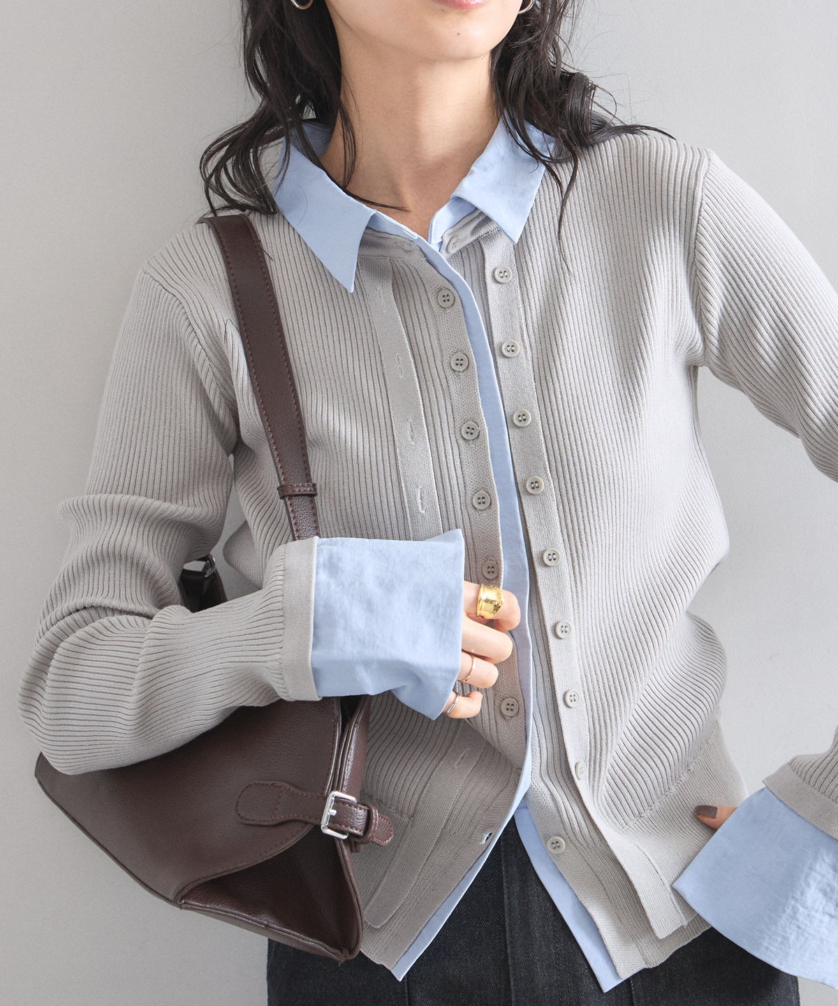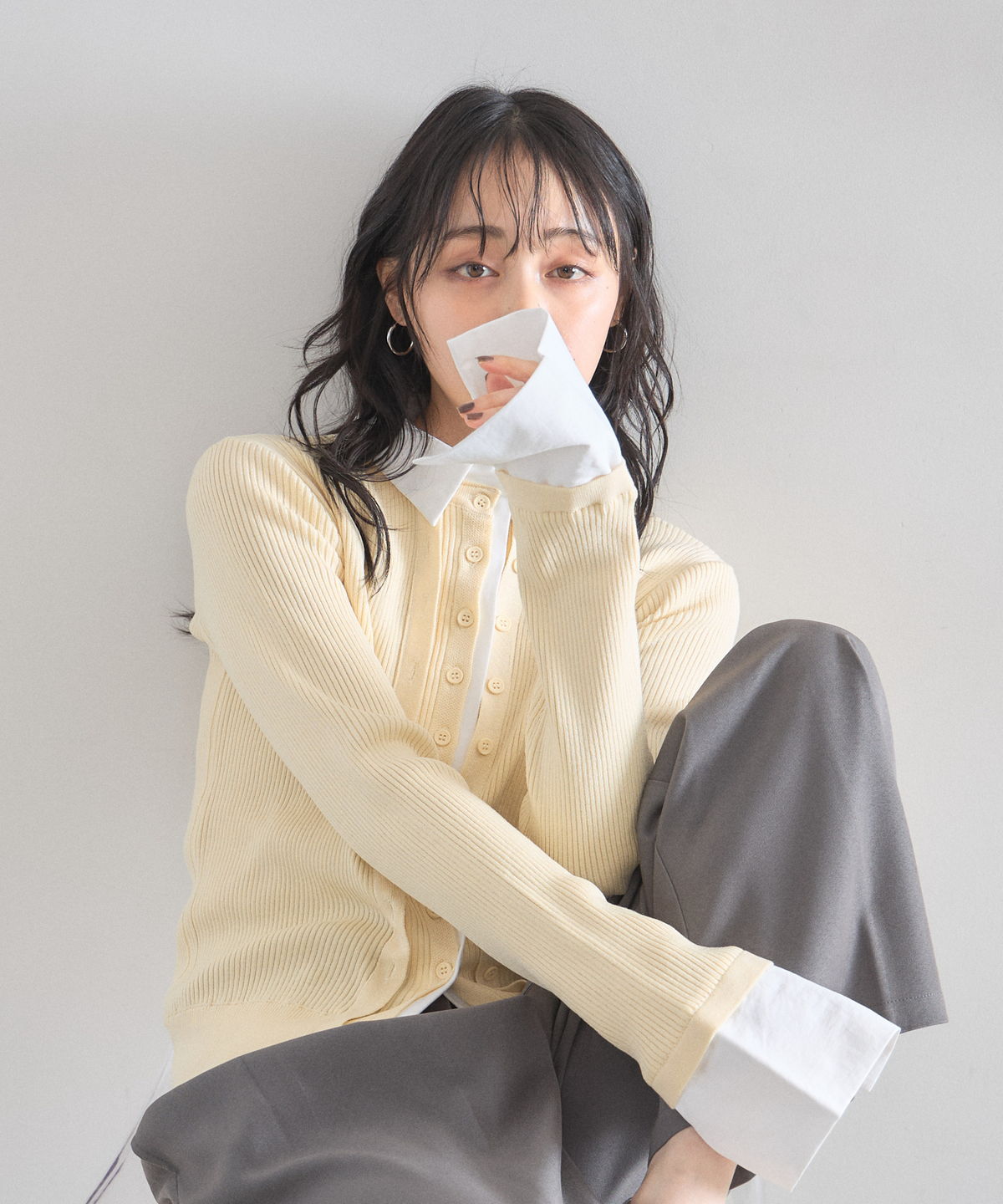 カーディガンは肌触りの良い細リブ素材で、程よくボディにフィットし、上品なシルエットを叶えます。