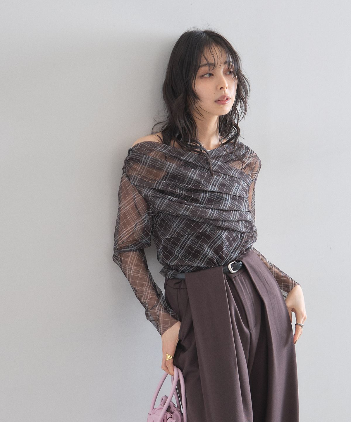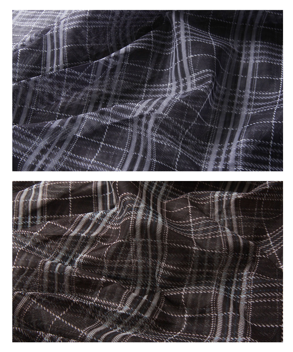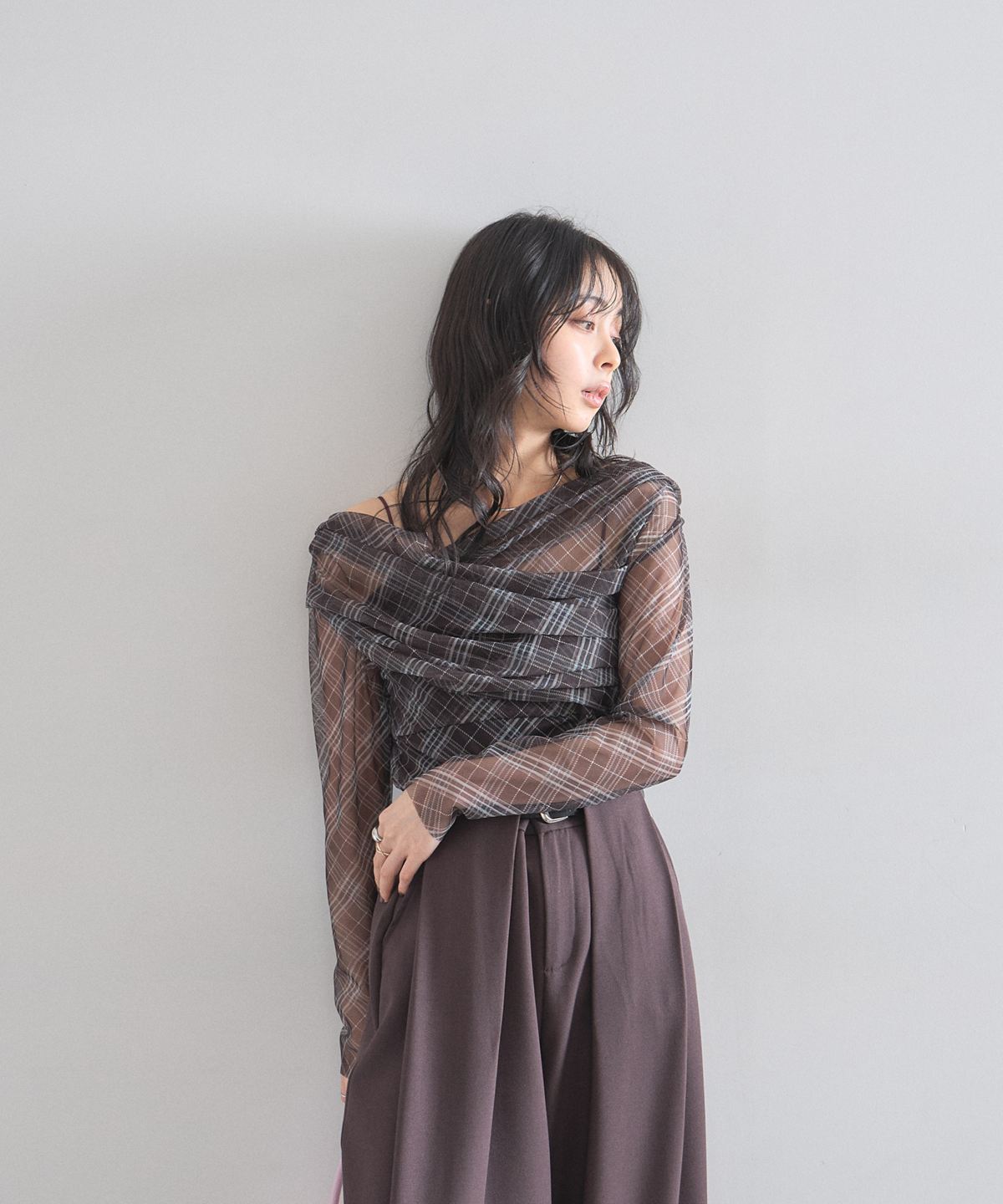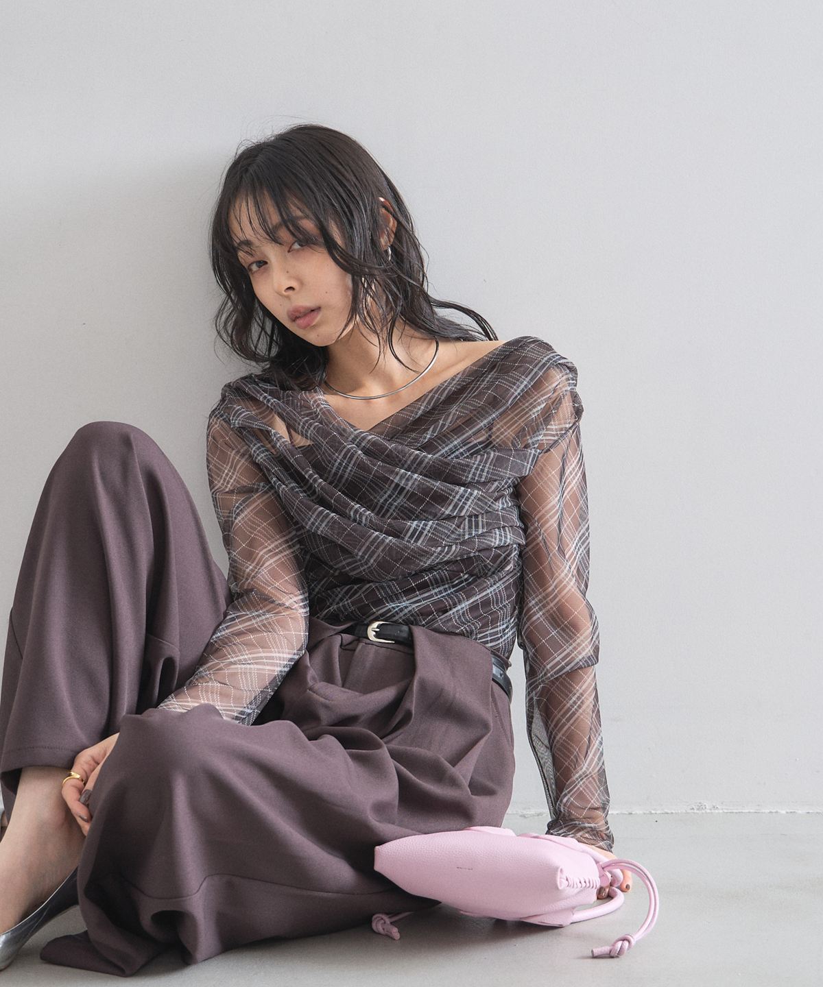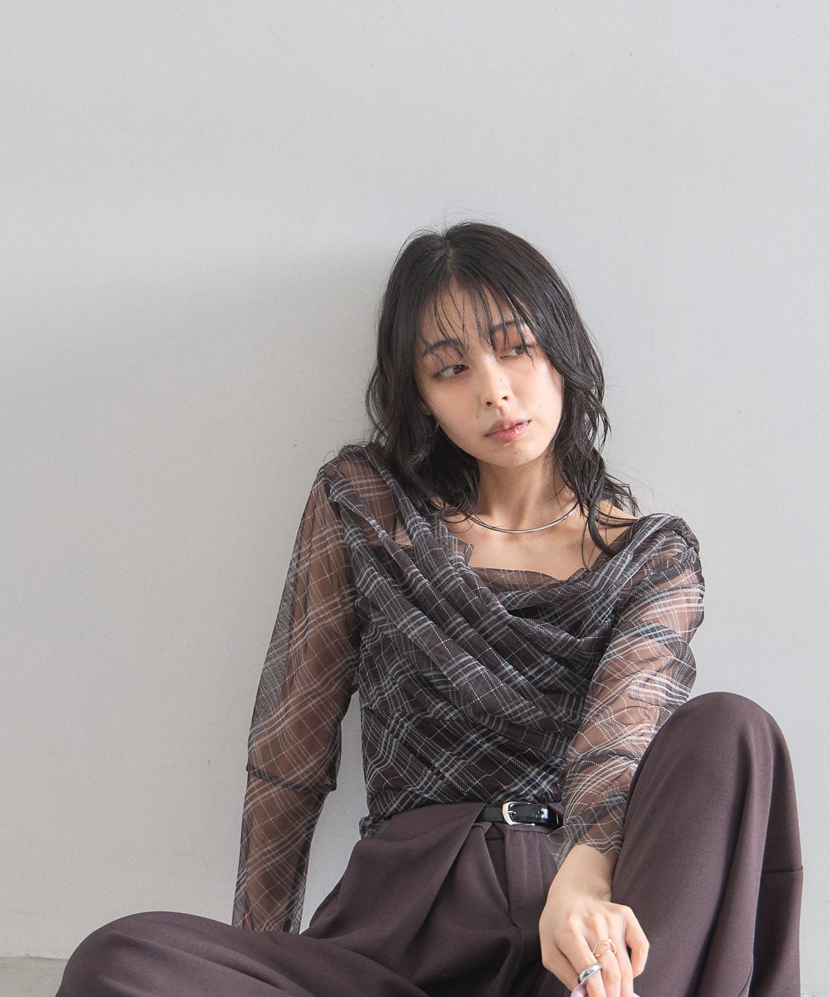 繊細なチェック柄と透け感のある素材を掛け合わせることで、重くなりがちなダークトーンも軽やかな印象に。