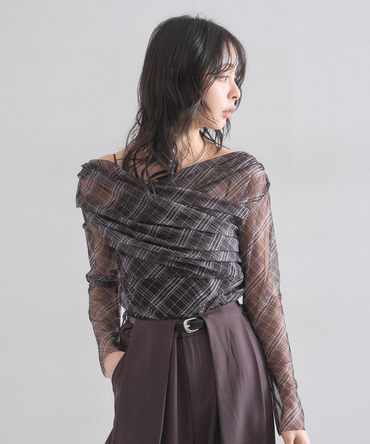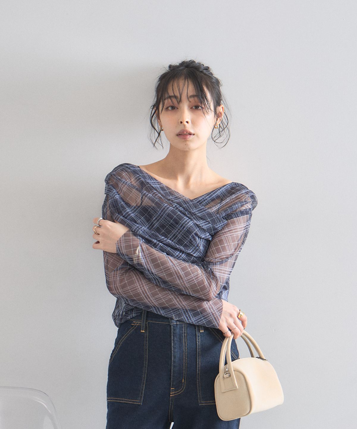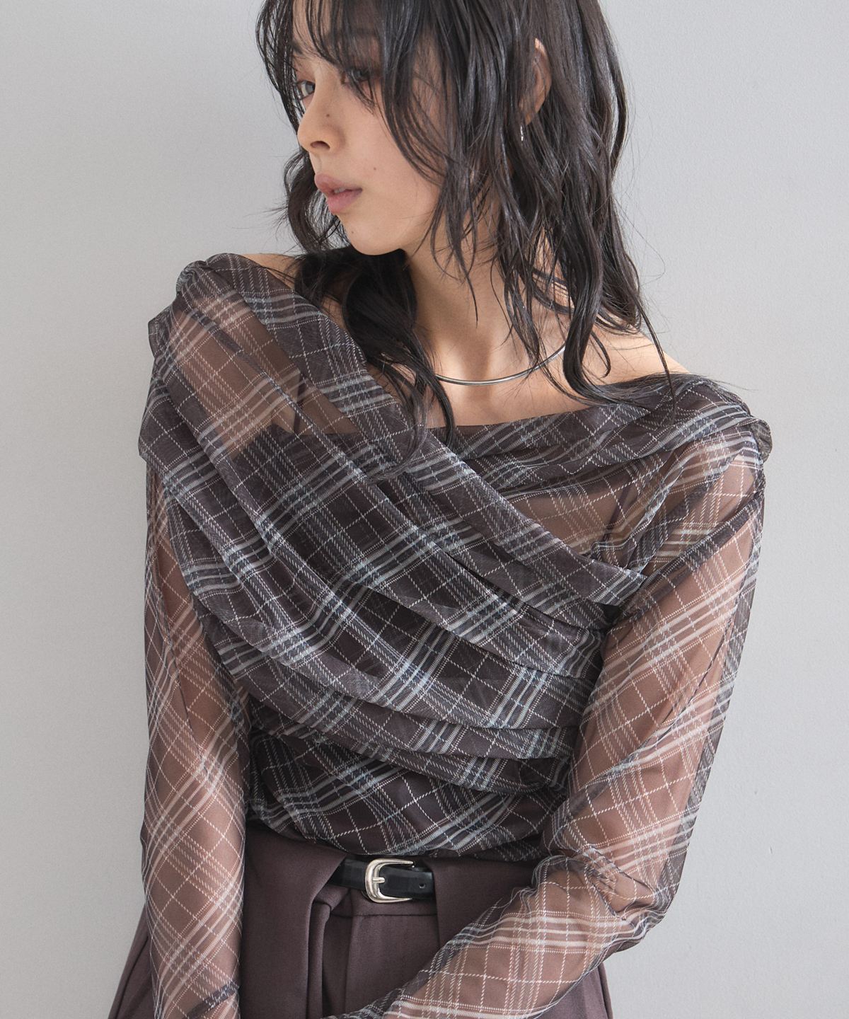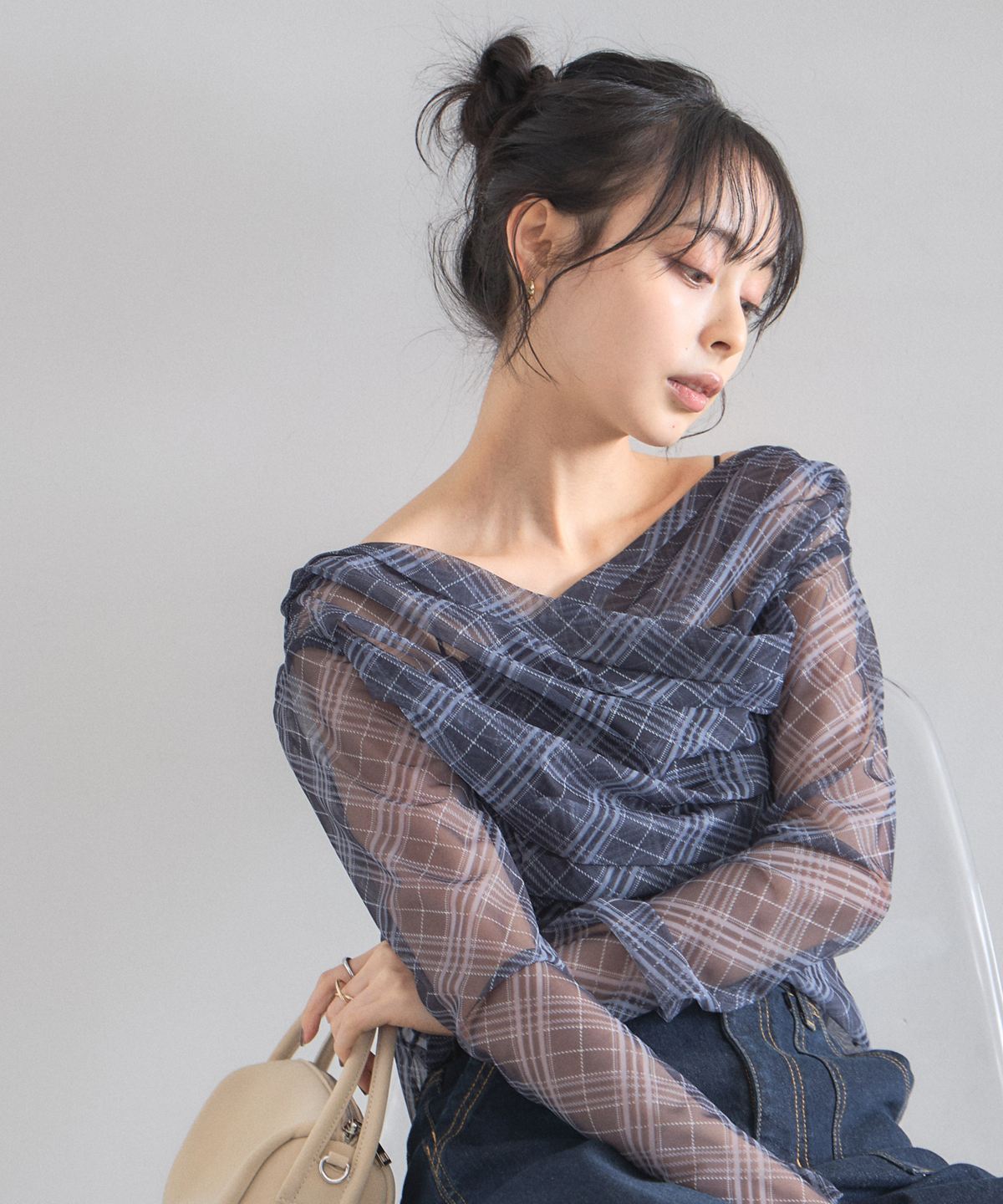 繊細なチェック柄と透け感のある素材を掛け合わせることで、重くなりがちなダークトーンも軽やかな印象に。