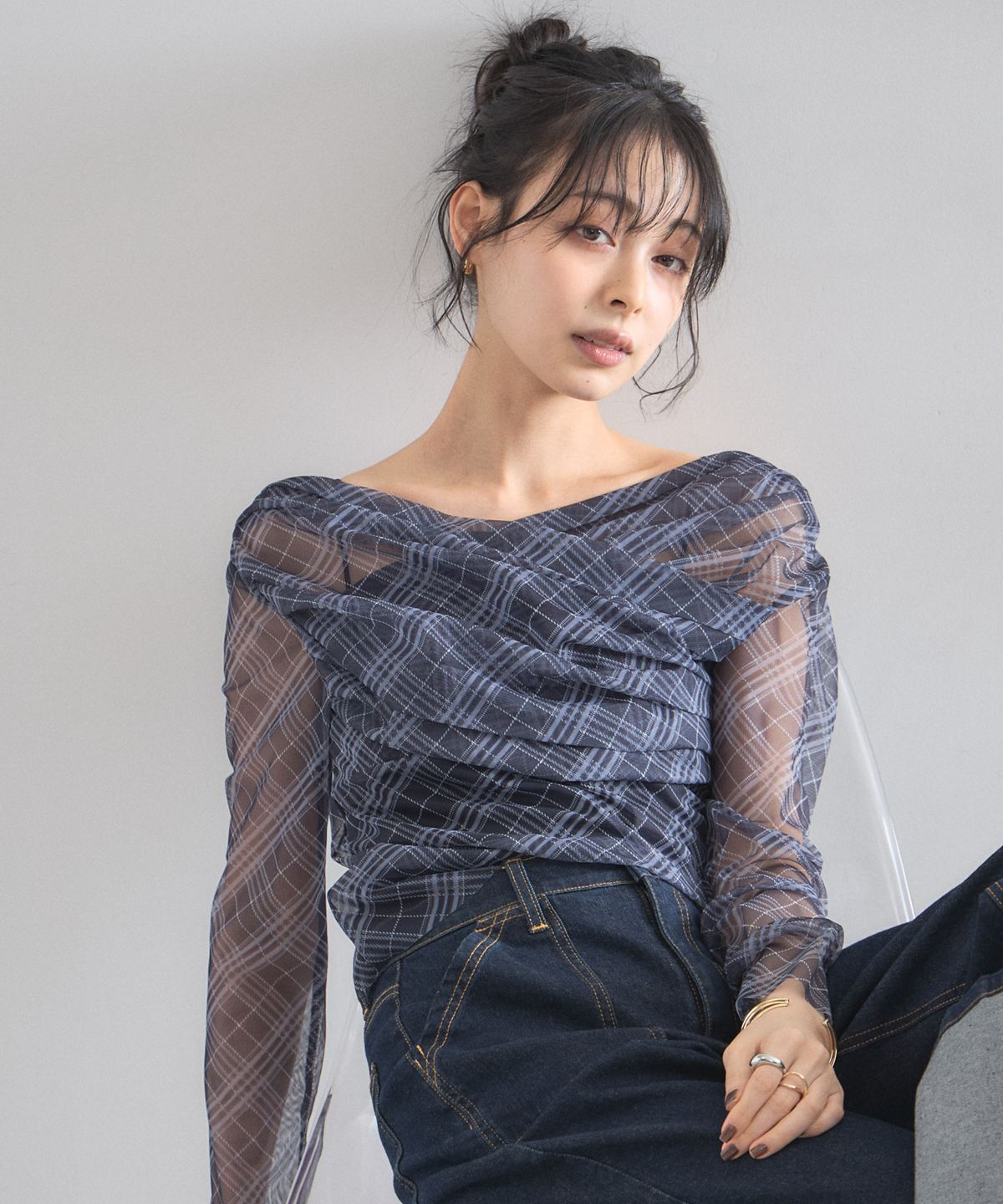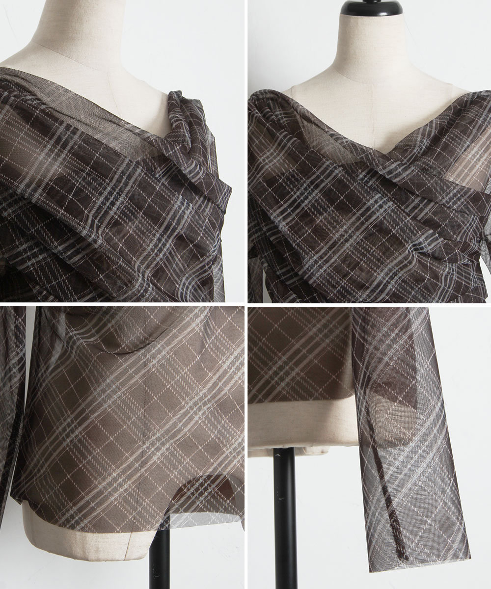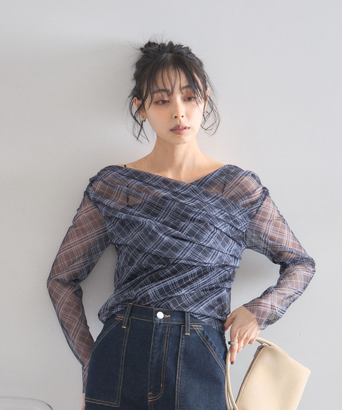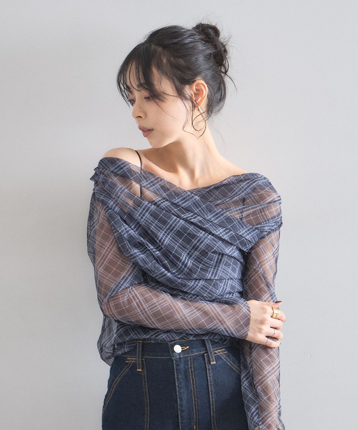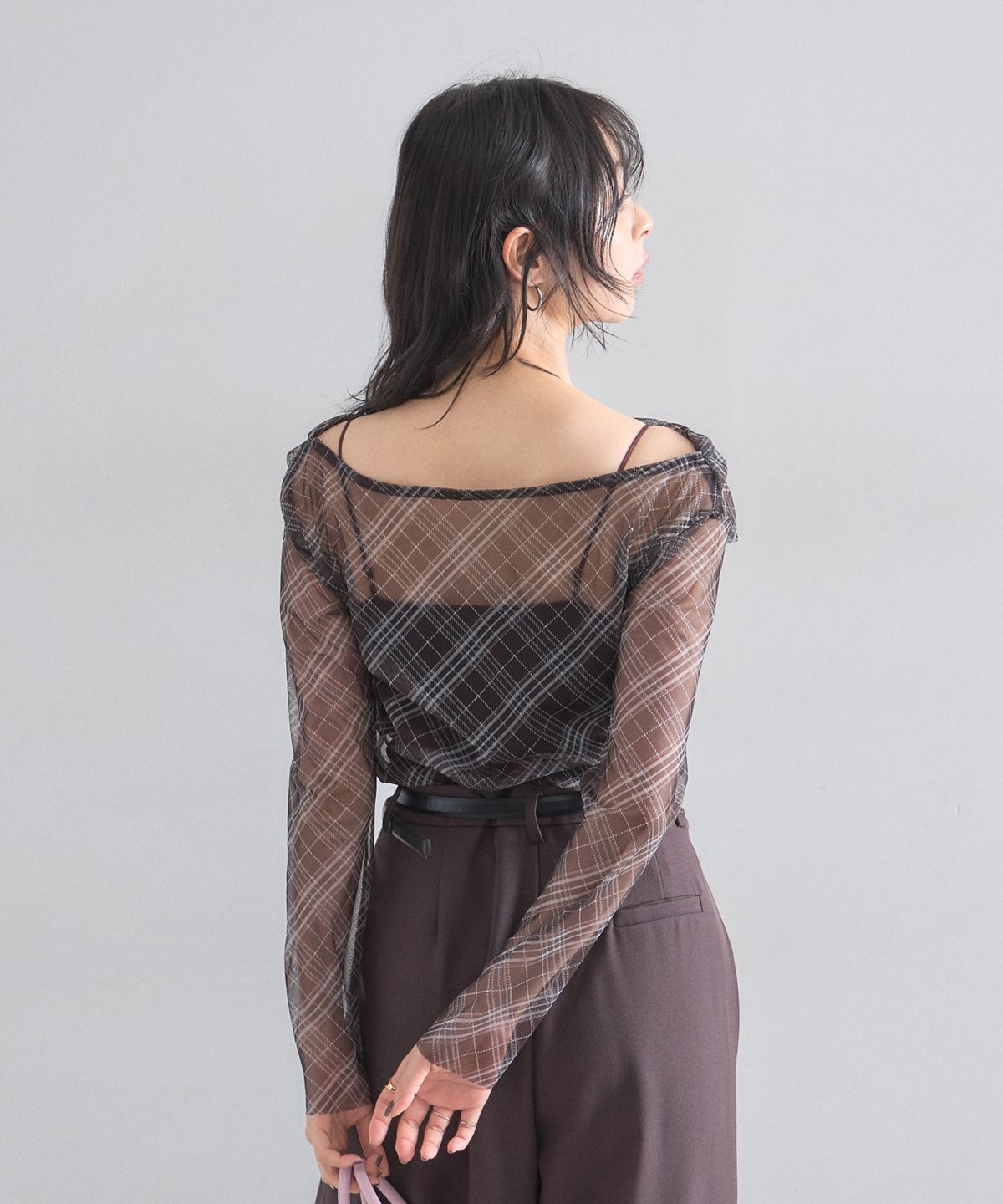 繊細なチェック柄と透け感のある素材を掛け合わせることで、重くなりがちなダークトーンも軽やかな印象に。