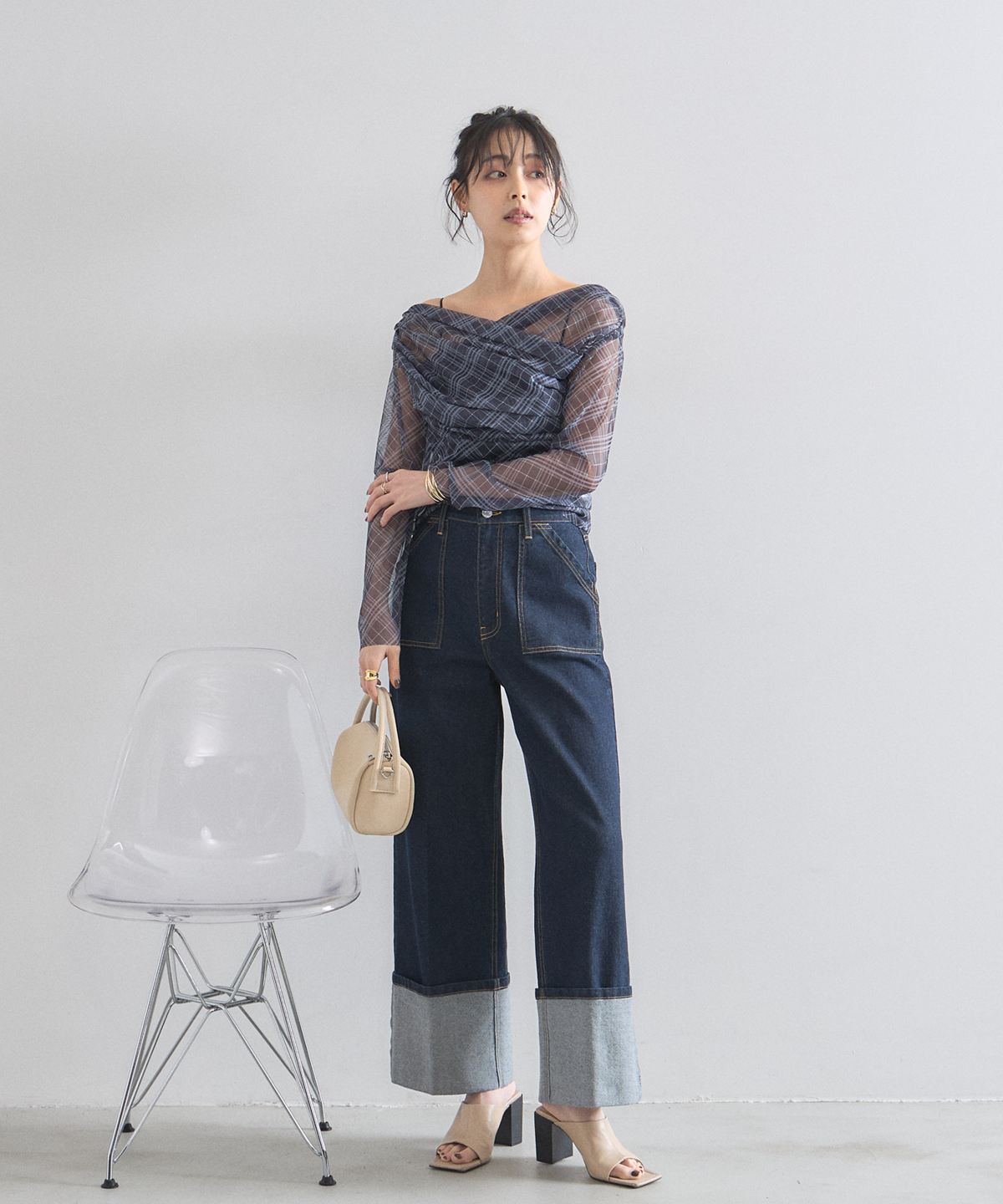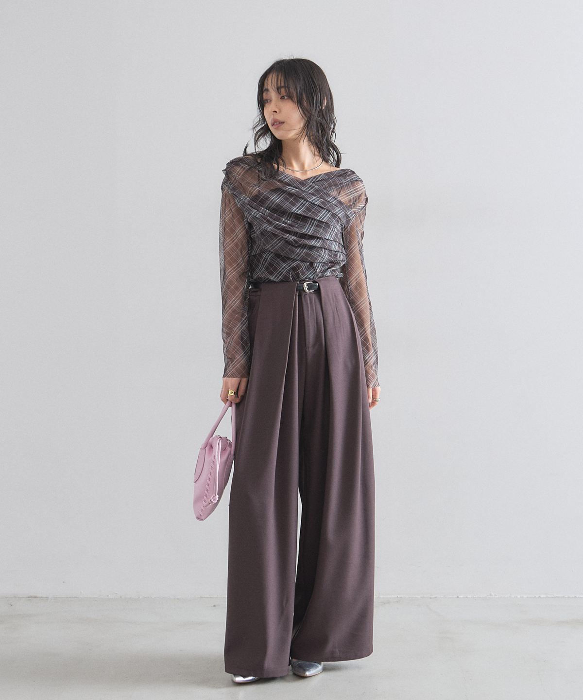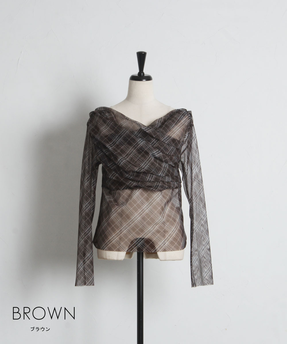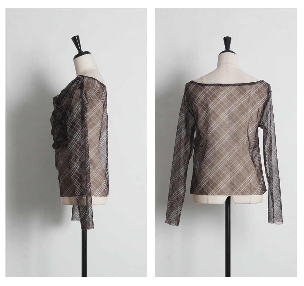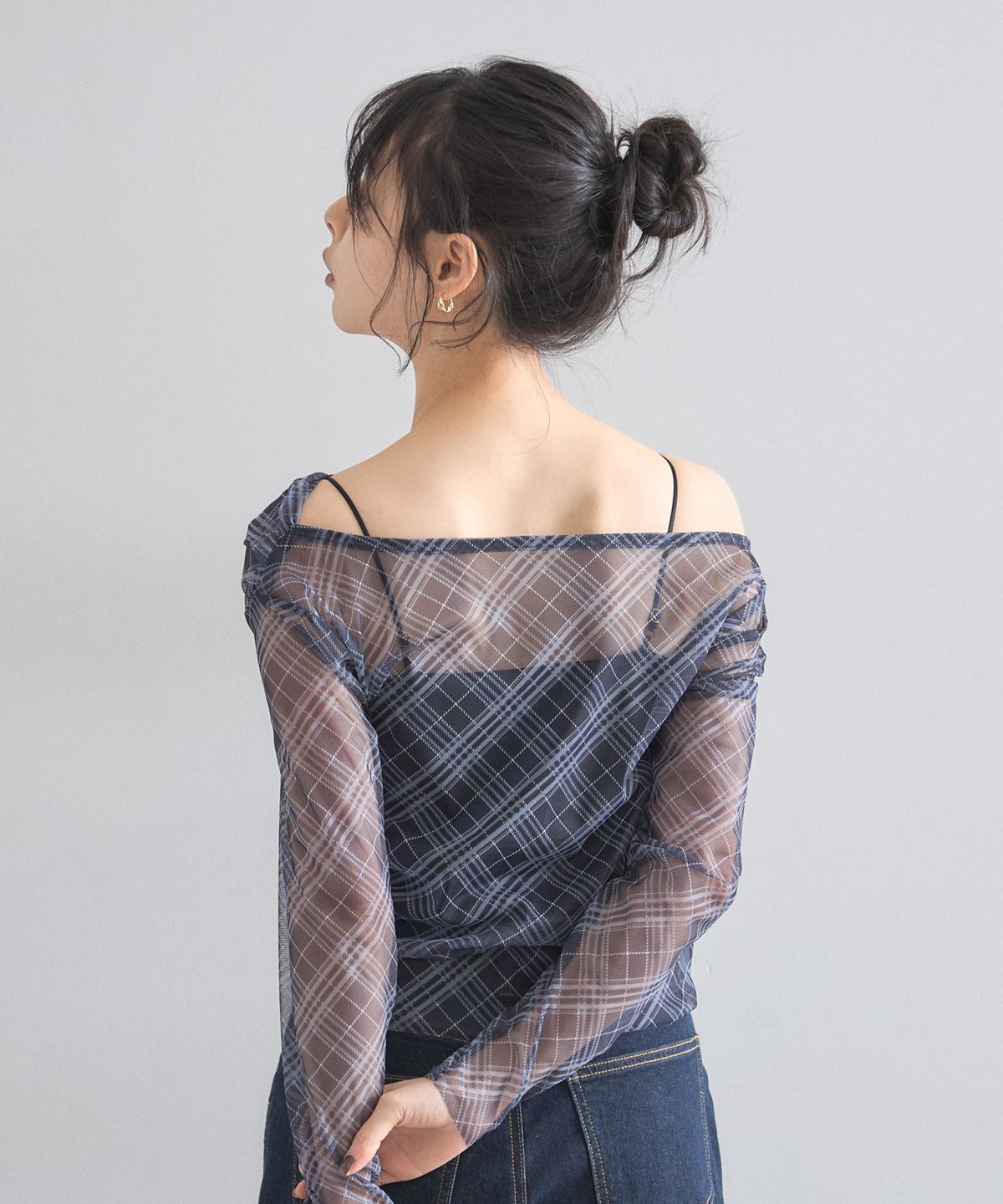 繊細なチェック柄と透け感のある素材を掛け合わせることで、重くなりがちなダークトーンも軽やかな印象に。