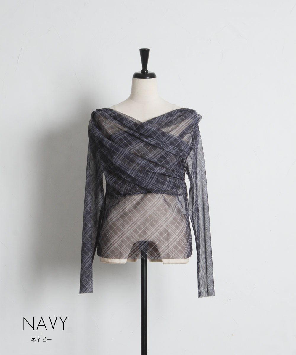 胸元で美しく交差するドレープデザインが目を引く、主役級のシアートップスです。