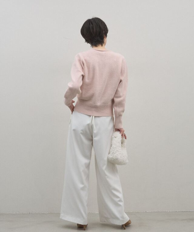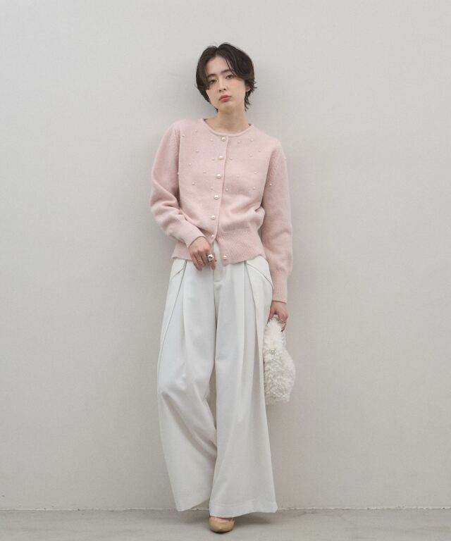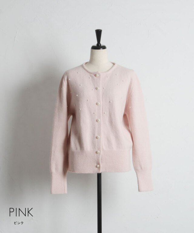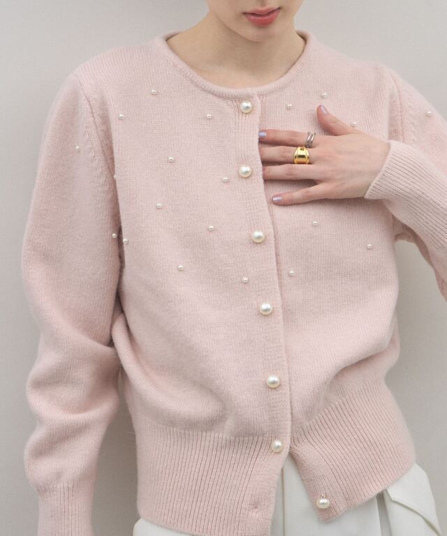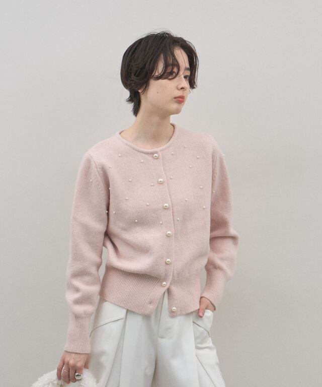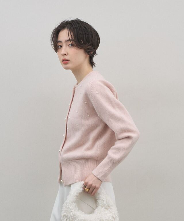 柔らかなベビーピンクの編み地に、大きさの異なるパールを贅沢に散りばめた、レディライクなカーディガン。フロントのパールボタンがアクセントとなり、顔周りをパッと明るく、華やかな印象に仕上げてくれます。
