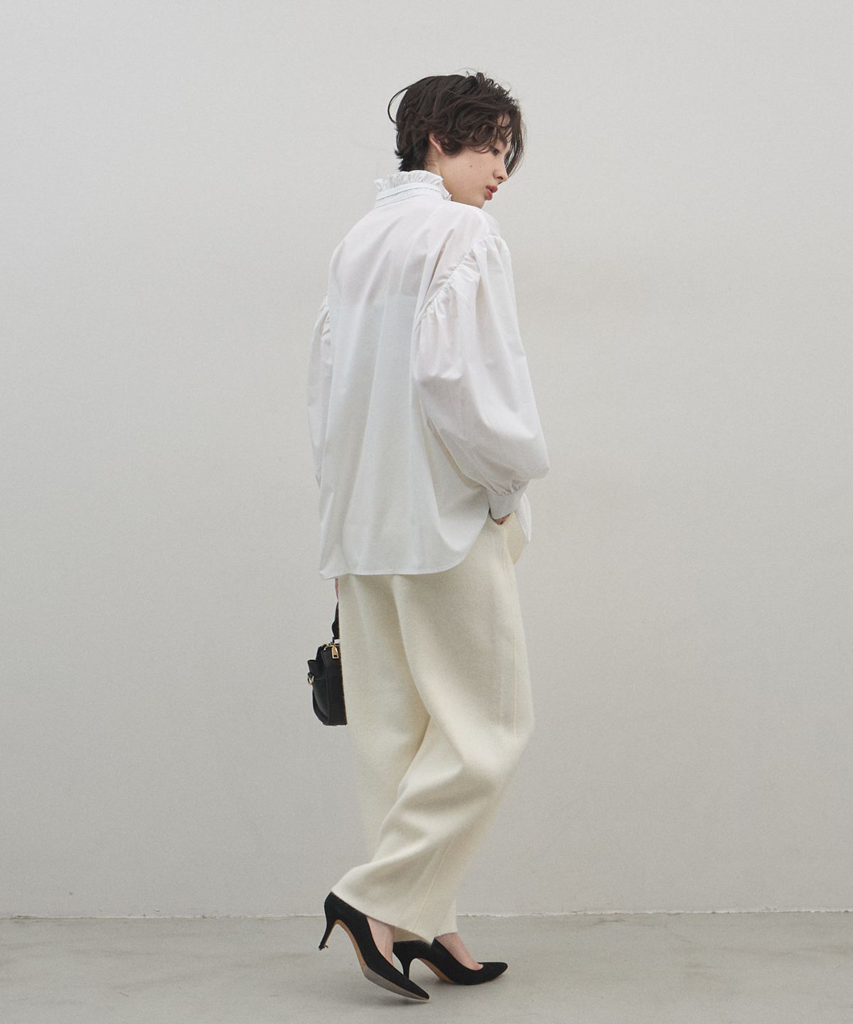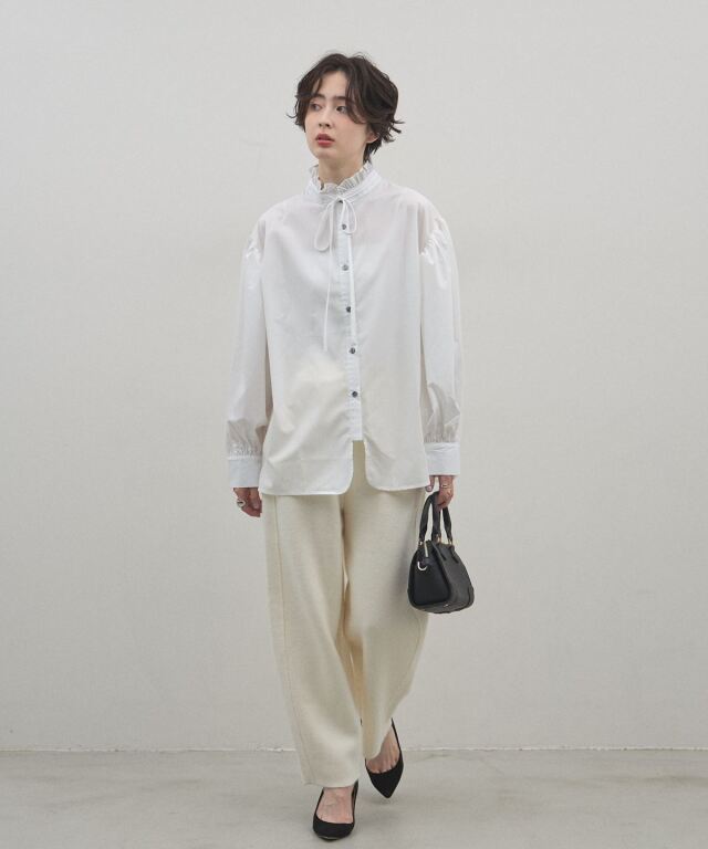 ウエストのドローストリングが程よいカジュアルさを添え、単品使いでも着回し力は抜群。柔らかな色味は、シャツやパンプスと合わせればクリーンなきれいめスタイルに、スニーカーなら上質なワンマイルウェアへと表情を変えます。シーンを問わず、一日中快適かつ品良く過ごせるタイムレスな逸品です。