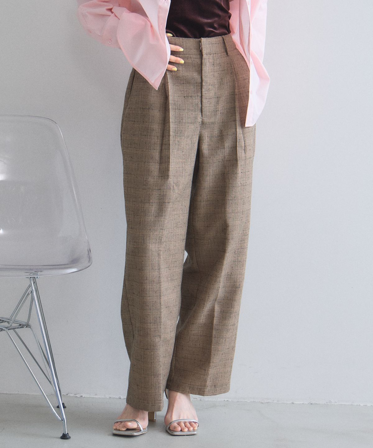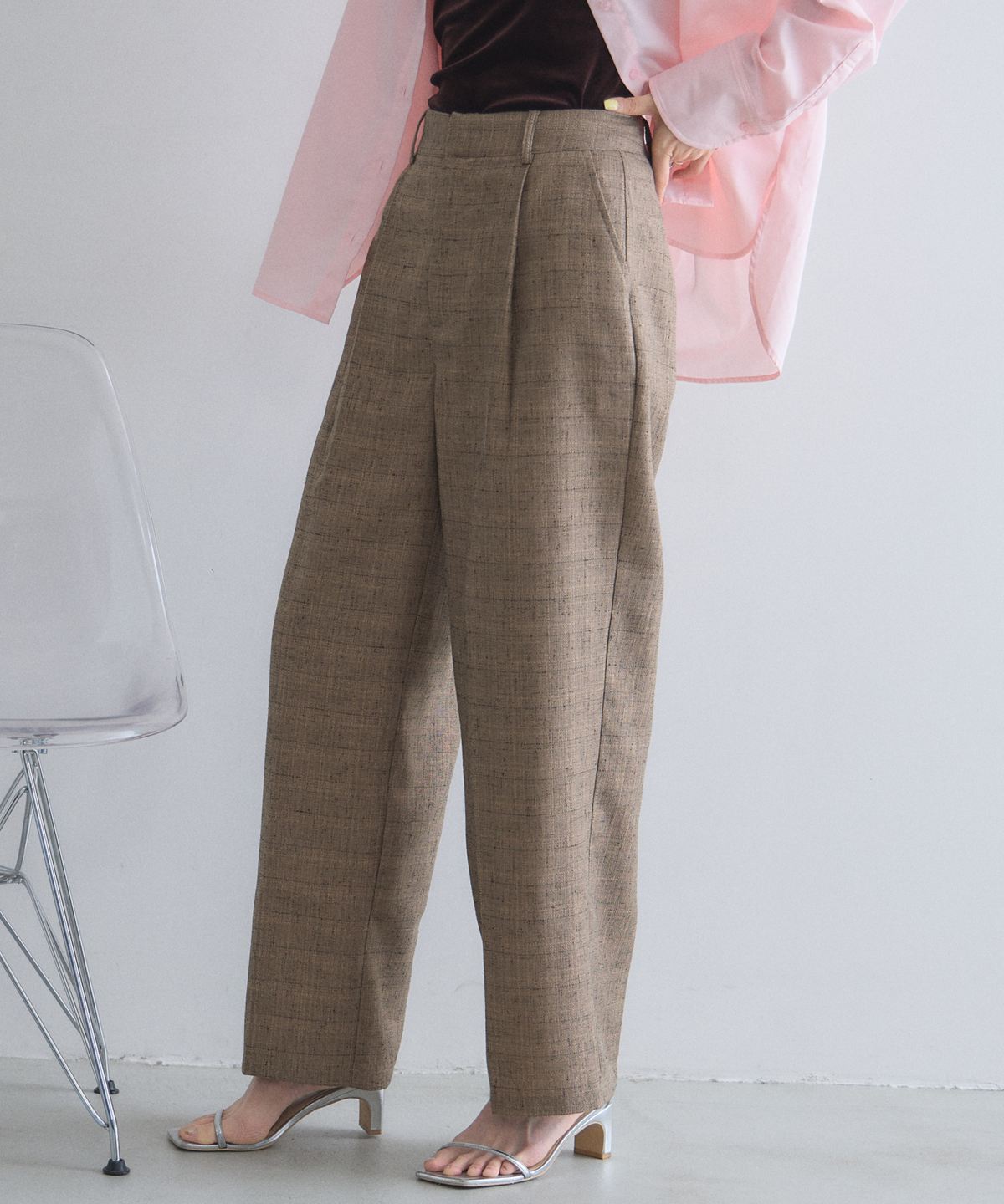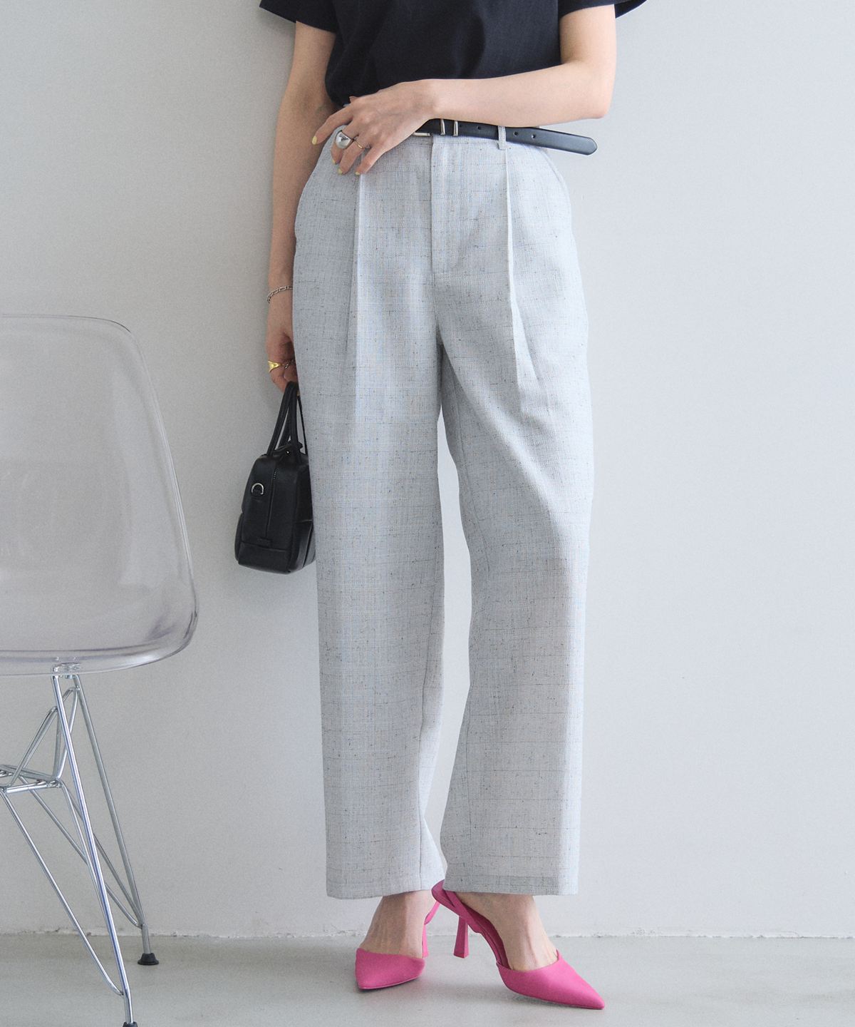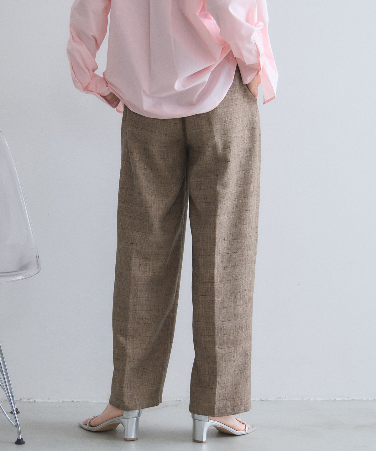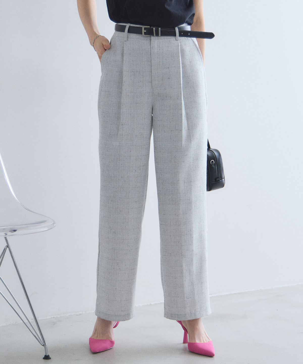 洗練されたライトツイードが、いつものパンツスタイルを格上げする大人のワイドパンツ。