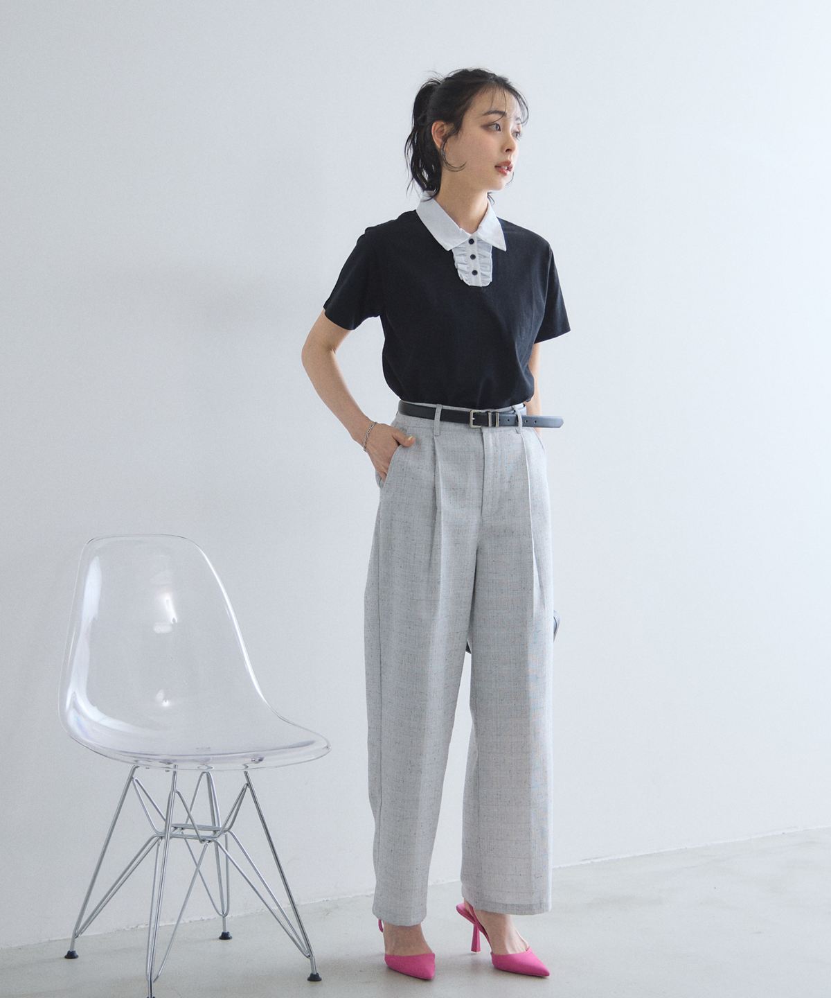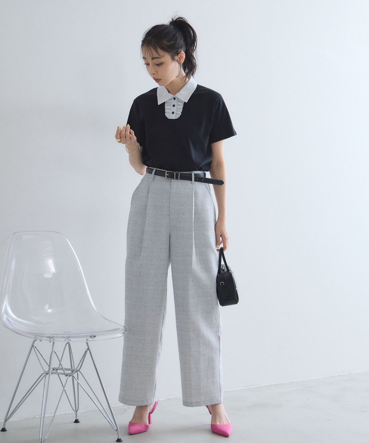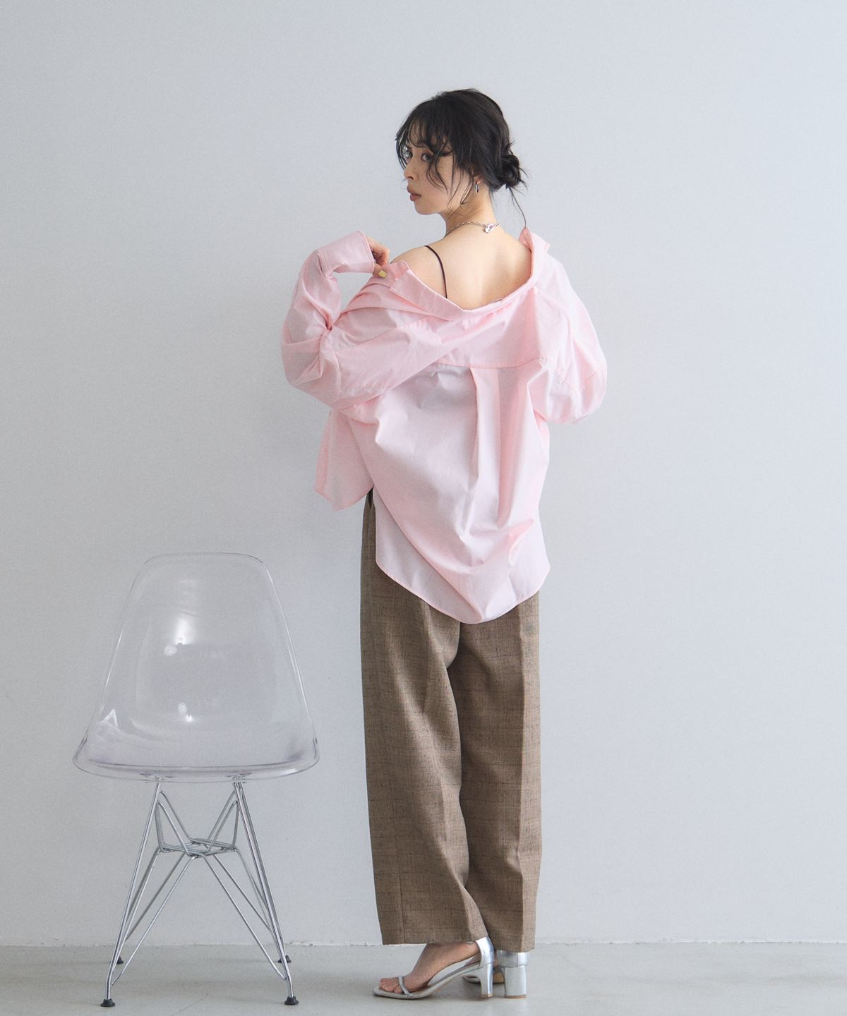シンプルなトップスを合わせるだけで、ニュアンスのある洗練された着こなしが完成します。