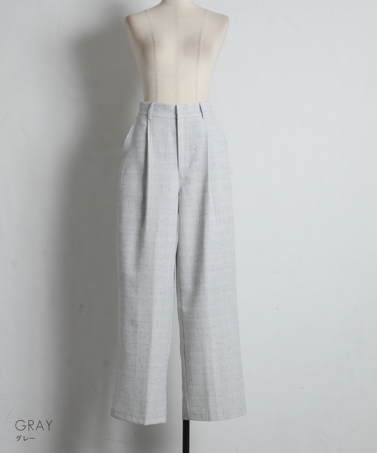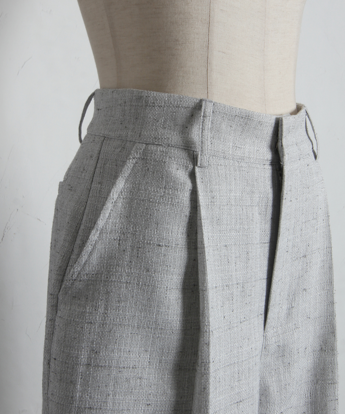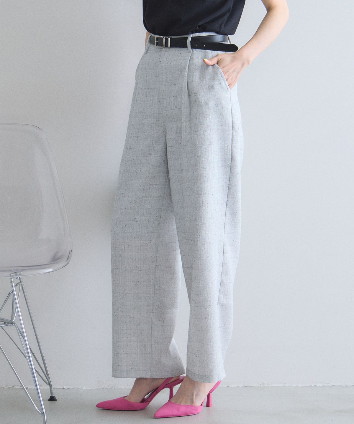 深めに入ったタックが腰回りをすっきりと見せつつ、